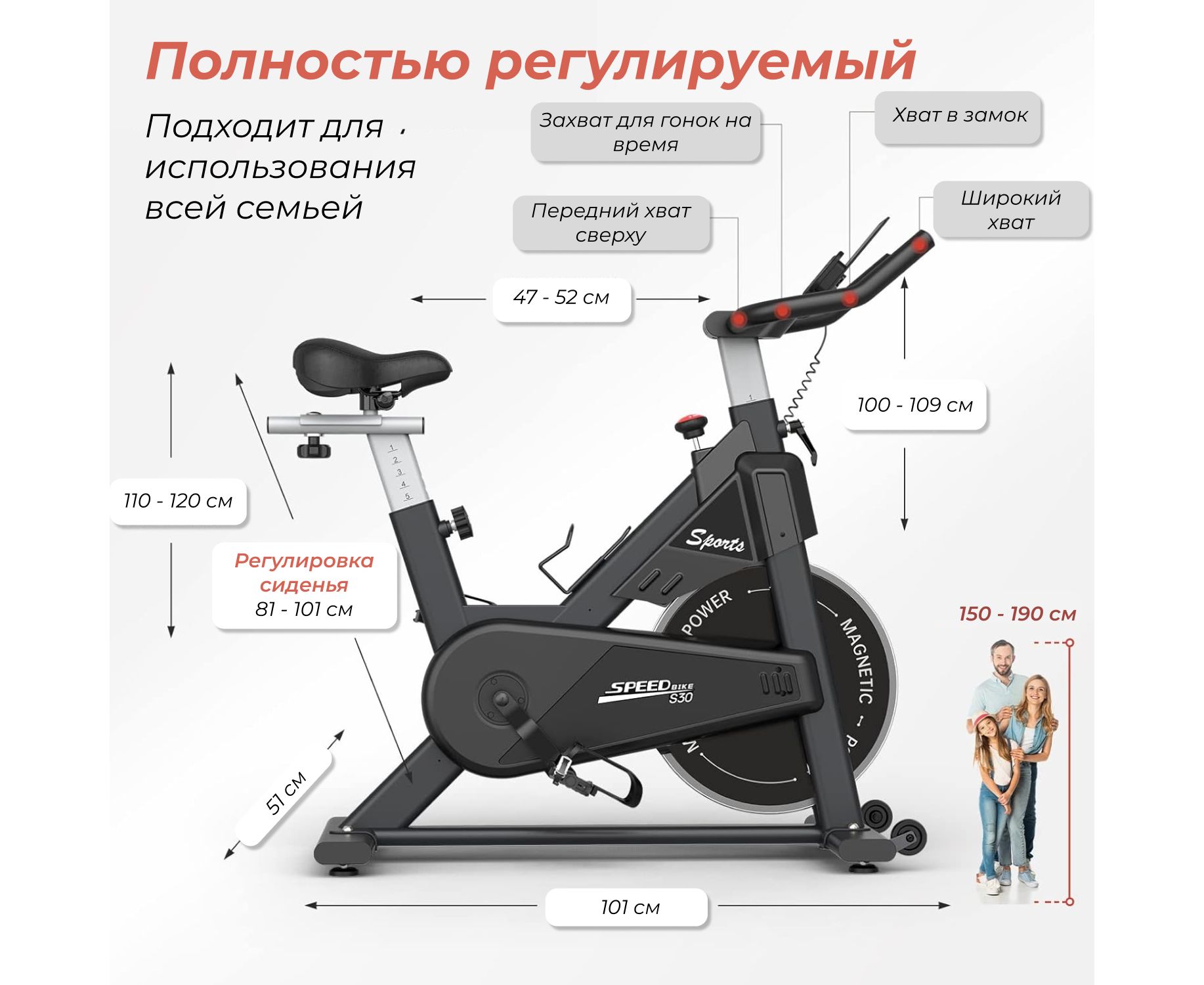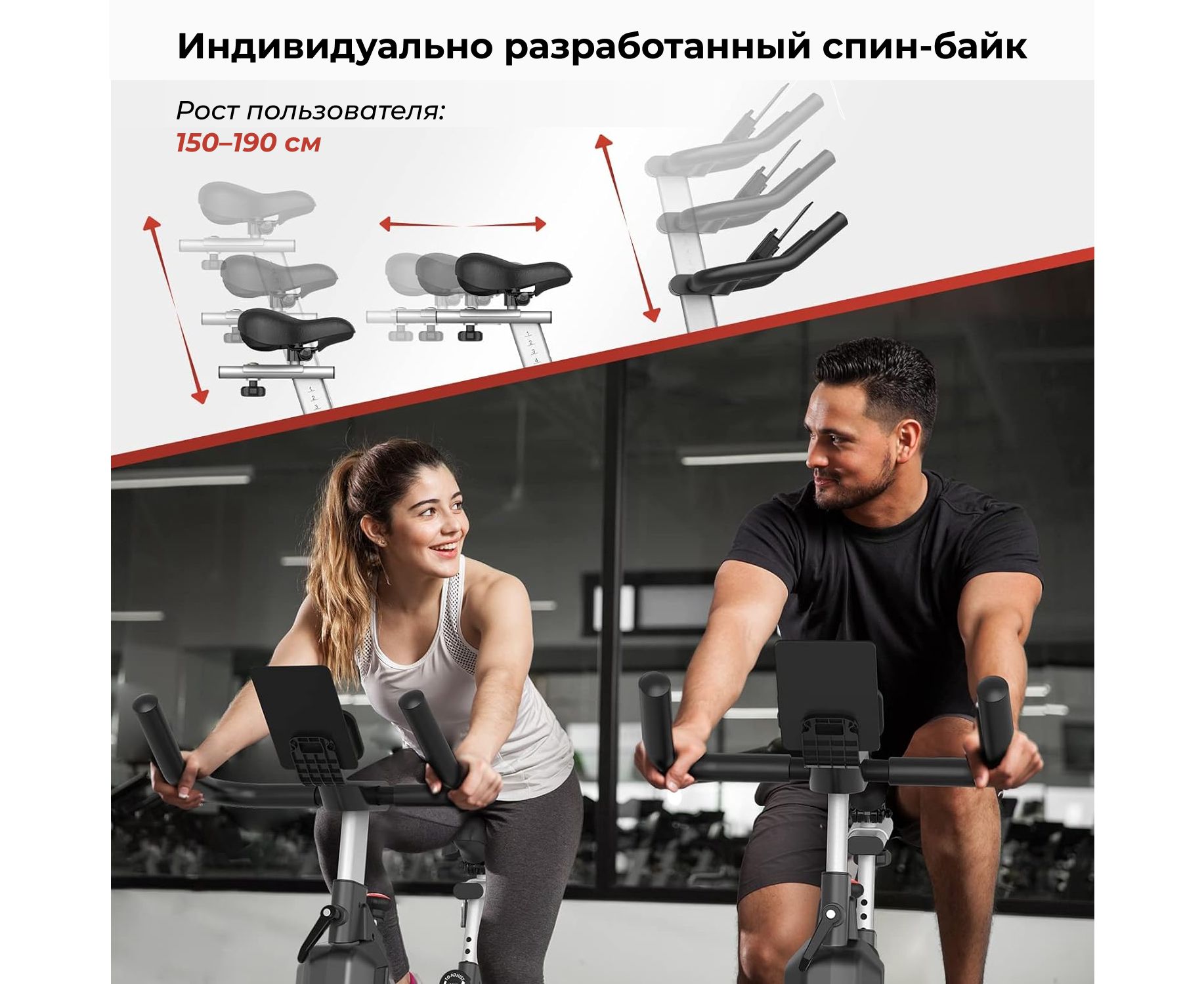 Сиденье велотренажера регулируется по высоте в диапазоне от 80,5 до 100,5 см — предусмотрено 12 фиксированных уровней, что позволяет подобрать оптимальное положение как для низких, так и для высоких пользователей. Помимо вертикальной регулировки, сиденье можно сдвигать вперёд или назад по горизонтали, что особенно важно для правильной посадки и снижения нагрузки на суставы.