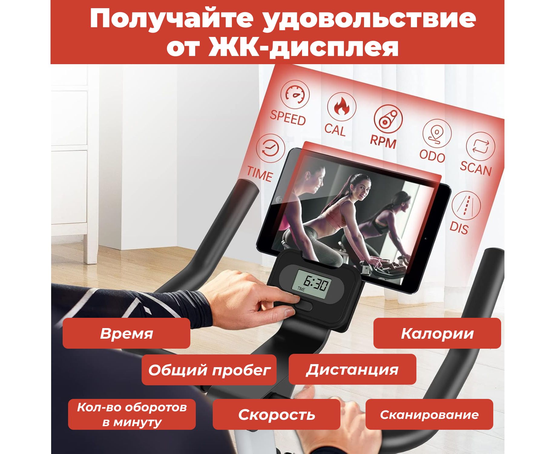 Велотренажер имеет монохромный LCD-дисплеей, который отображает ключевые параметры тренировки: время, калории, дистанцию, скорость, сканирование и пульс. Это позволит отслеживать прогресс и корректировать нагрузку в реальном времени. Для работы консоли используются батарейки типа AAA (2 шт), которые входят в комплект - удобно и не требует подключения к сети.