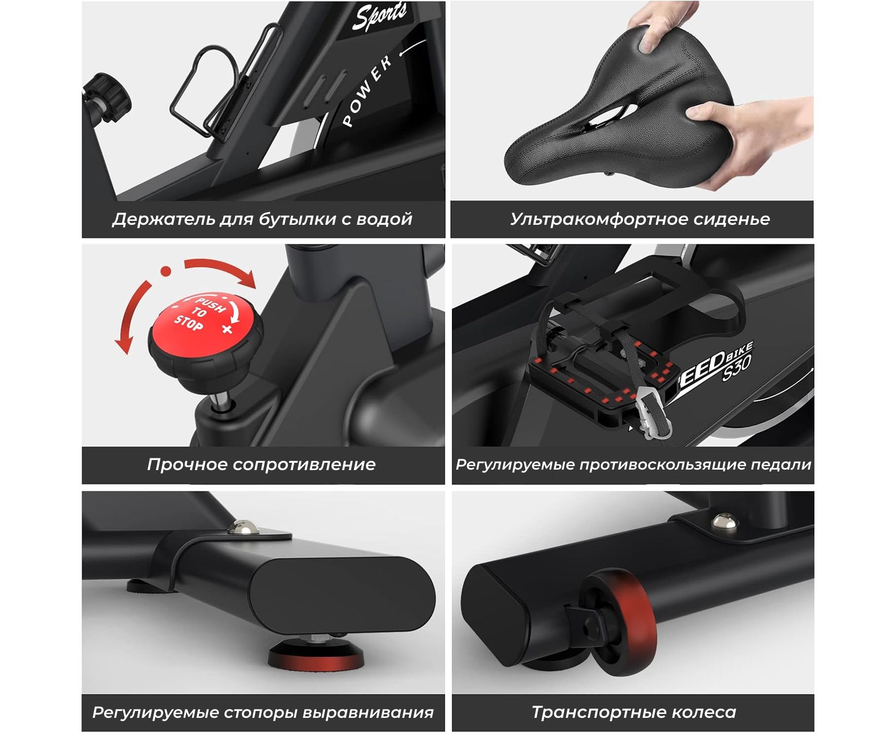 Компенсаторы неровности пола обеспечивают устойчивость даже при интенсивных нагрузках, а транспортировочные ролики делают перемещение тренажёра лёгким и удобным. Подставка для планшета позволяет смотреть видео или слушать музыку во время тренировки, а держатель для бутылки обеспечивает удобный доступ к воде.