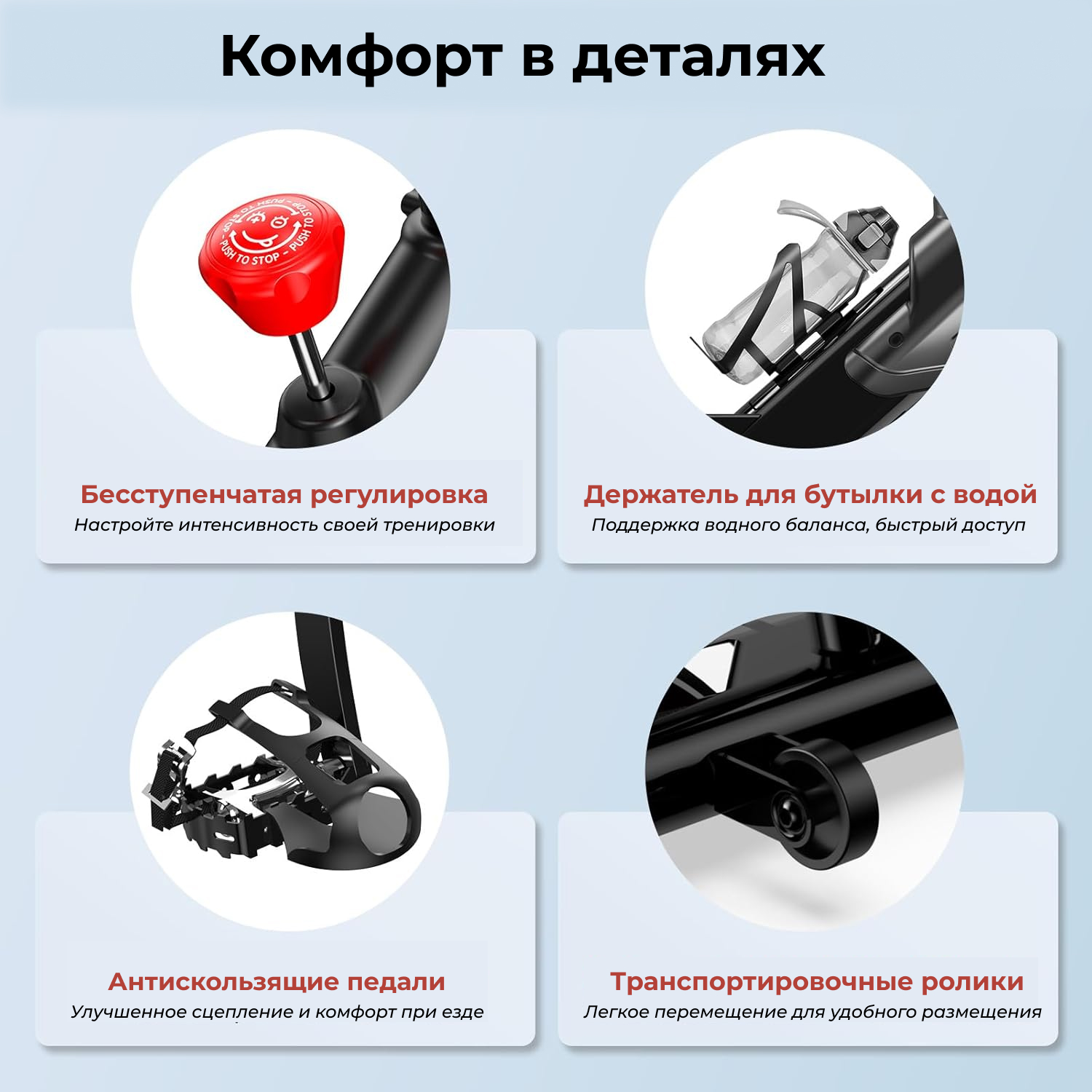 Компенсаторы неровности пола обеспечивают устойчивость даже при интенсивных нагрузках, а транспортировочные ролики делают перемещение тренажёра лёгким и удобным. Подставка для планшета позволяет смотреть видео или слушать музыку во время тренировки, а держатель для бутылки обеспечивает удобный доступ к воде.