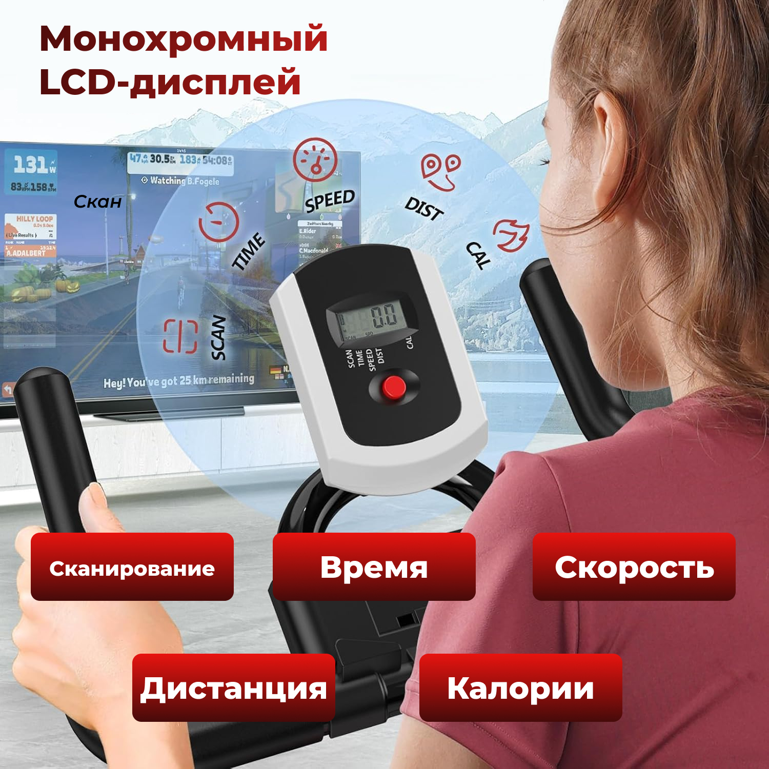 Велотренажер имеет монохромный LCD-дисплеей, который отображает ключевые параметры тренировки: время, калории, дистанцию, скорость и сканирование. Это позволит отслеживать прогресс и корректировать нагрузку в реальном времени. Для работы консоли используется 1 батарейка типа ААА— простое и удобное решение, не требующее подключения к сети. Батарейки в комплект входят.
