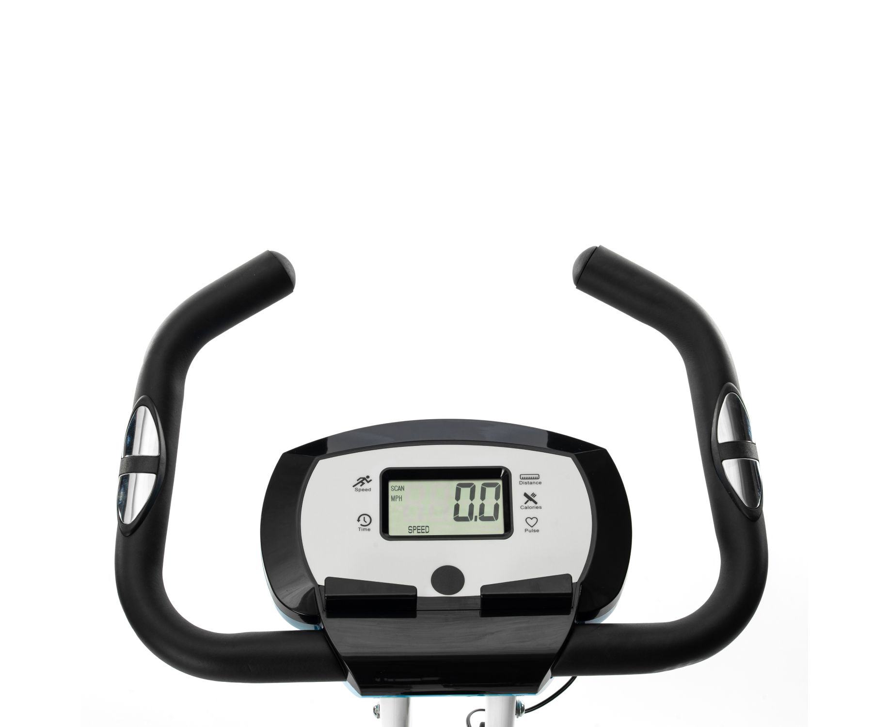 Тренажёр оснащён монохромным LCD-дисплеем, который отображает все основные параметры тренировки: время, дистанцию, скорость, калории и пульс. Измерение пульса осуществляется с помощью сенсорных датчиков, встроенных в поручни — это позволяет контролировать интенсивность нагрузки и корректировать тренировку в зависимости от уровня подготовки. Дисплей работает от двух батареек типа AAA (в комплект не входят). Дополнительно предусмотрена подставка под планшет, чтобы можно было смотреть видео или слушать музыку во время занятия.