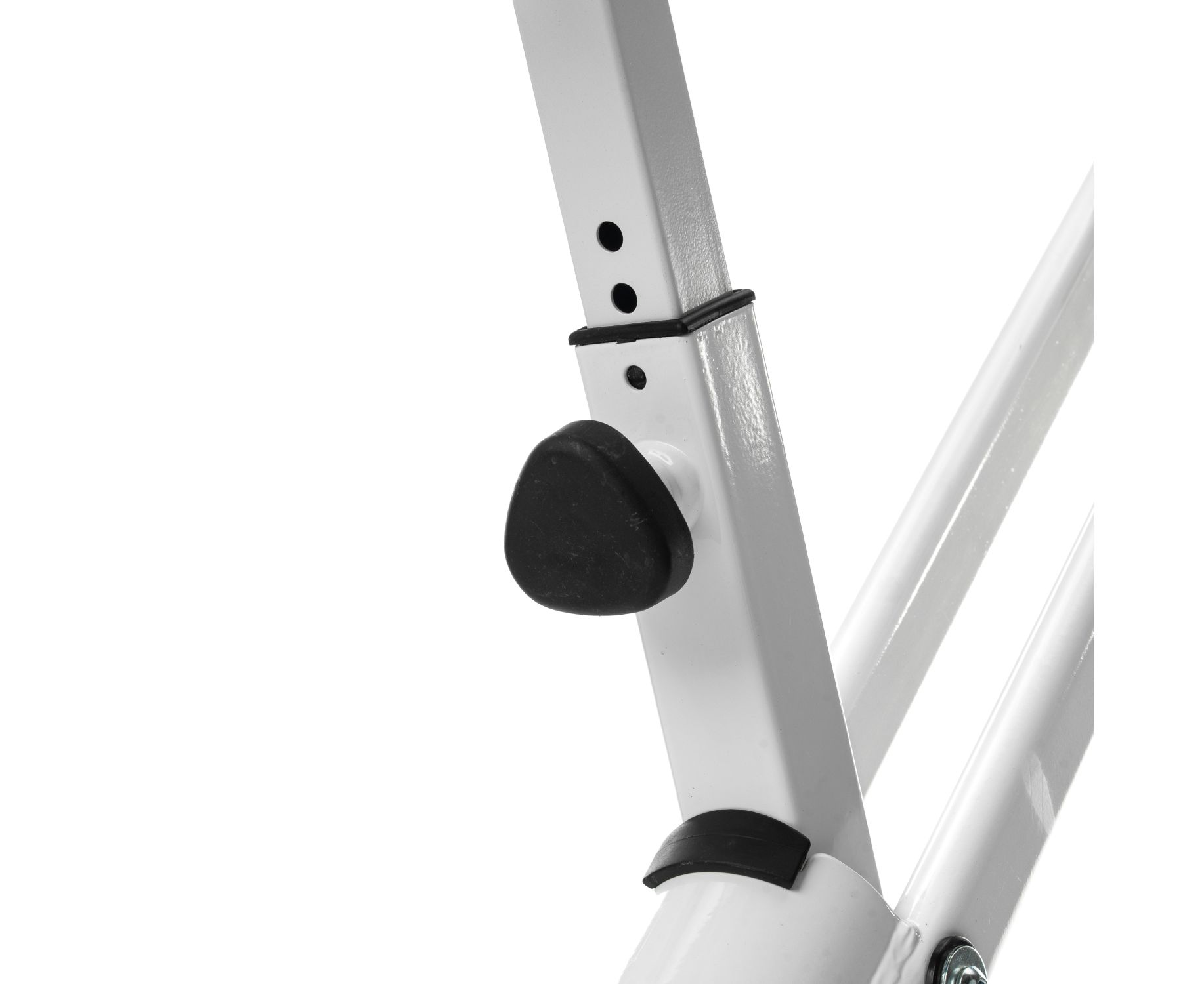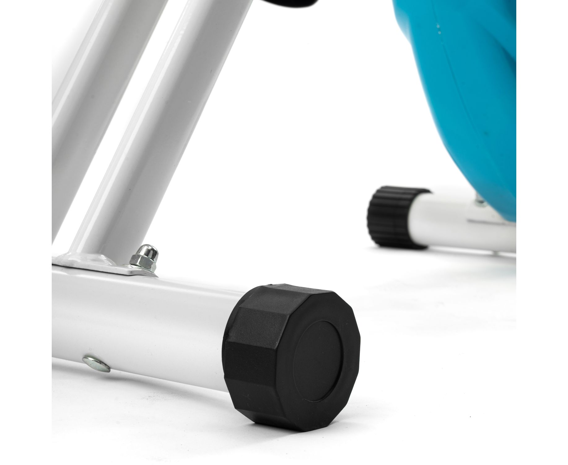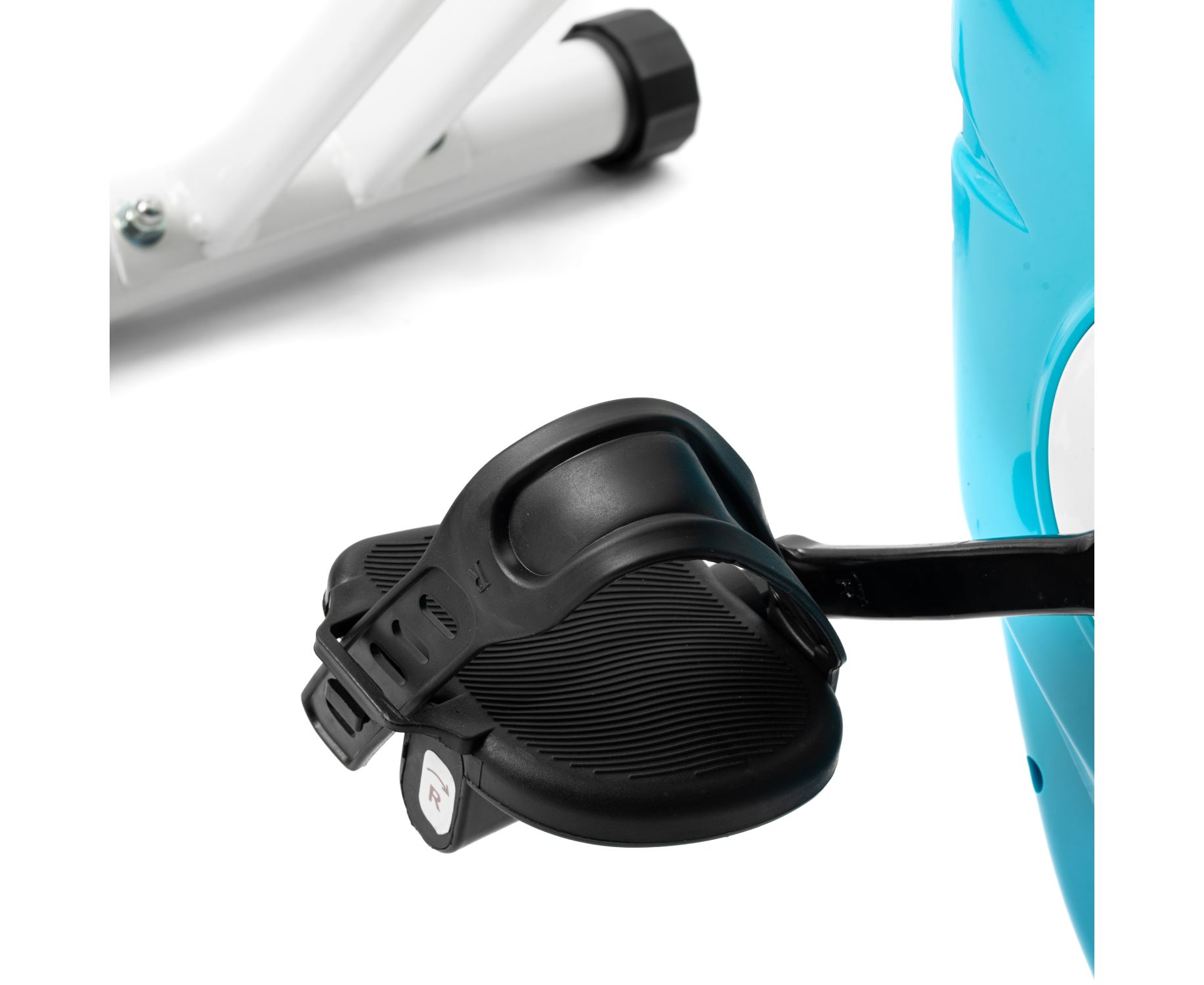 Педали оснащены фиксирующими ремнями, обеспечивая надёжную постановку стопы и безопасность во время занятий. Складная конструкция позволяет компактно хранить тренажёр после использования — модель не занимает много места и отлично подходит даже для небольших помещений. Для удобного перемещения предусмотрены транспортировочные ролики.