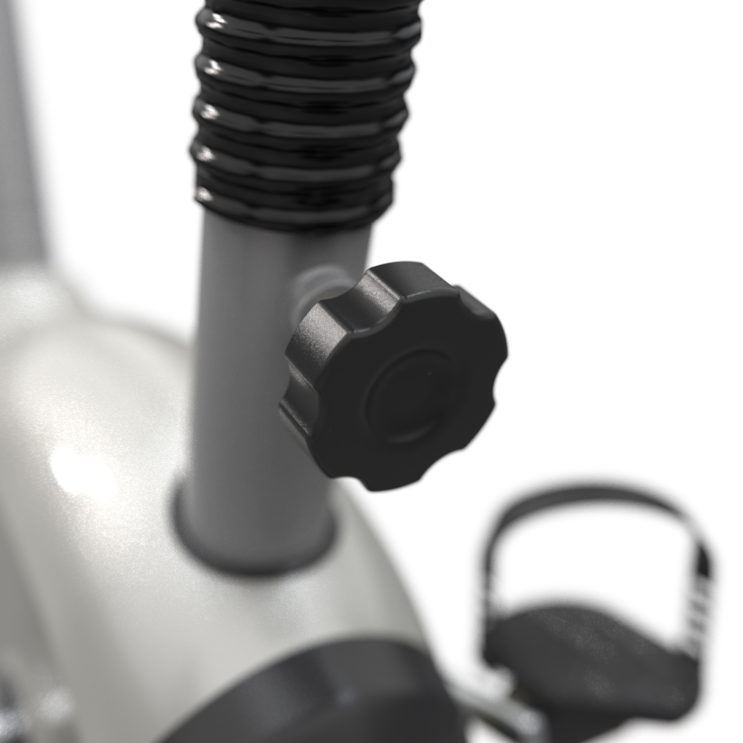 Эргономичное сиденье регулируется по вертикали, благодаря чему тренажер подойдет людям с ростом до 190 см. Педали с фиксирующими ремнями и компенсаторы неровностей пола обеспечивают комфорт и безопасность во время тренировки. Несмотря на отсутствие транспортировочных роликов, устройство компактно и не создает сложностей при перемещении.