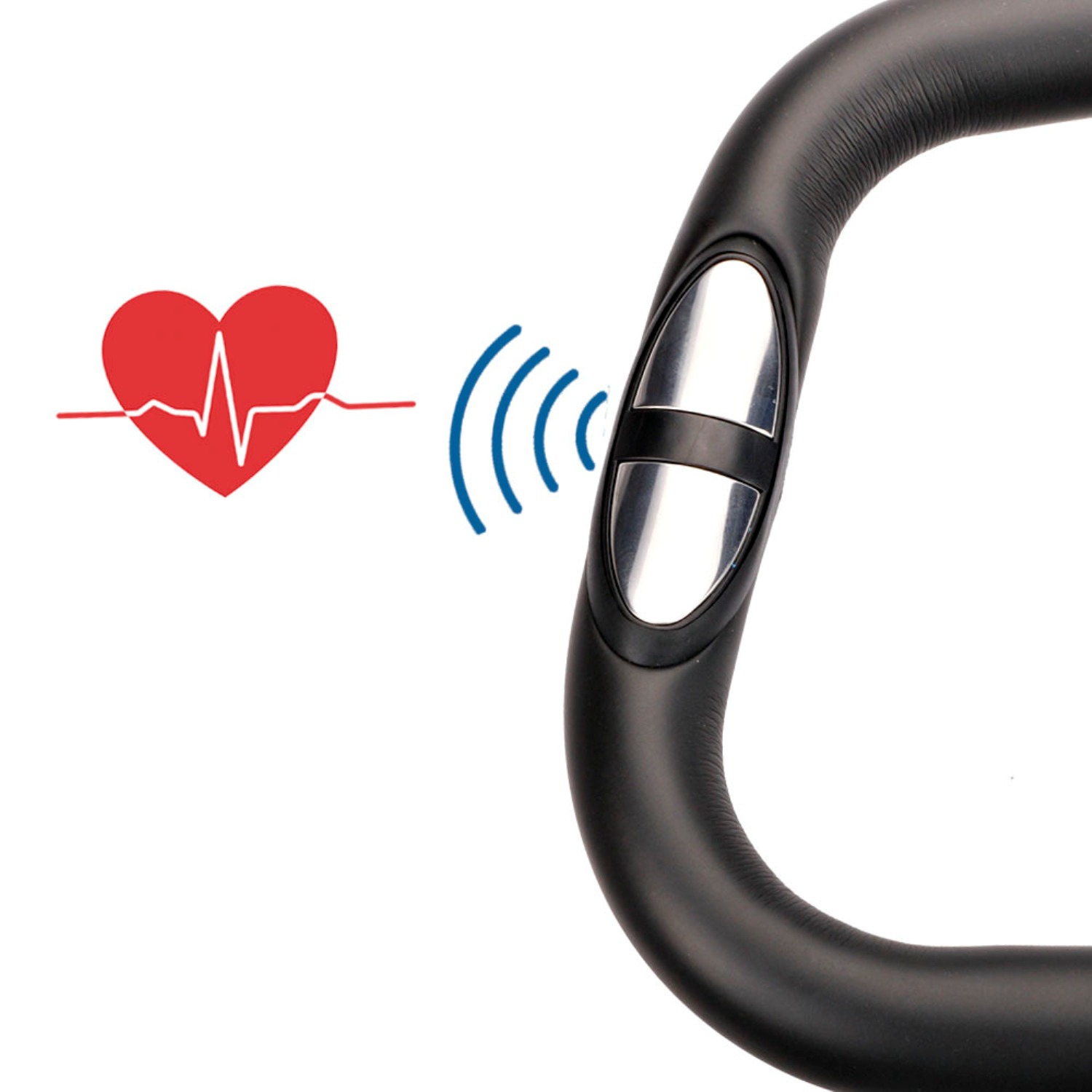Сенсорные датчики пульса расположены на поручнях. Монохромный дисплей показывает: время, расстояние, скорость, калории и пульс. На консоли расположен держатель для планшета.