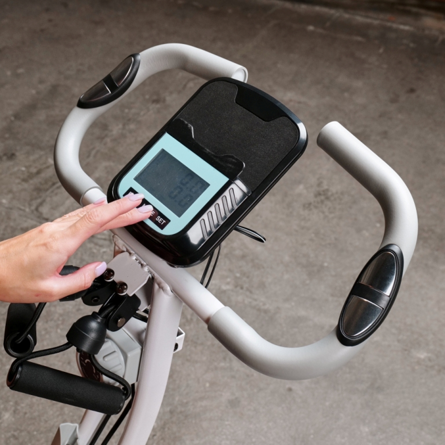 На дисплее велотренажера отображаются дистанция, время, сожженные калории, общий пробег и пульс. Пульс контролируется датчиками, расположенными на поручнях. Консоль велотренажера работает от батареек типа AAA.