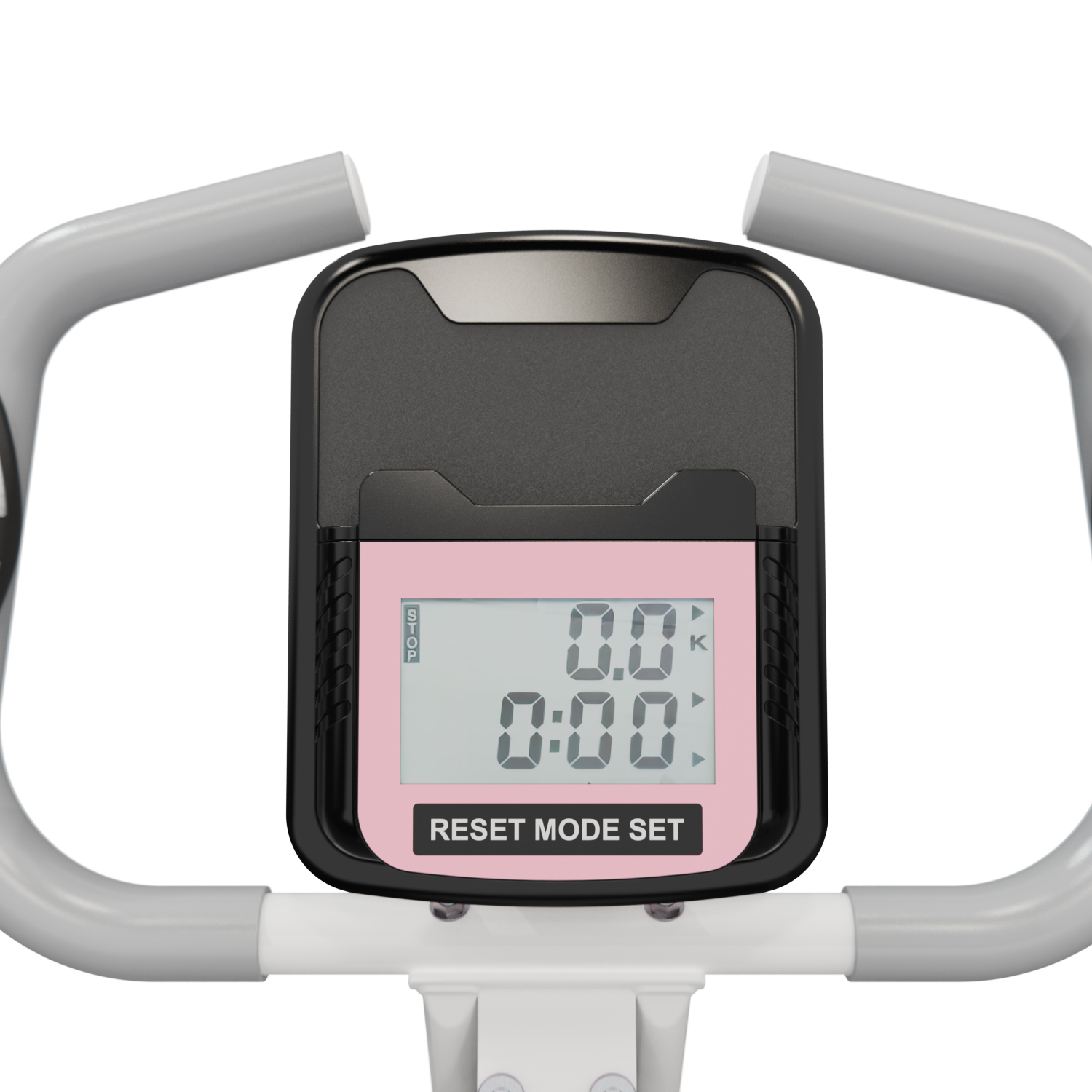 На дисплее велотренажера отображаются дистанция, время, сожженные калории, общий пробег и пульс. Пульс контролируется датчиками, расположенными на поручнях. Консоль велотренажера работает от батареек типа AAA.