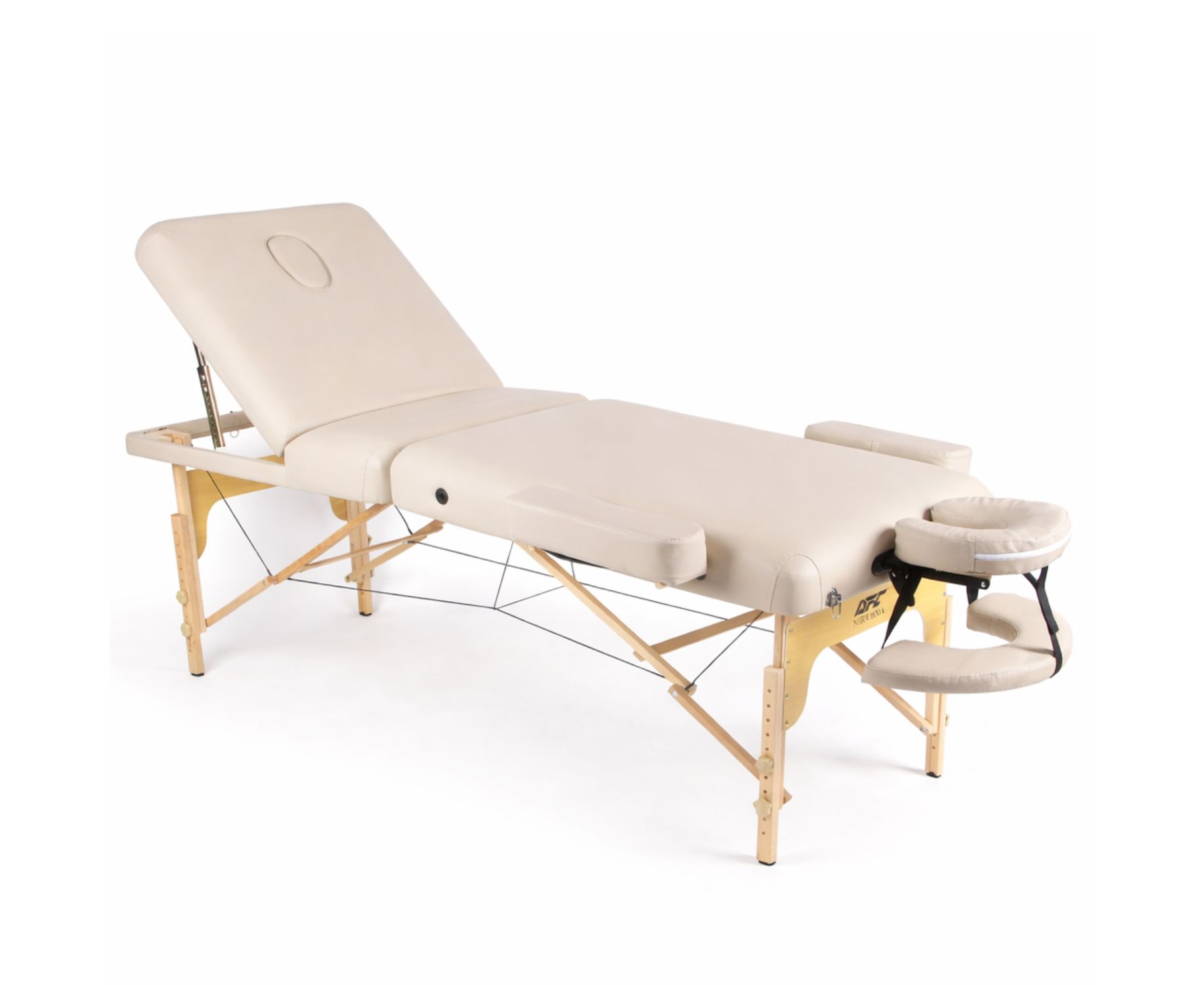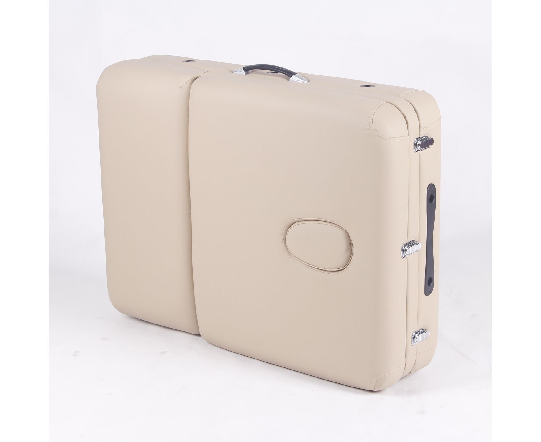 В комплект входит съемный алюминиевый подголовник с регулировкой высоты, который легко настраивается под рост клиента. Также предусмотрен люверс для лица с заглушкой, что делает стол удобным для классического массажа в положении лежа.