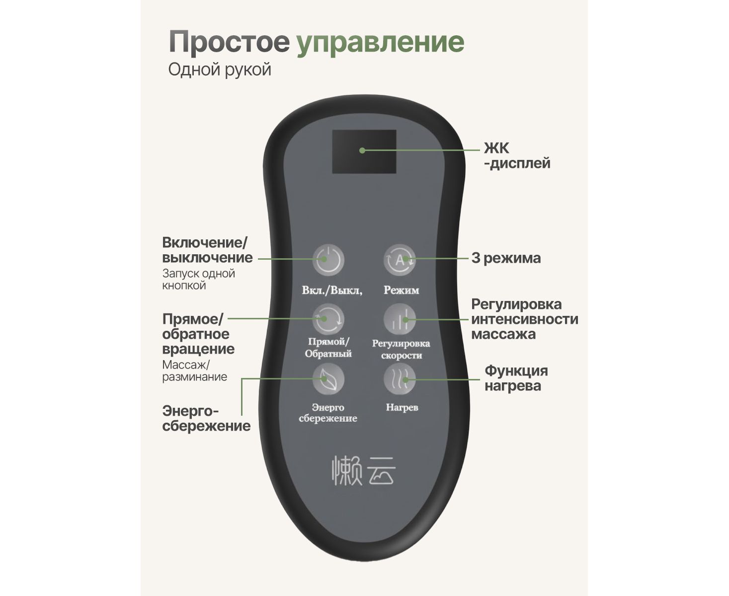 Устройство оборудовано удобной панелью управления с несколькими режимами работы и уровнями интенсивности, что позволяет индивидуально настроить процесс массажа под личные предпочтения. Также есть функция теплового компресса, устройство нагревается до 45°C, что усиливает кровообращение, способствует расслаблению мышц и улучшает общее самочувствие.