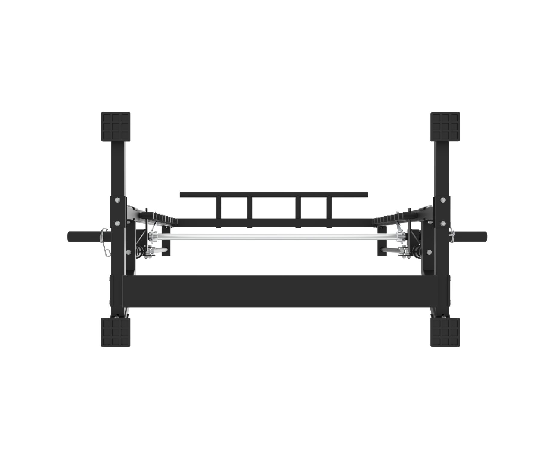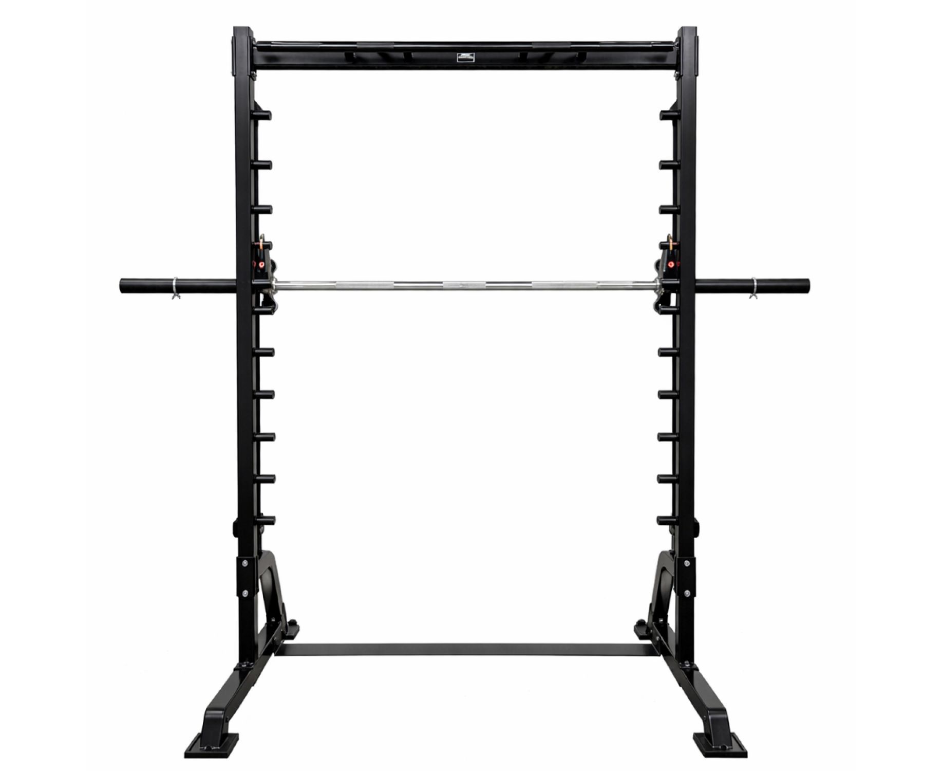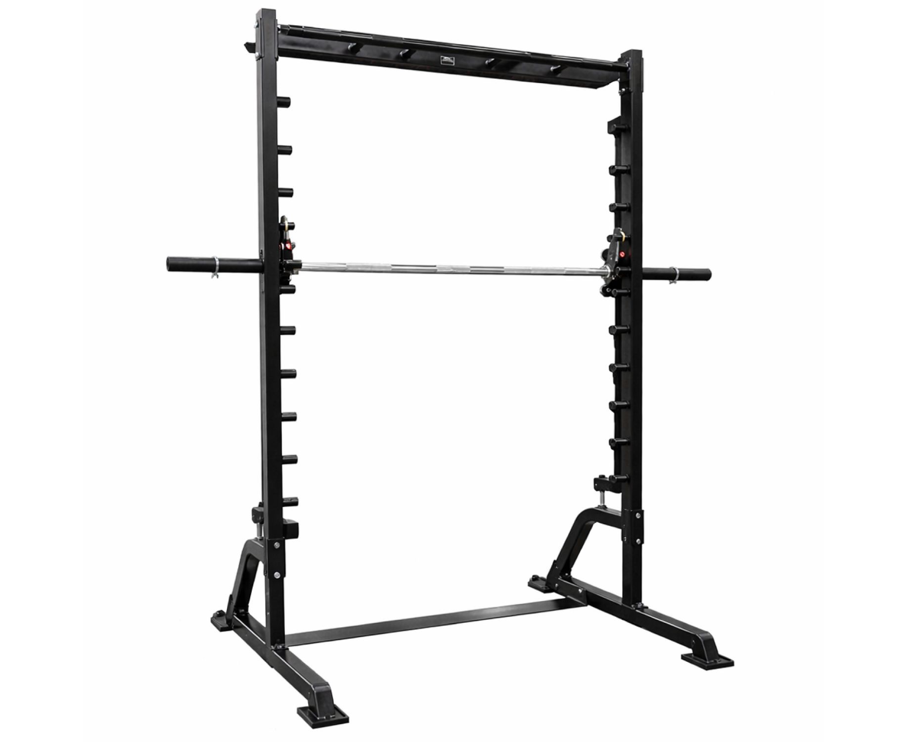Модель рассчитана на максимальный вес пользователя до 120 кг. Тренажёр оснащён грифом для приседаний, который перемещается по направляющим и фиксируется с помощью ограничительных кронштейнов безопасности, расположенных сверху вниз по всей высоте конструкции. Для надёжной фиксации весовых блинов предусмотрен пружинный зажим.