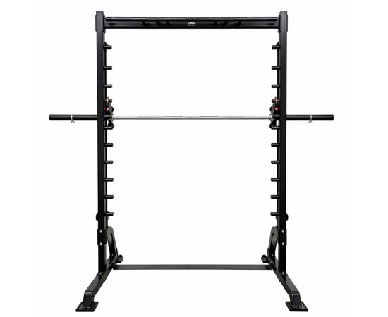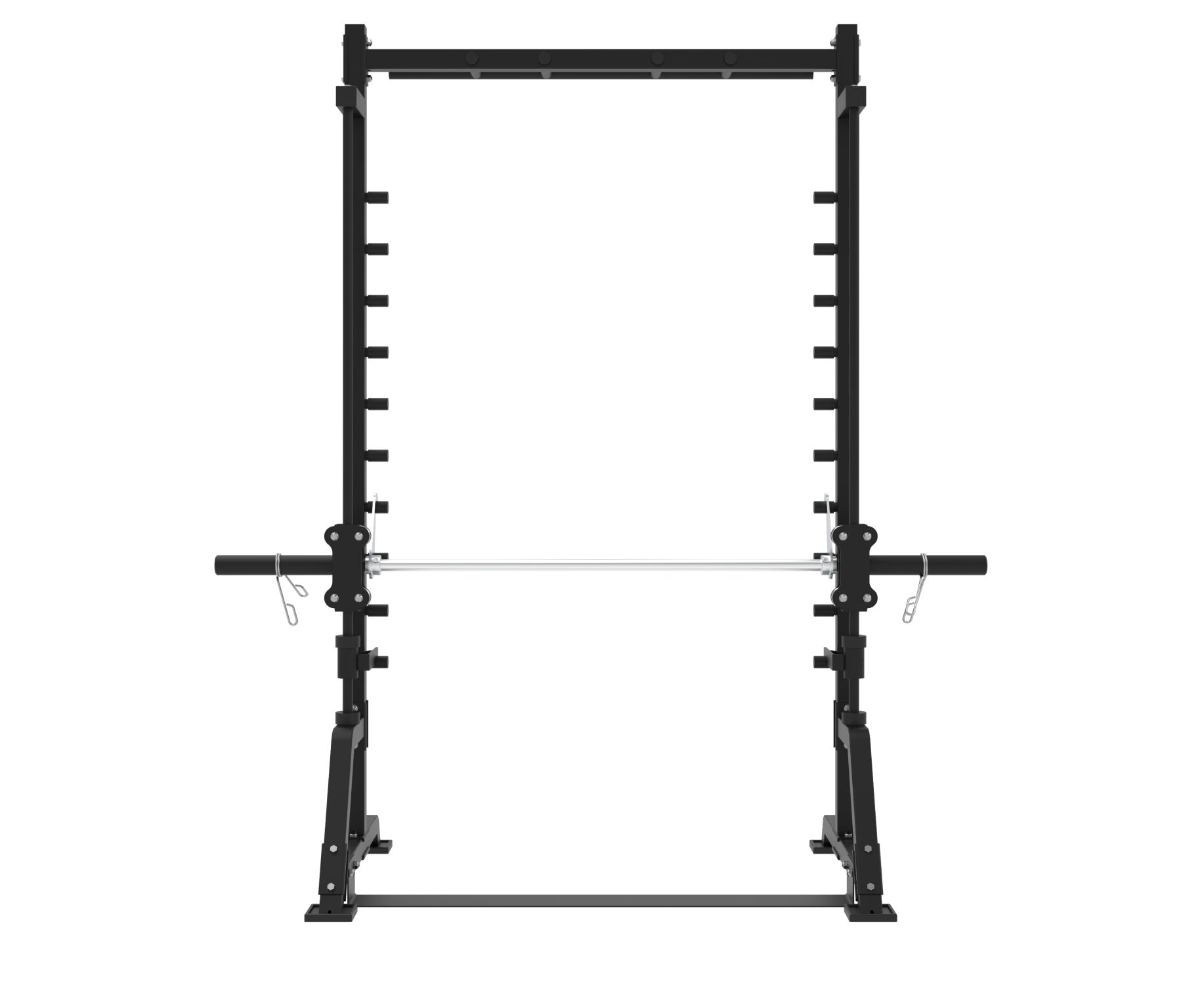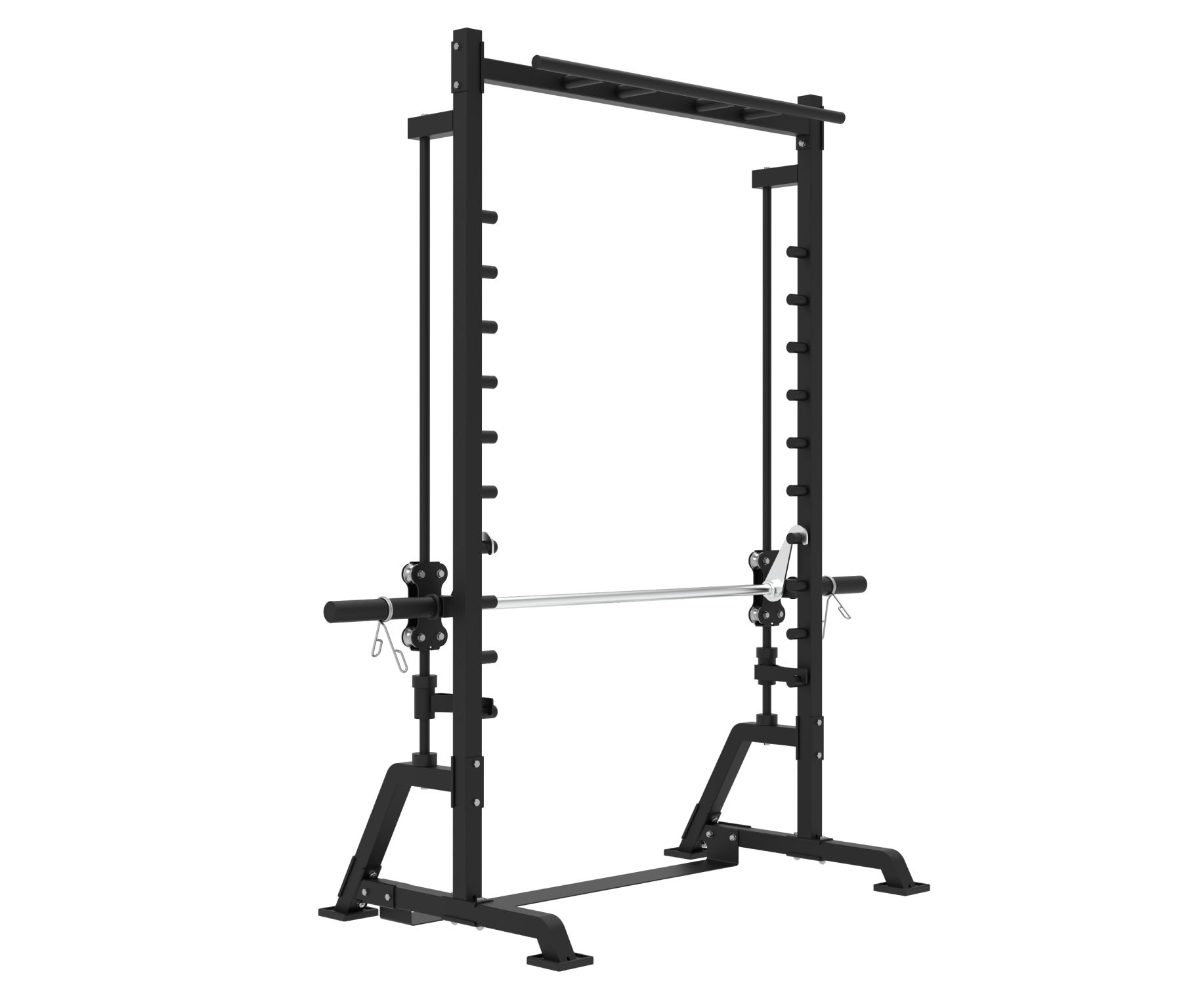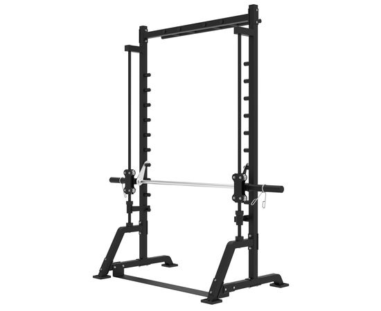 Машина Смита представляет собой силовой тренажёр с массивной стальной рамой чёрного цвета, предназначенный для безопасных и эффективных тренировок. Конструкция выполнена в виде устойчивой прямоугольной рамы с двумя основными вертикальными направляющими, по которым движется гриф, и множеством уровней фиксации по всей высоте стоек, что позволяет устанавливать стартовое и конечное положение штанги на разных уровнях.