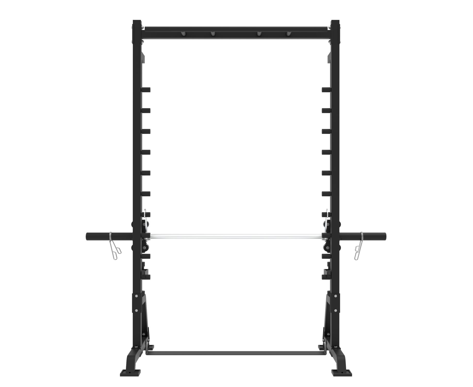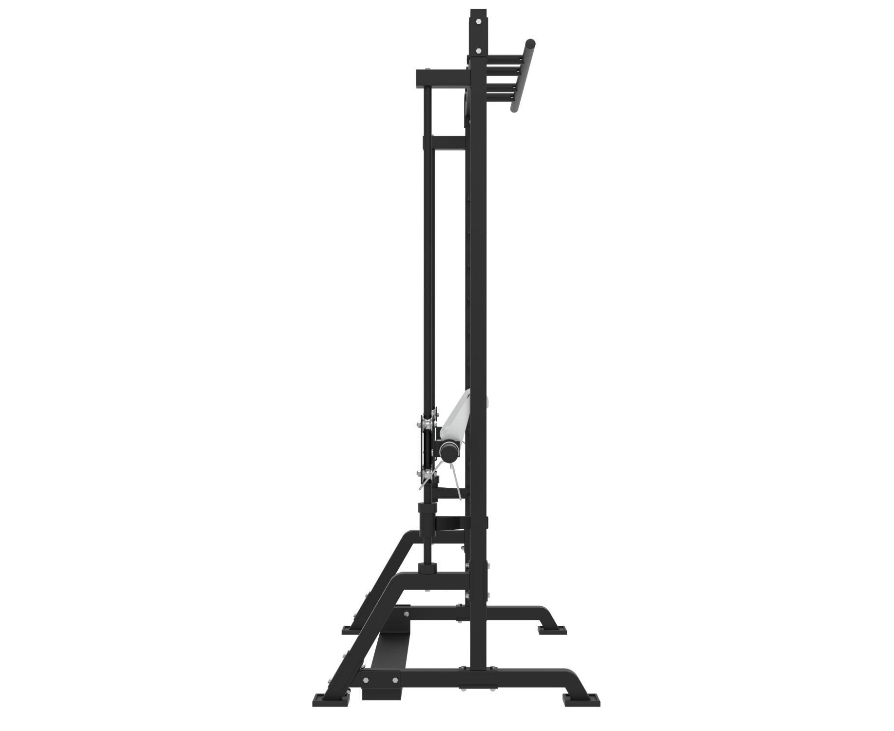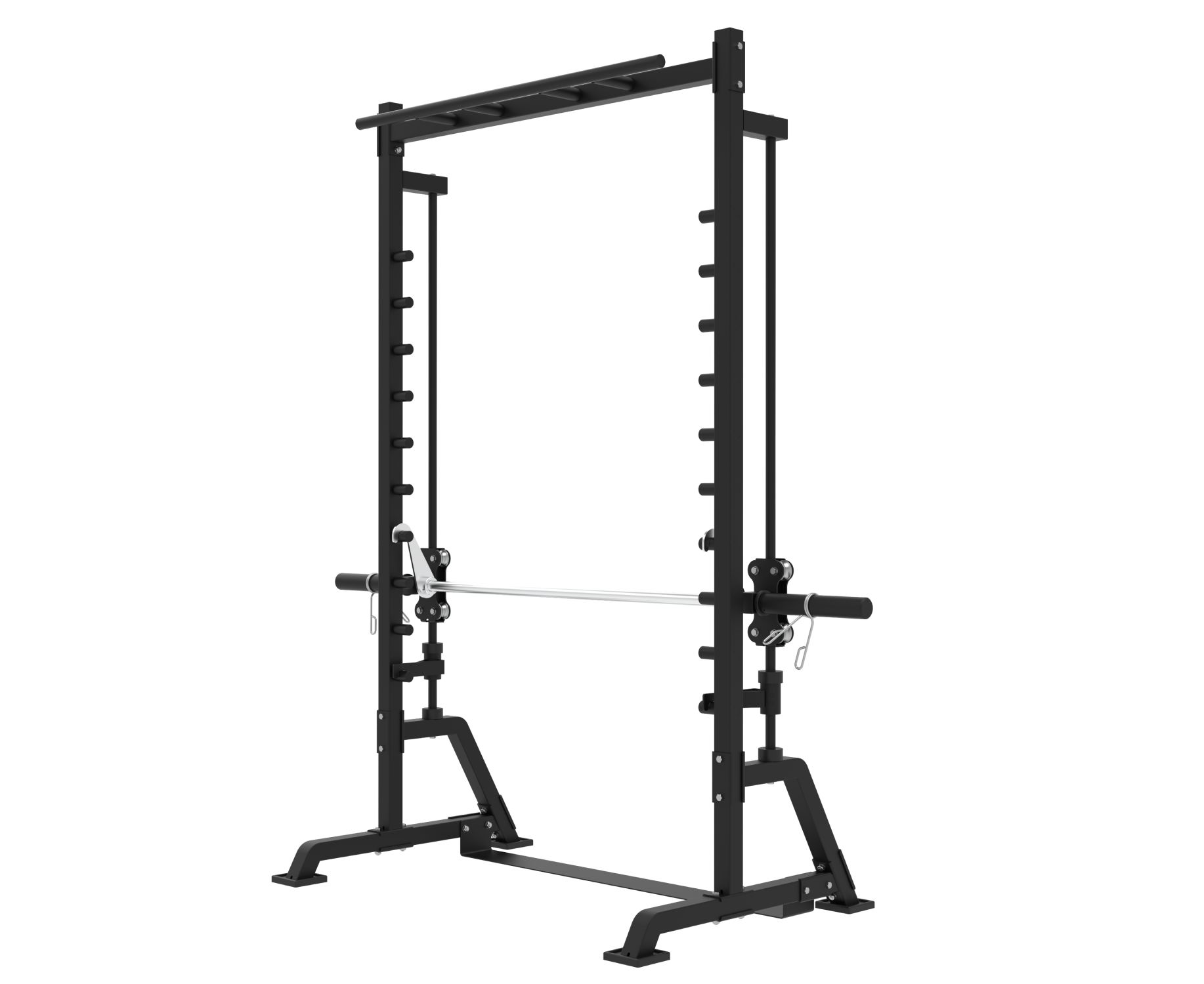 Машина Смита представляет собой силовой тренажёр с массивной стальной рамой чёрного цвета, предназначенный для безопасных и эффективных тренировок. Конструкция выполнена в виде устойчивой прямоугольной рамы с двумя основными вертикальными направляющими, по которым движется гриф, и множеством уровней фиксации по всей высоте стоек, что позволяет устанавливать стартовое и конечное положение штанги на разных уровнях.