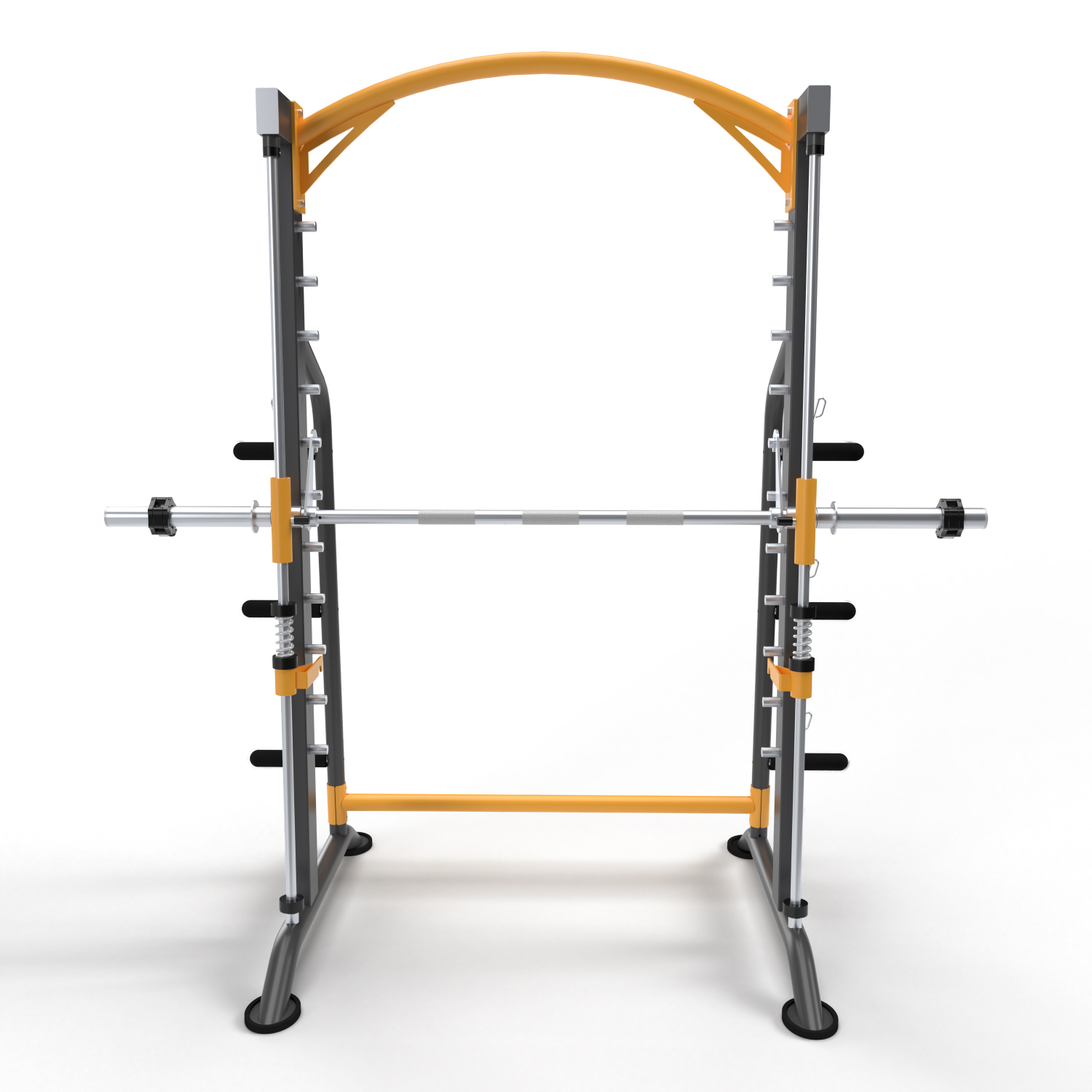 Хромированный гриф с замком lock-jaw с рифлёным покрытием регулируется в 11-ти положениях по высоте. Максимально допустимая нагрузка на него составляет 200 кг. Гриф двигается по чёткой траектории, благодаря чему вместо контроля над положением тела, вы сможете сосредоточиться на технике выполнения.