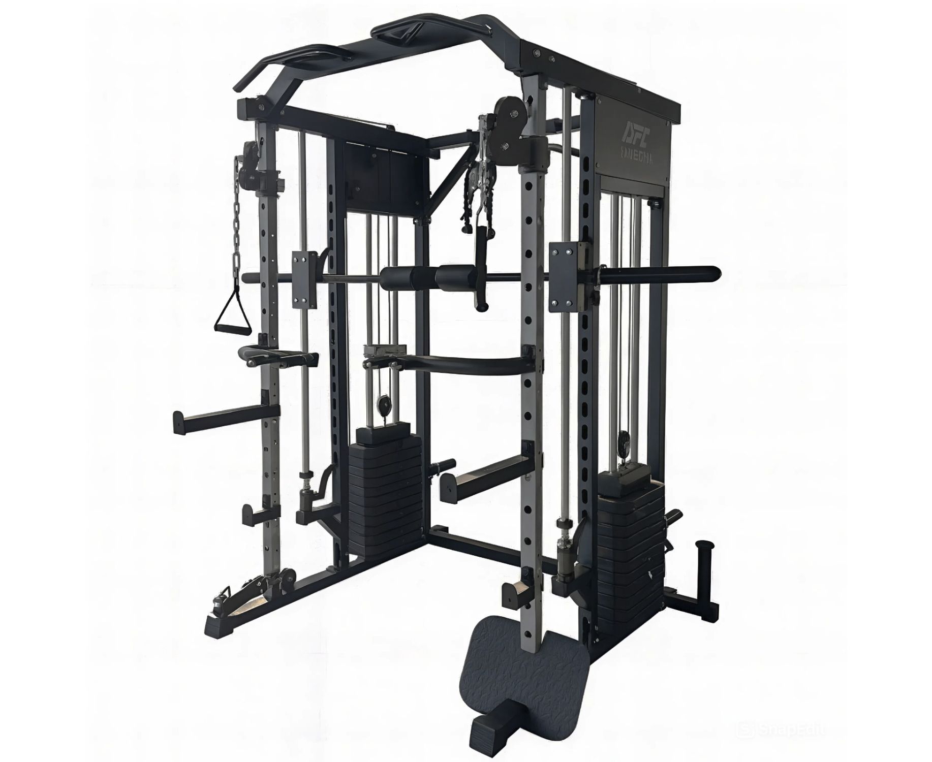 Машина Смита DFC D8201 — это полноценный домашний тренажёрный комплекс, который сочетает в себе возможности силовой рамы, модульных рукоятей и блоковых систем.
