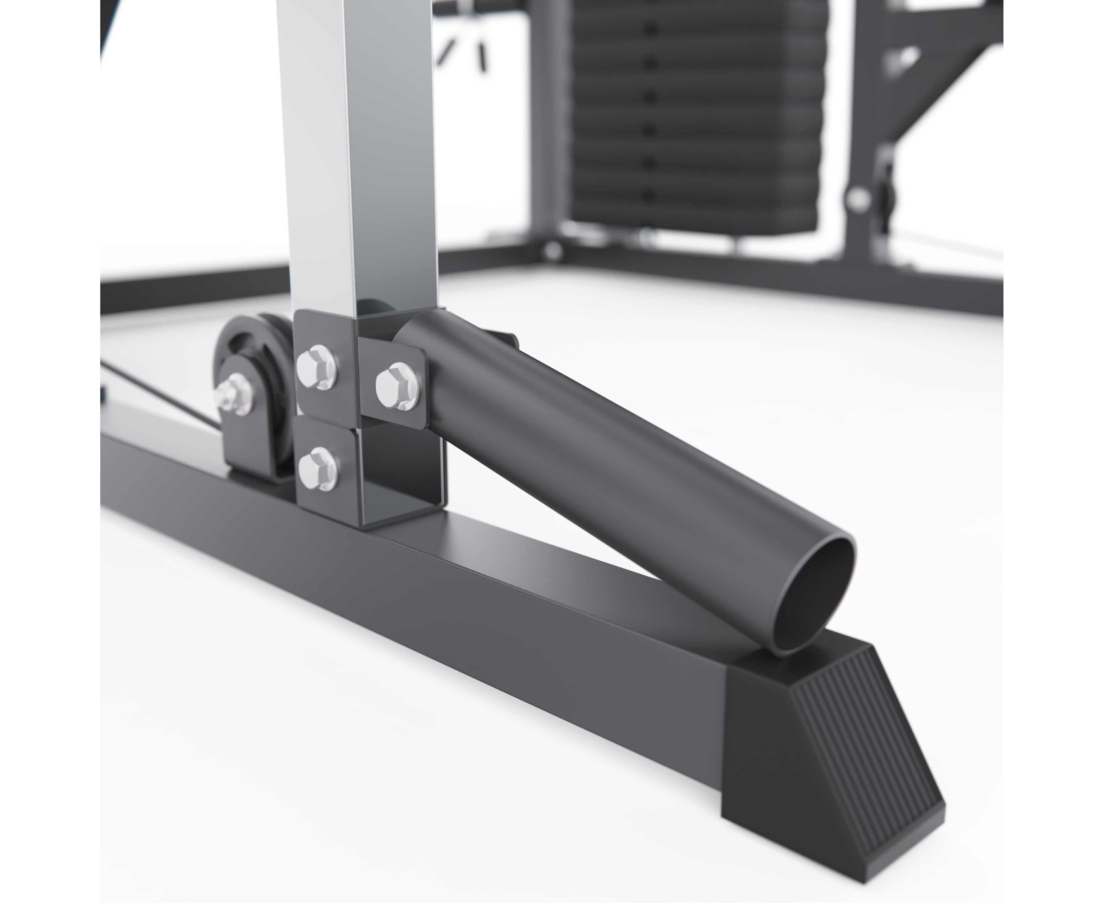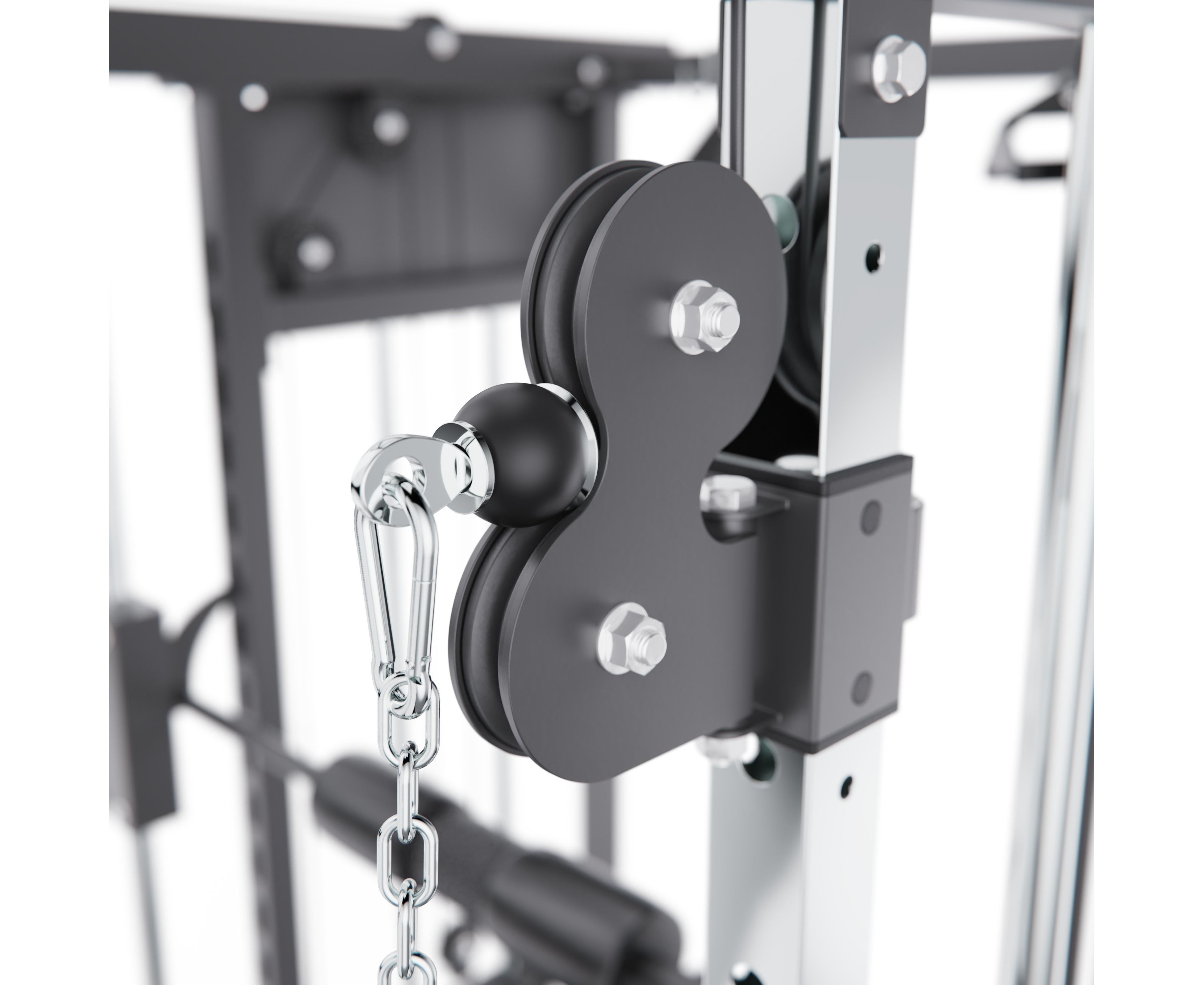 Тренажёр оснащён верхними и нижними блоками, а также набором рукоятей: прямая, V-образная, манжета для ног и дополнительные адаптеры. Система тросов использует тросы длиной 60 см и диаметром 5 мм, оснащённые пружинами и фиксаторами, что обеспечивает плавный ход, точную регулировку нагрузки и долговечность в условиях интенсивной эксплуатации. На стойках расположены держатели для весовых пластин, а встроенный гриф имеет длину 80 см и толщину 5 мм, что обеспечивает удобную загрузку дисков и стабильную работу при выполнении упражнений.