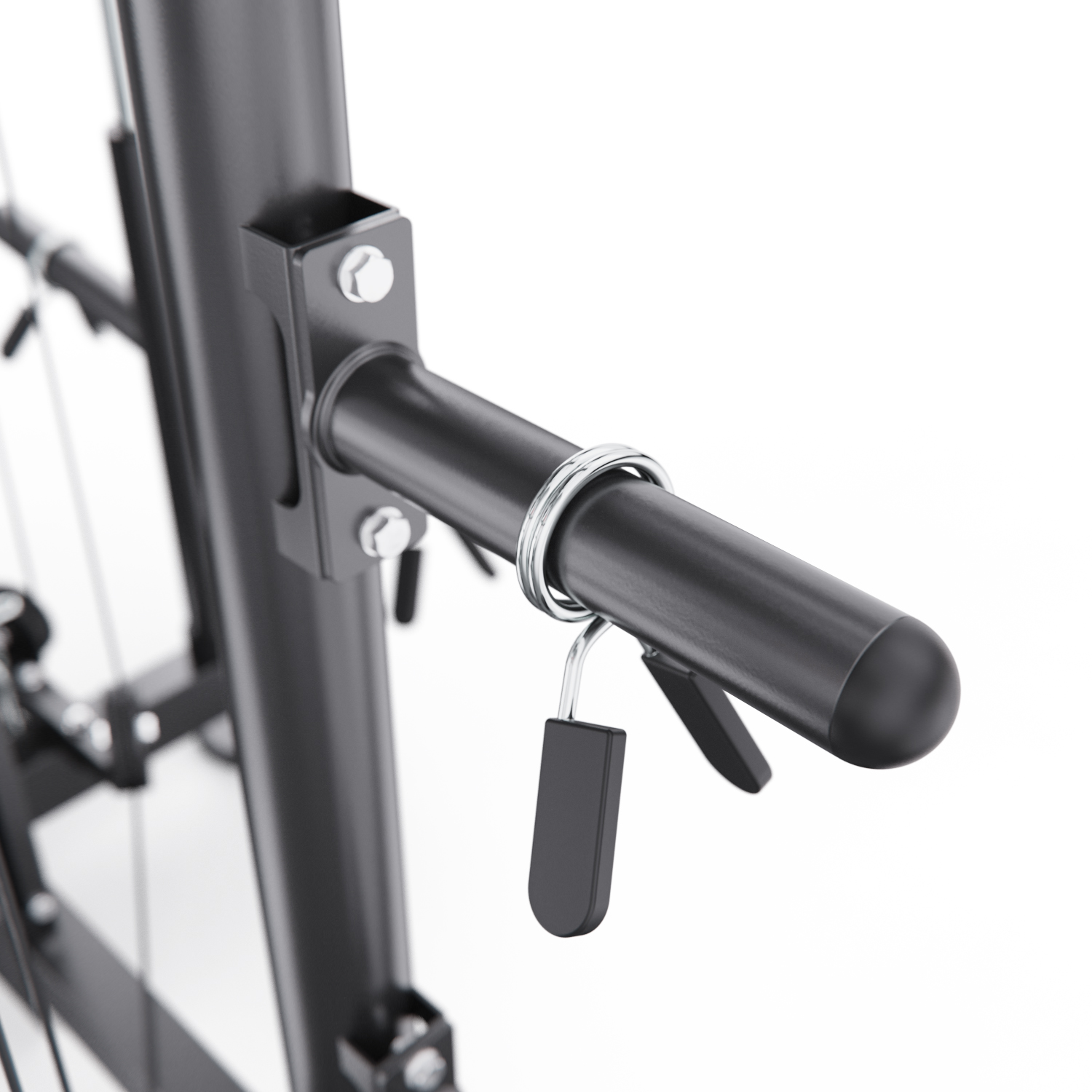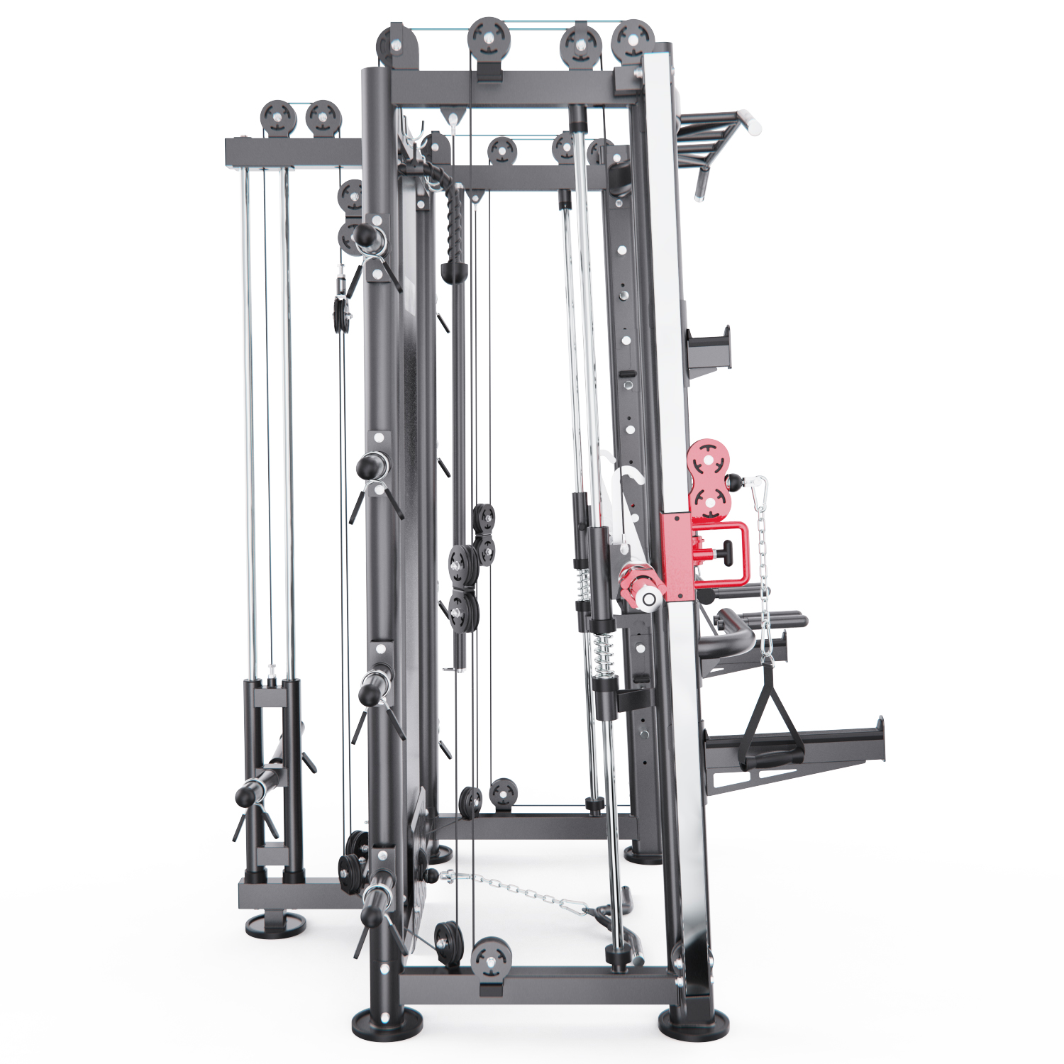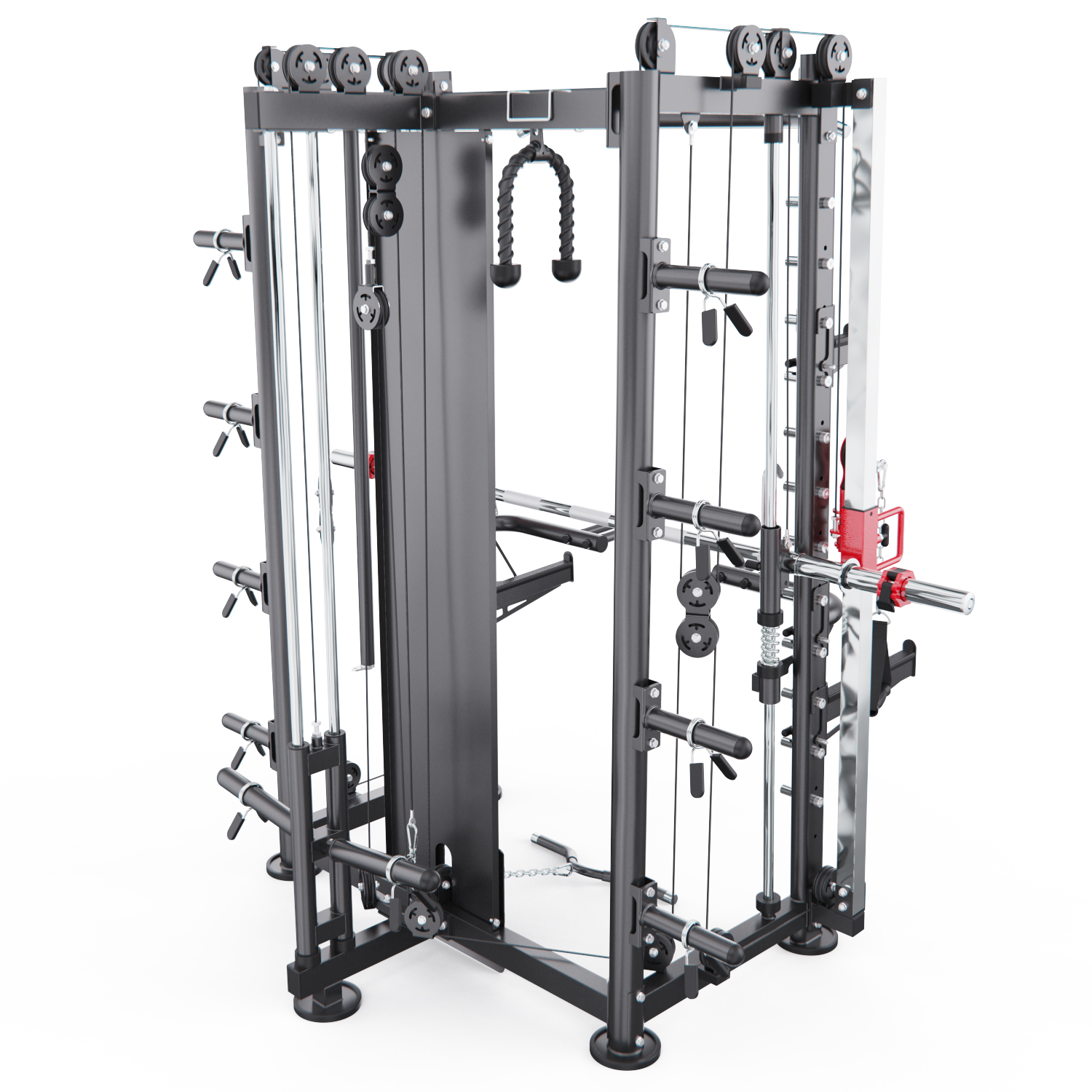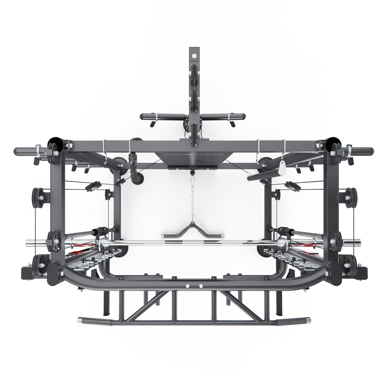 В комплект входят: гриф весом 10,6 кг, мультипозиционный турник, гибкий трос для бицепса, ручка для тяги снизу, две универсальные ручки на цепях для верхней и нижней тяги, а также 8 пружинных замков для хранения дисков. Вы сможете выполнять десятки упражнений — от жима лёжа и приседаний до тяги сверху, снизу и работы с собственным весом.