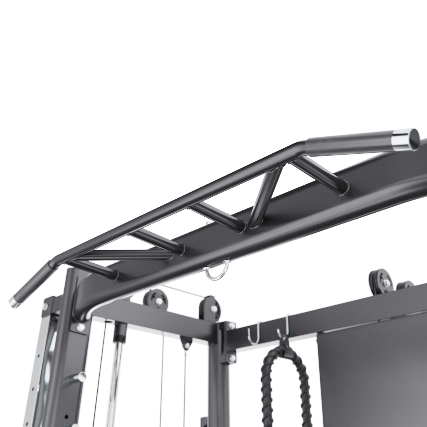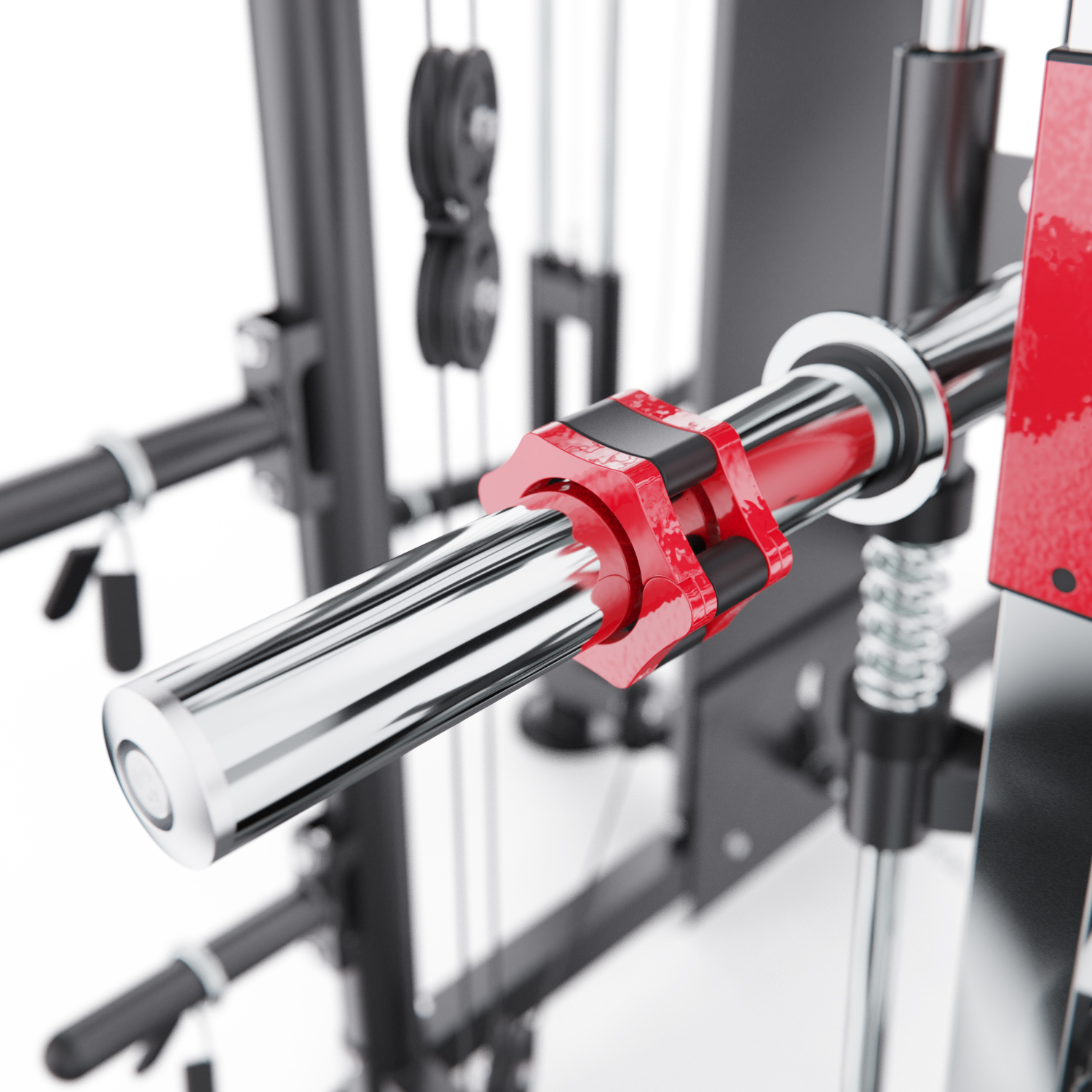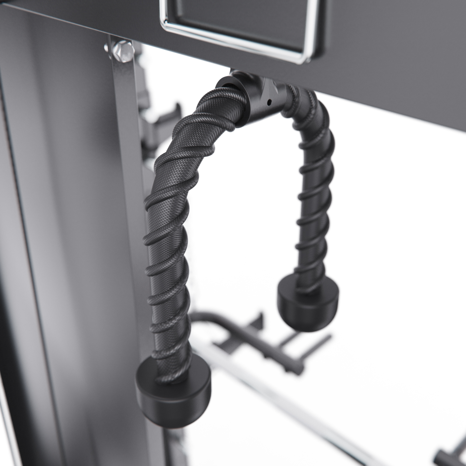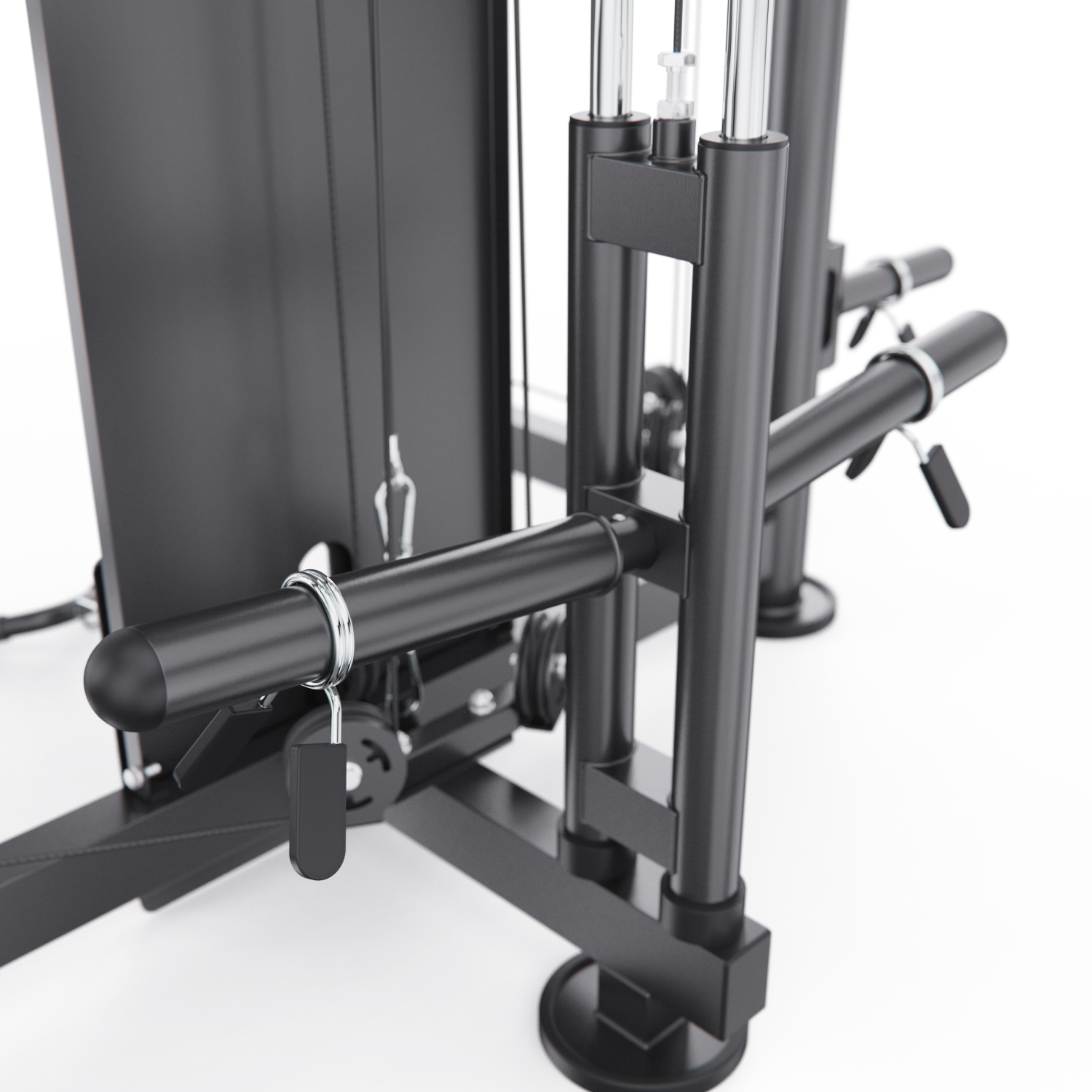 В комплект входят: гриф весом 10,6 кг, мультипозиционный турник, гибкий трос для бицепса, ручка для тяги снизу, две универсальные ручки на цепях для верхней и нижней тяги, а также 8 пружинных замков для хранения дисков. Вы сможете выполнять десятки упражнений — от жима лёжа и приседаний до тяги сверху, снизу и работы с собственным весом.