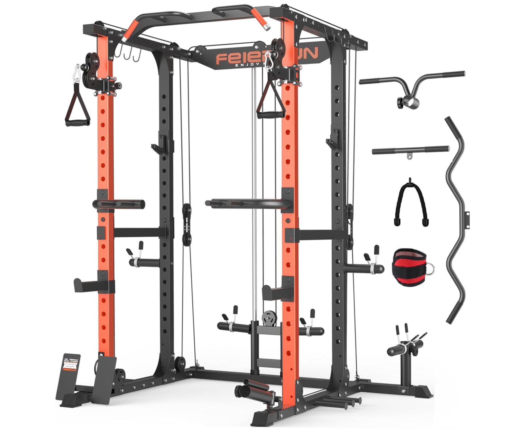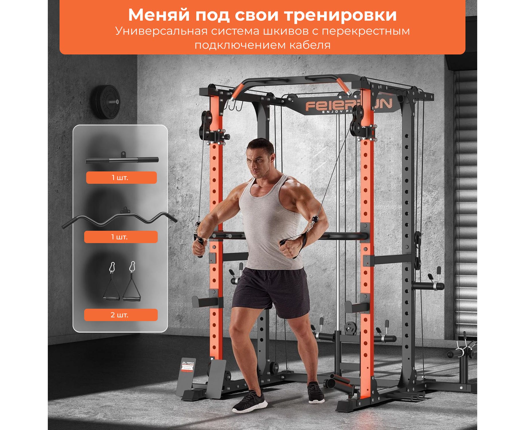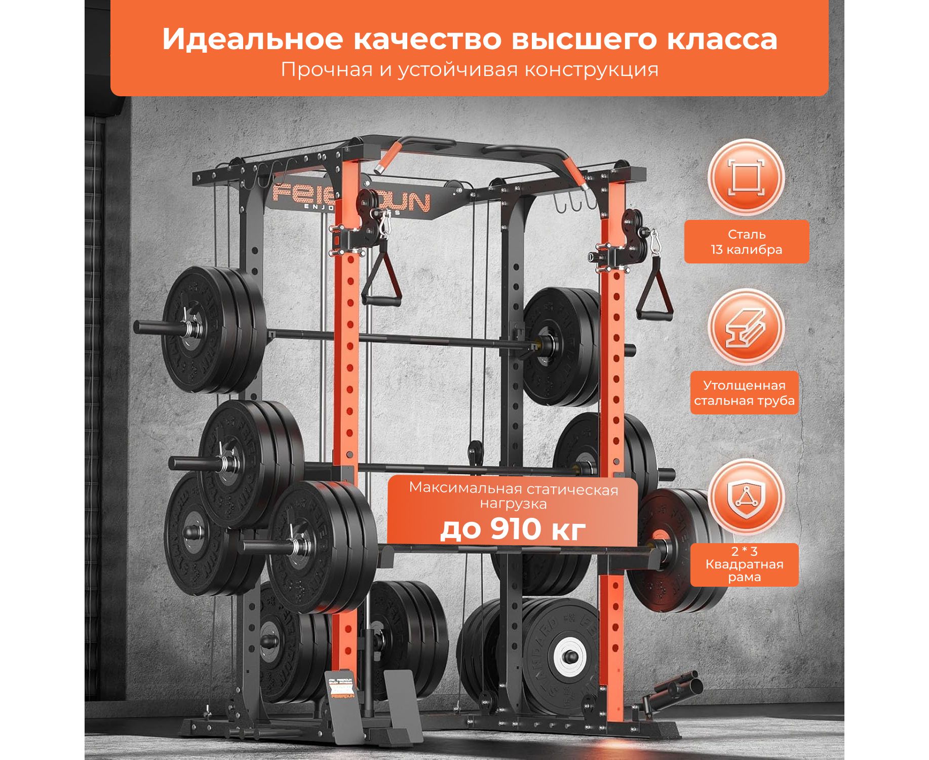 Профиль рамы 50*50*2 мм Максимальная статическая нагрузка до 910 кг, что обеспечивает безопасную и комфортную эксплуатацию тренажёра для пользователей разного уровня подготовки. Рама имеет прочный профиль и посадочный диаметр, а толщина тросов и рукояти для тяги обеспечивают надёжность и стабильность при выполнении упражнений.