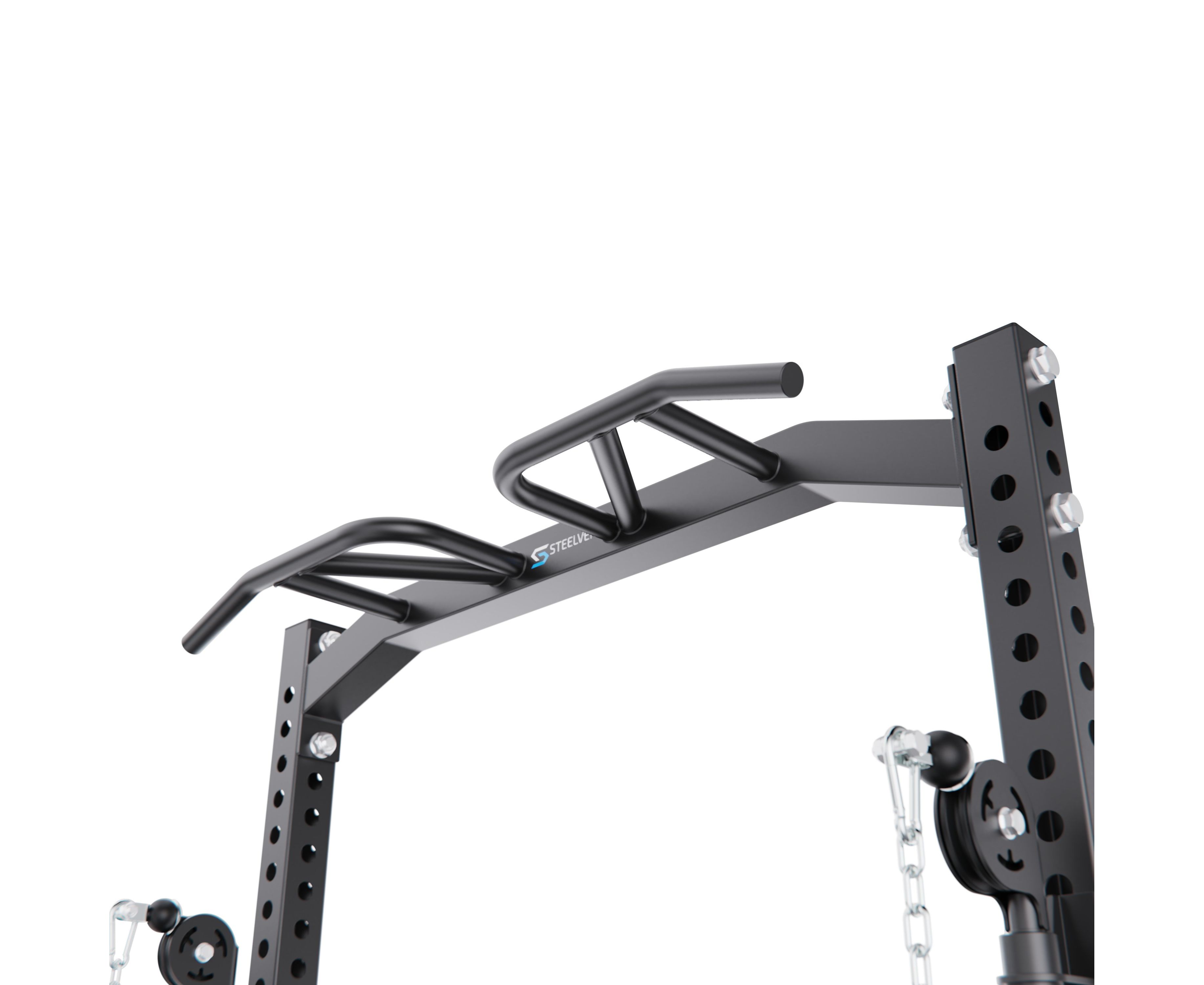 Дополнительно конструкция оснащена многопозиционным турником с несколькими вариантами хвата от узкого до широкого, что дает возможность выполнять подтягивания различной сложности, а также упражнения для тренировки корпуса и мышц спины, увеличивая универсальность и функциональность тренажера.