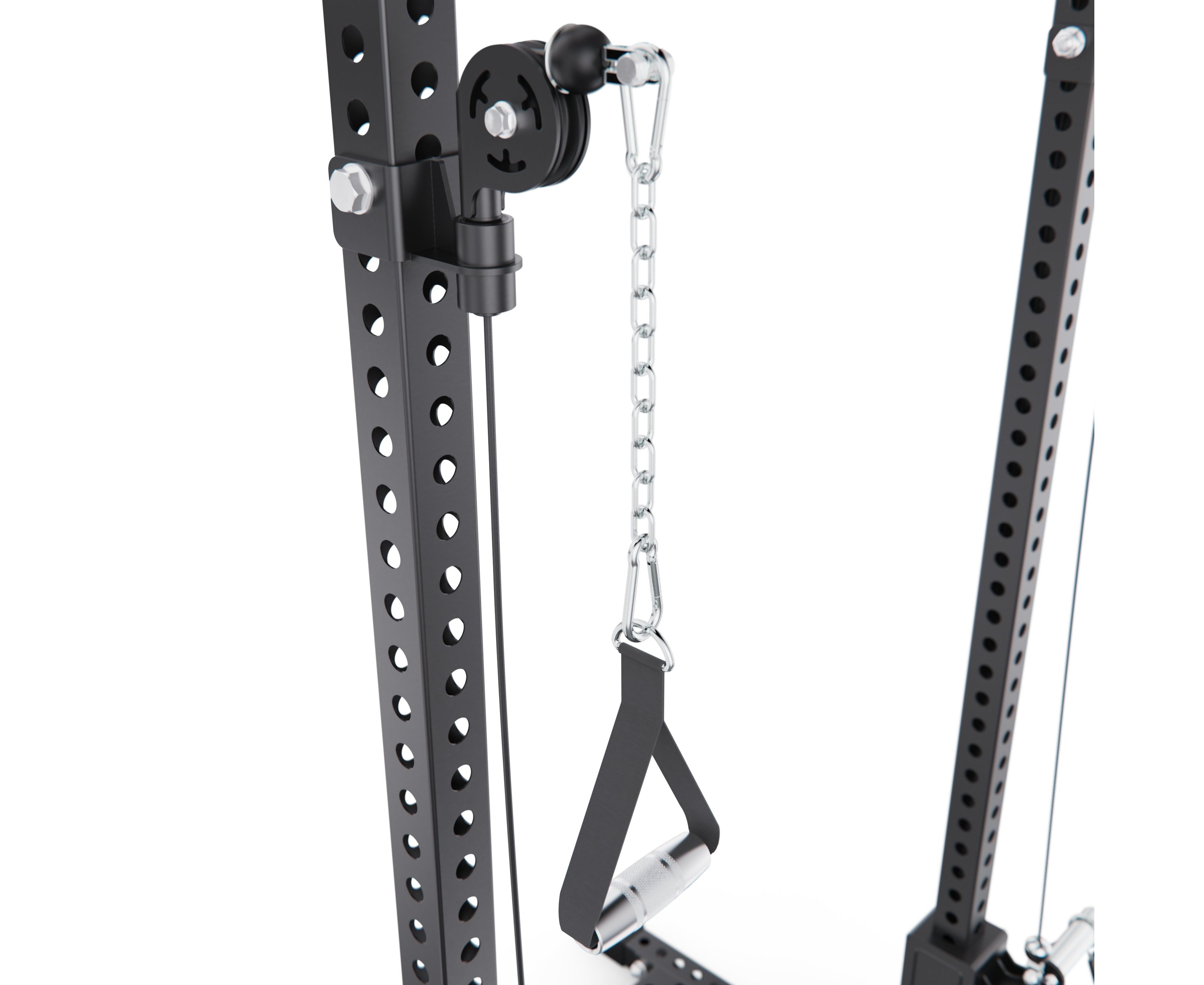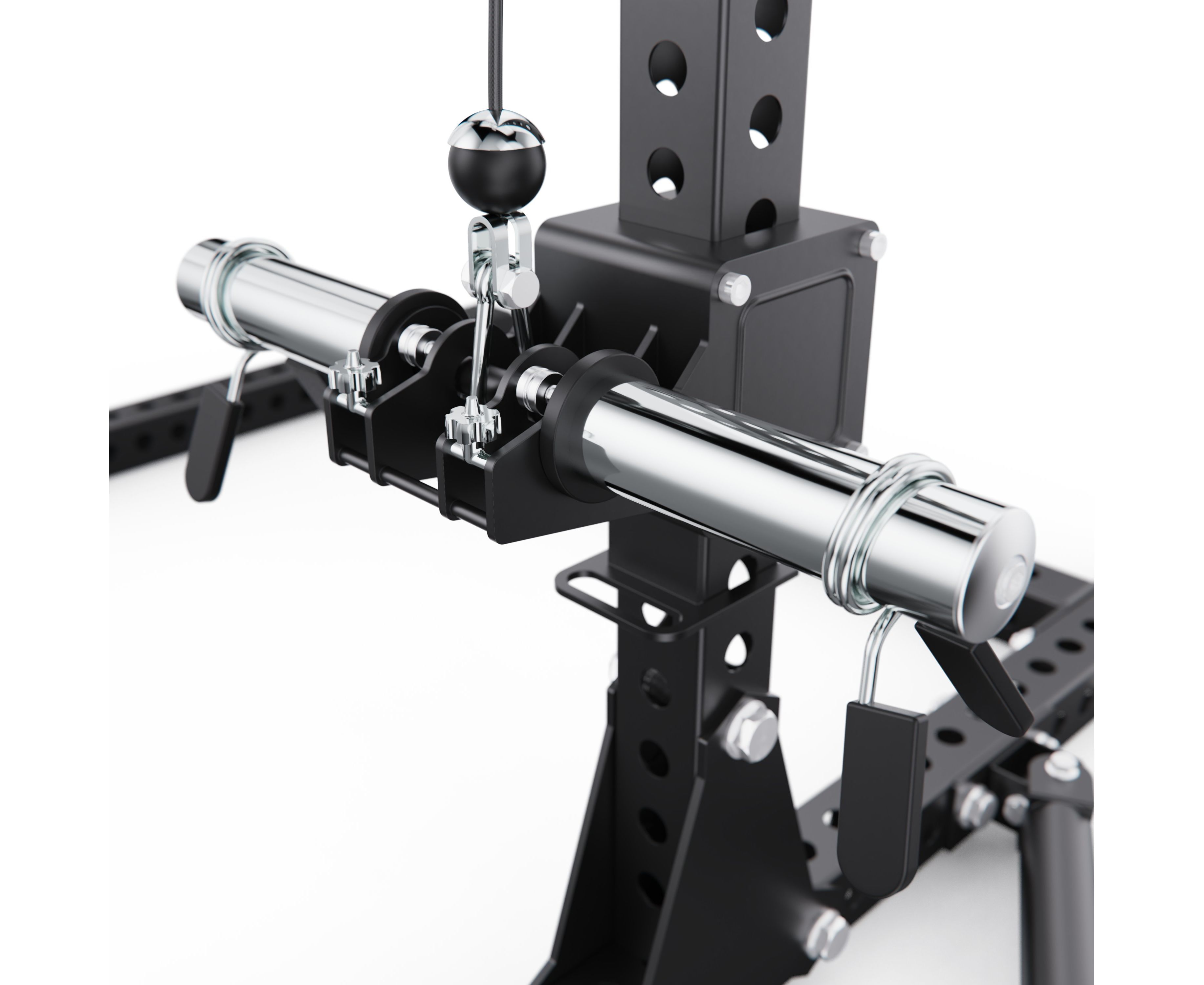 Встроенный кроссовер расширяет функциональность тренажера и позволяет прорабатывать все основные группы мышц. Кроме того, с одной стороны рамы предусмотрено специальное отверстие для установки грифа, которое позволяет использовать раму как Лэндмайн, выполняя жим и другие упражнения с естественной амплитудой движения.