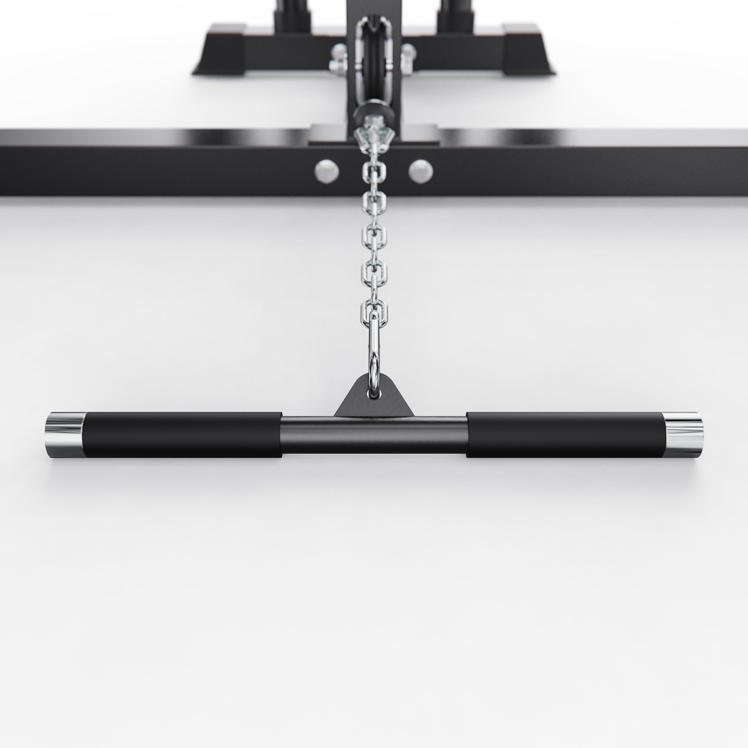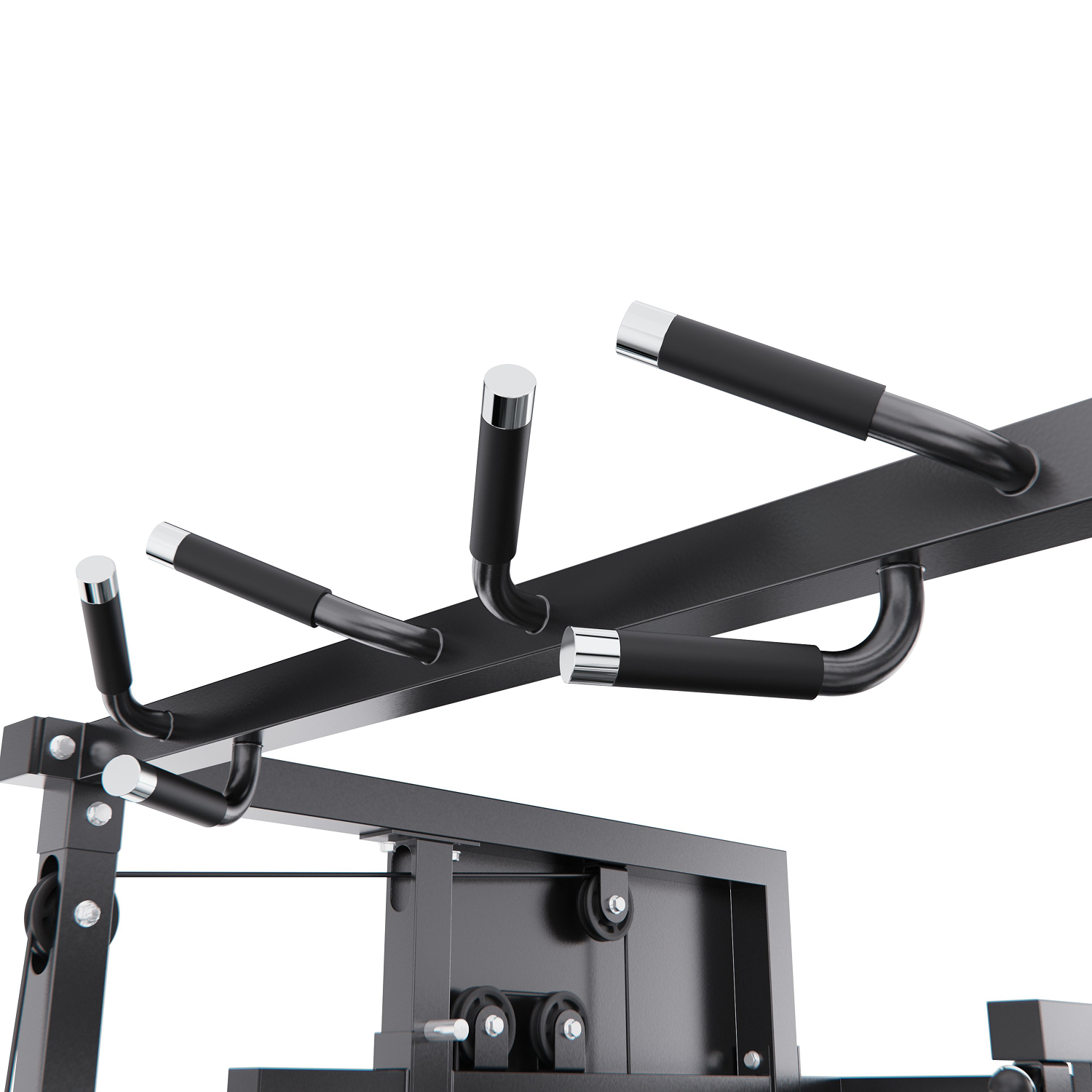 Верхняя часть комплекса оборудована турником с несколькими вариантами хвата, что позволяет акцентировать нагрузку на различные участки мышц спины, плеч и рук. В комплект также входит V-образная тяговая рукоятка, предназначенная для тяг узким хватом и тяг к поясу, обеспечивающая глубокую и точную проработку широчайших мышц спины.