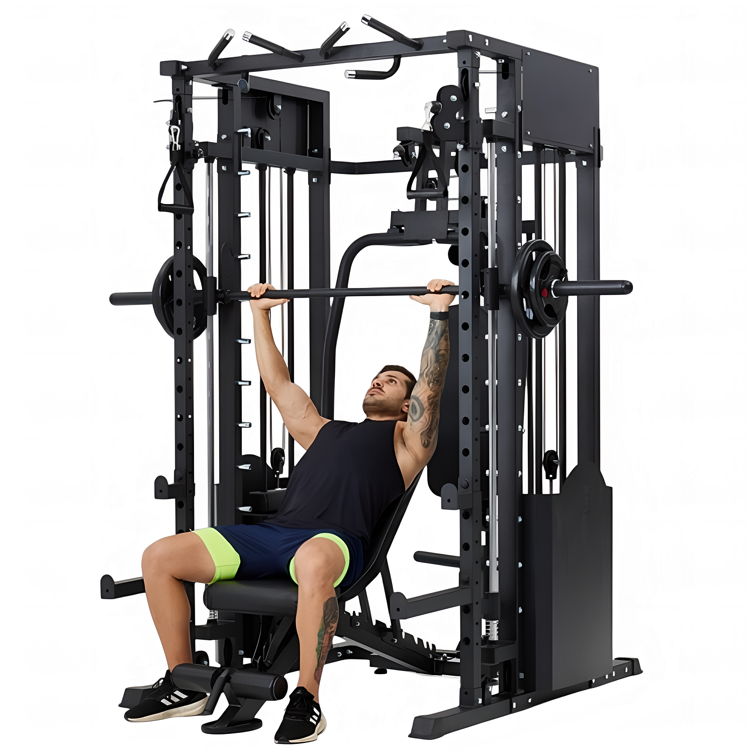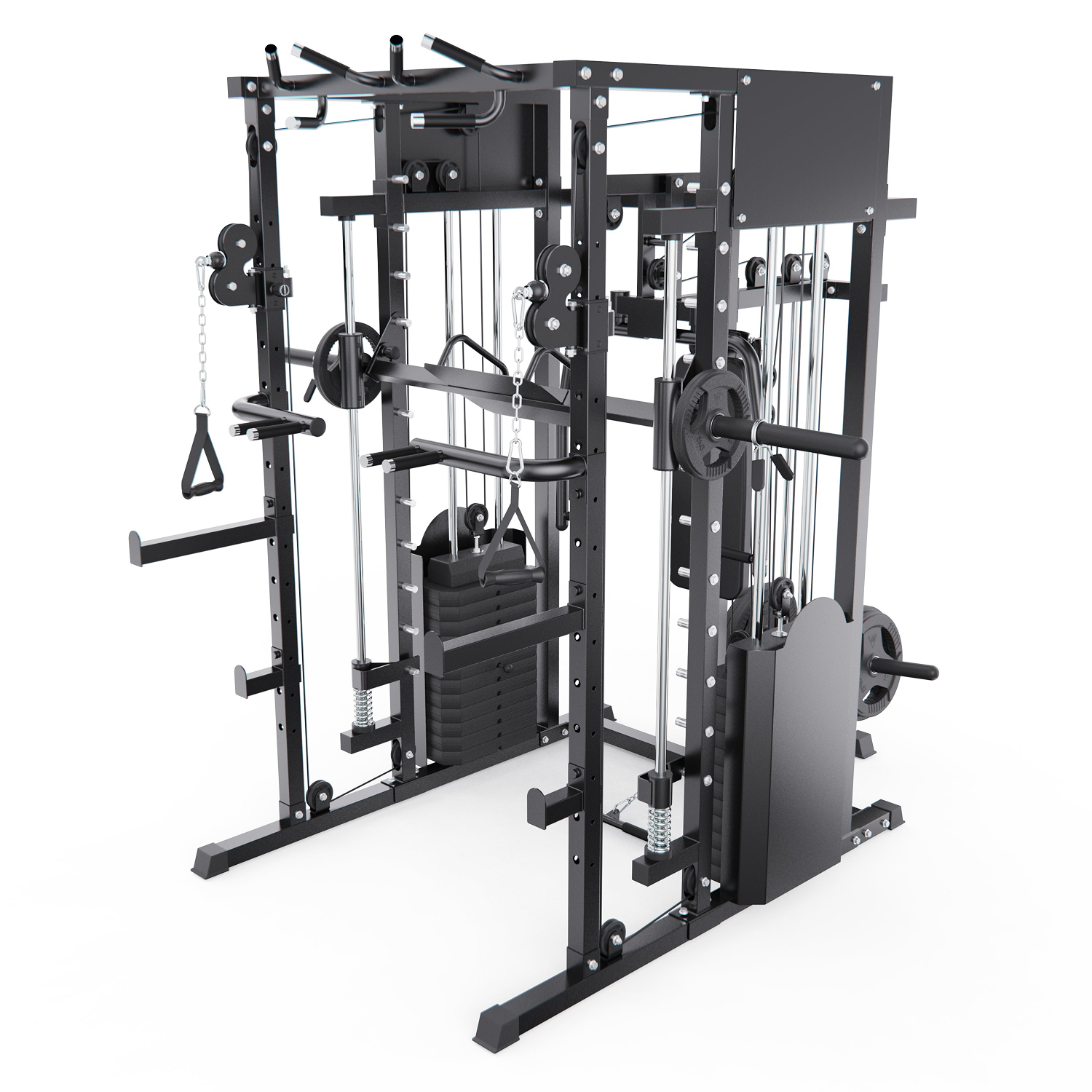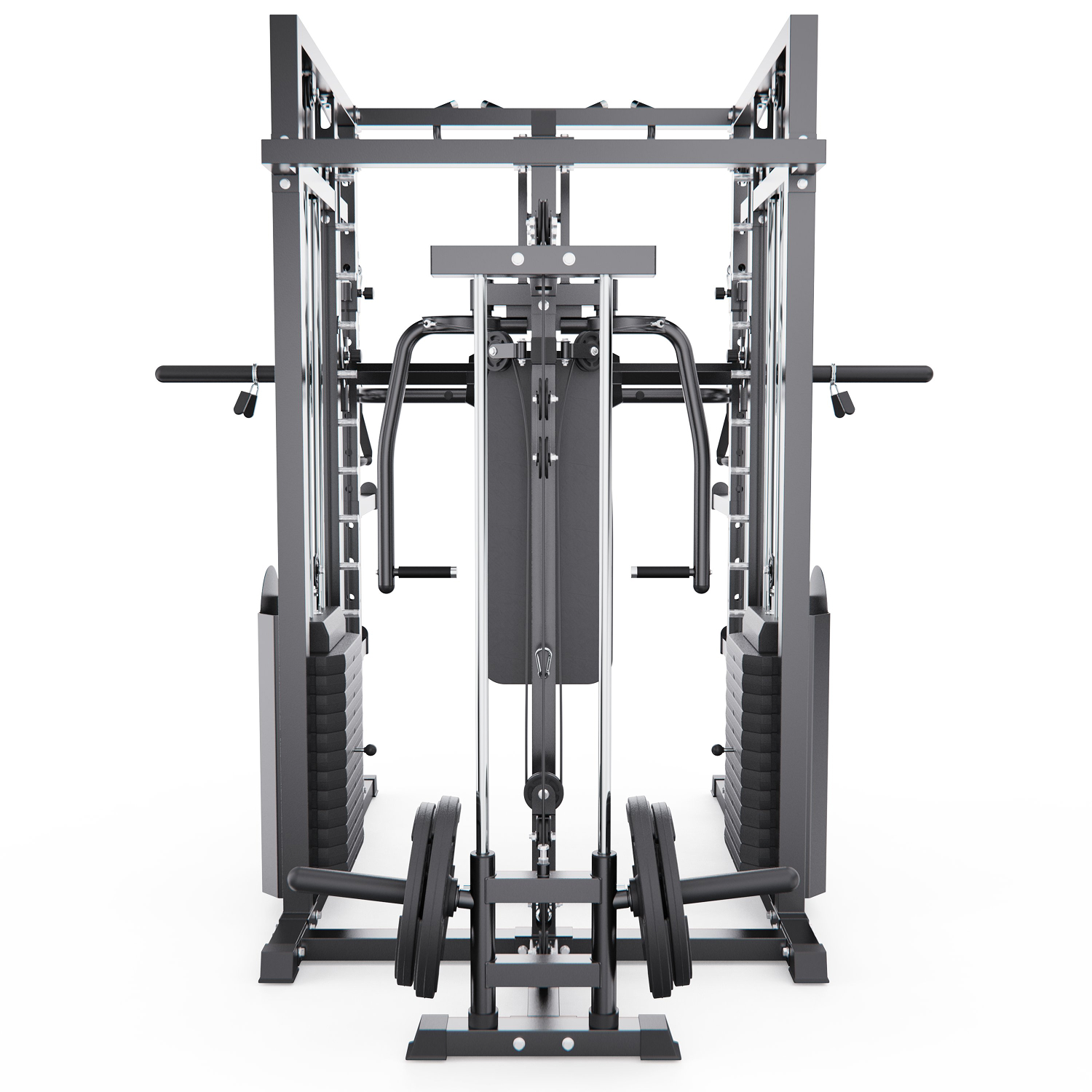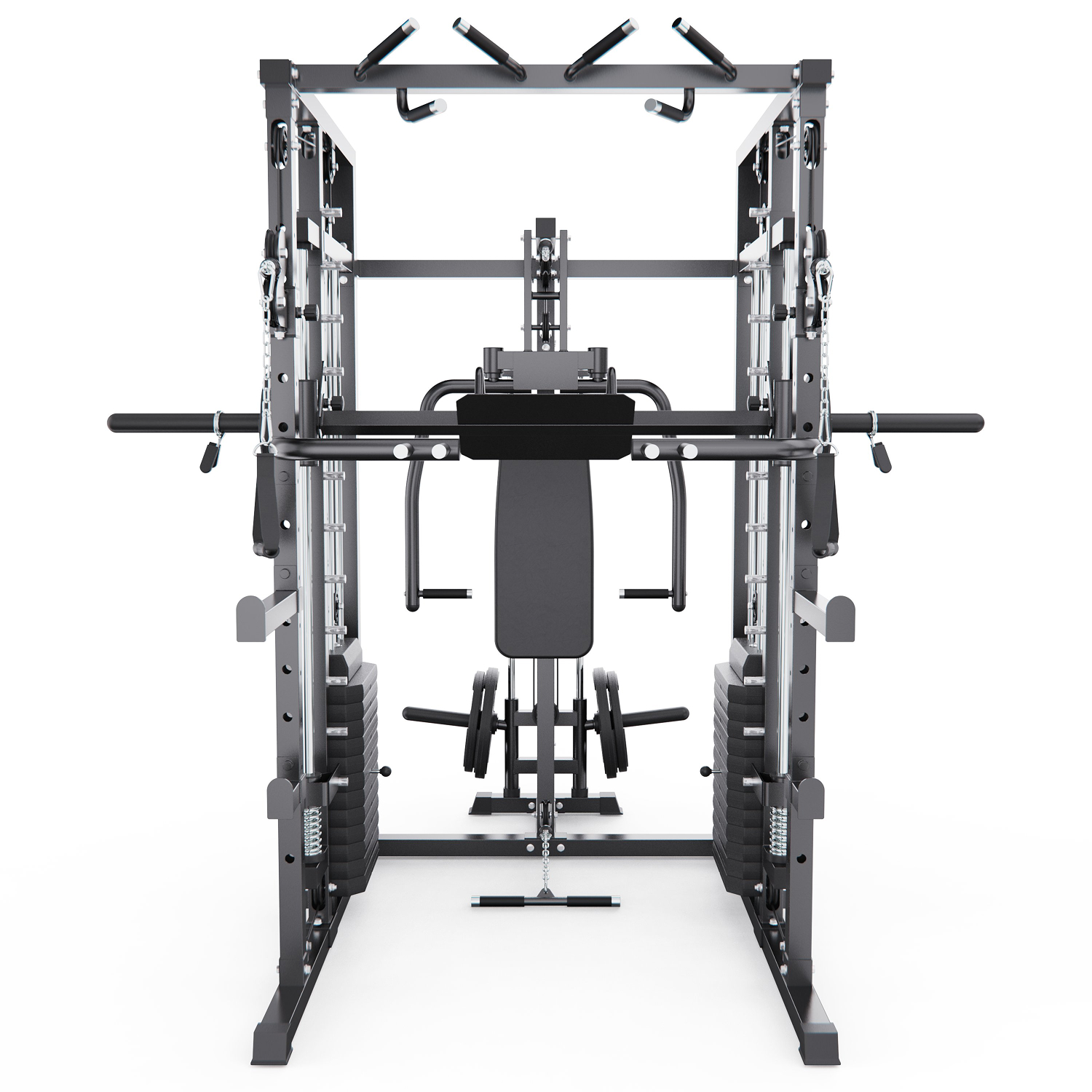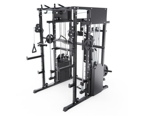 Многофункциональный силовой комплекс позволяет выполнять широкий спектр упражнений: жимы и тяги для груди и спины, верхнюю и нижнюю тягу, баттерфляй, упражнения на бицепс и трицепс, тяги к поясу, приседания и упражнения со штангой, а также тренировки на пресс.