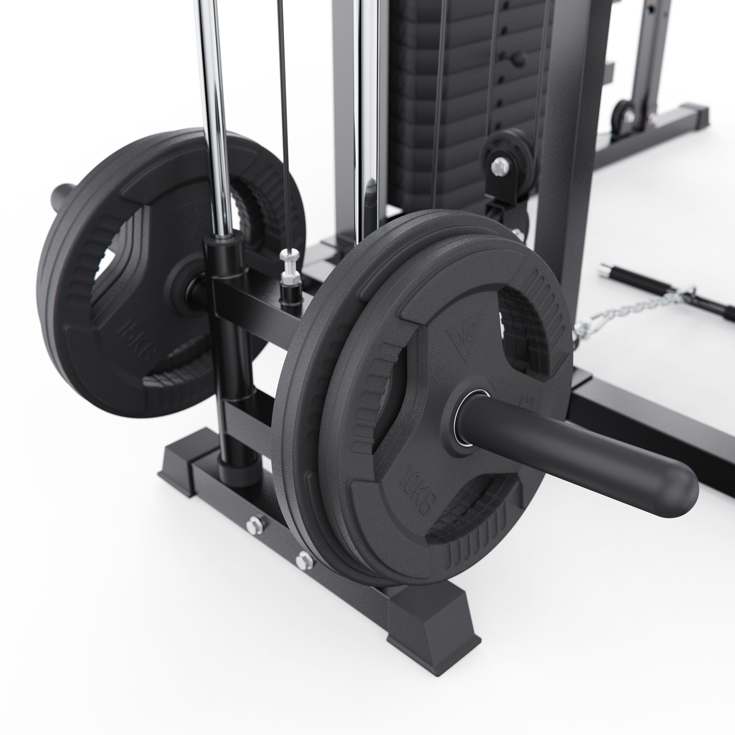 Штанга регулируется по высоте с помощью удобных рычагов и может фиксироваться на 11 уровнях, что позволяет точно настроить тренажёр под рост пользователя и конкретное упражнение. Комплекс можно совмещать со скамьёй для жима, что значительно расширяет функциональность и делает возможным выполнение классических жимовых упражнений.