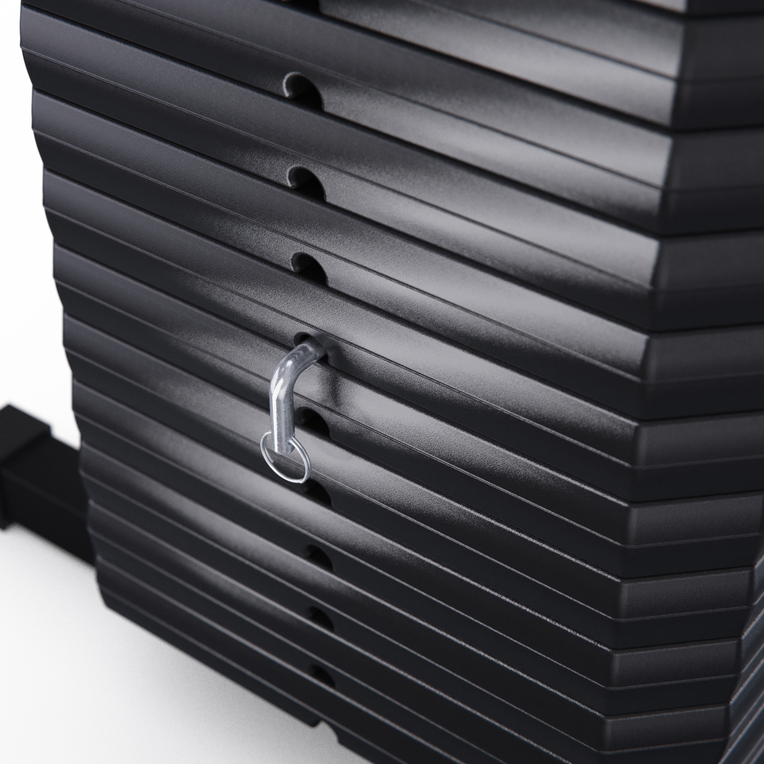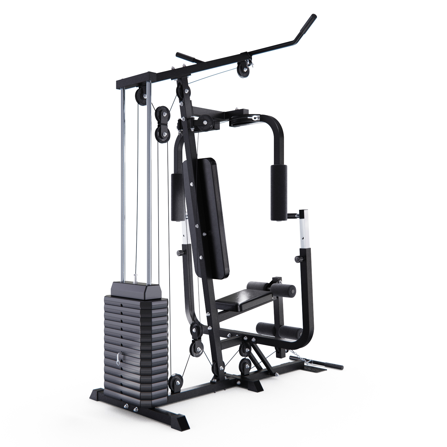 В комплектацию входит весовой стек, расположенный сзади от скамьи. Общий вес — 63 кг: 14 пластин по 4,5 кг. Вес регулируется при помощи специального фиксатора. Плавность движения стеков гарантируют ролики на подшипниках. Тренажёр изготовлен на основе прочной трубы с размерами профиля 45 х 45 х 1,5 мм.