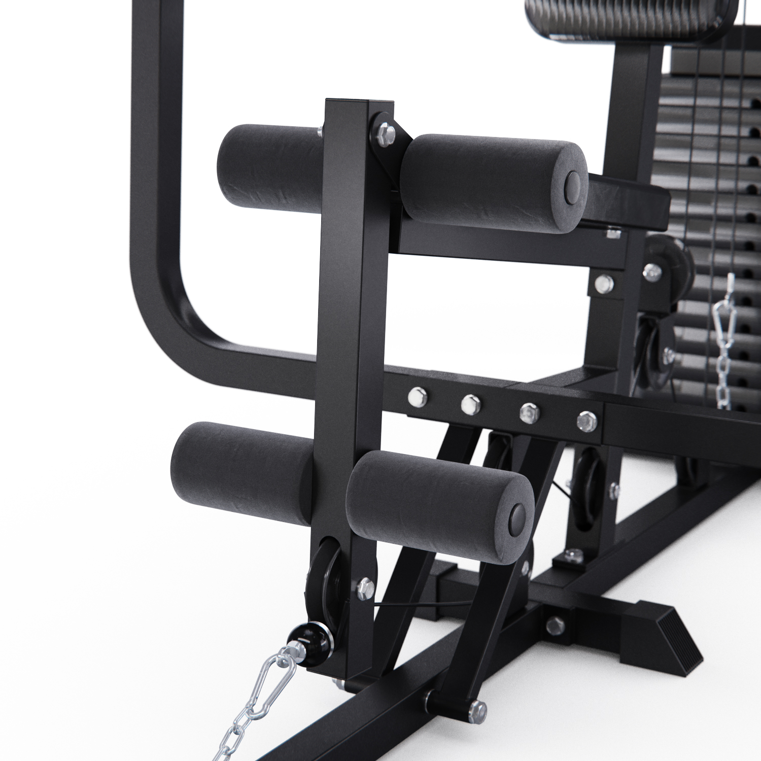 Скамья со спинкой обшита мягким наполнителем для комфорта во время занятий. Максимально допустимая нагрузка — 200 кг. Конструкция с валиками для разгибания ног с весом позволяет укреплять передние мышцы бедра (квадрицепс) с регулировкой веса. Максимально допустимая нагрузка — 100 кг.
