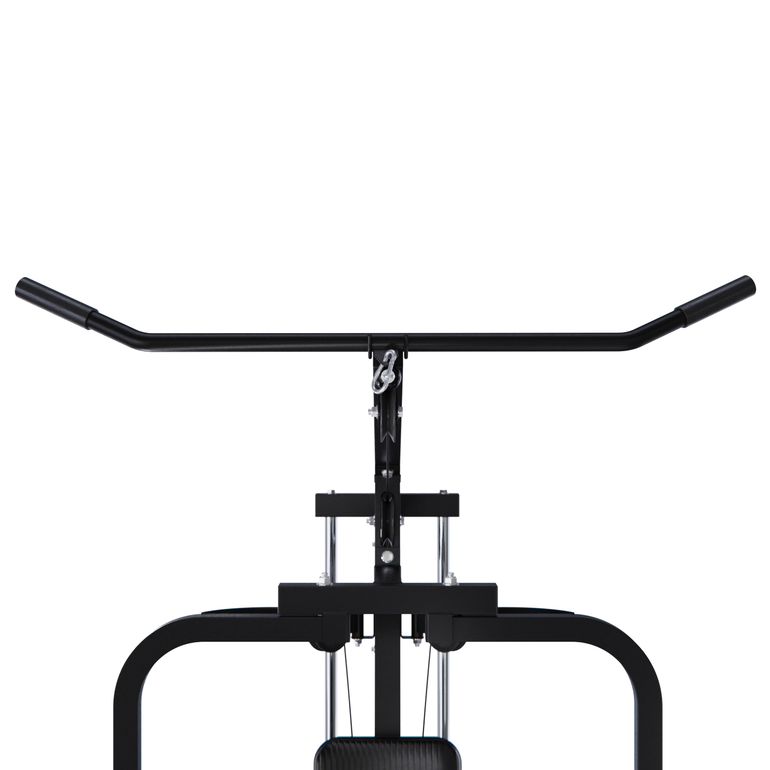 Для тяги сверху предусмотрена перекладина с нескользящими ручками. Положение рук в широком хвате эффективно прокачивает мышцы спины и рук (широчайшие, ромбовидные, трапециевидные, большие круглые мышцы, задние дельты, бицепс и предплечья). Максимальная нагрузка — 100 кг.