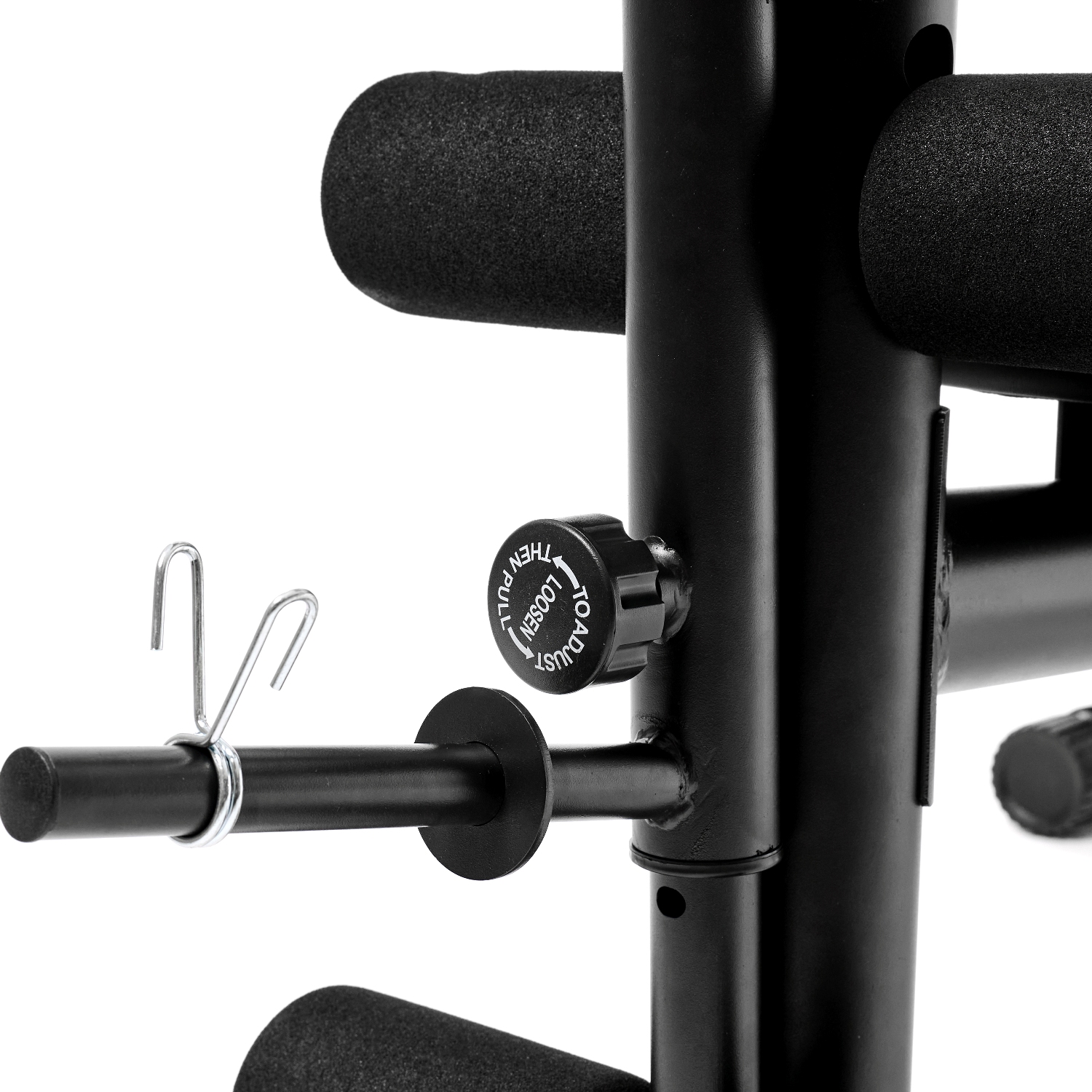 Стойки под штангу регулируются по высоте на 4 уровня с шагом 2 см. Расстояние между ними составляет 116 см, а допустимая нагрузка на них - до 120 кг.