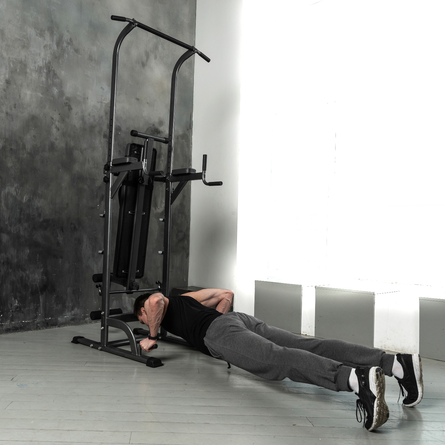 Спинка и специальные упоры для локтей дополнены двумя вертикальными рукоятками для максимального комфорта выполнения упражнений для пресса. А с помощью покрытых уретановыми пластинами подставок, вы легко сможете занять исходное положение в упоре на локтях, не рискуя получить травму.