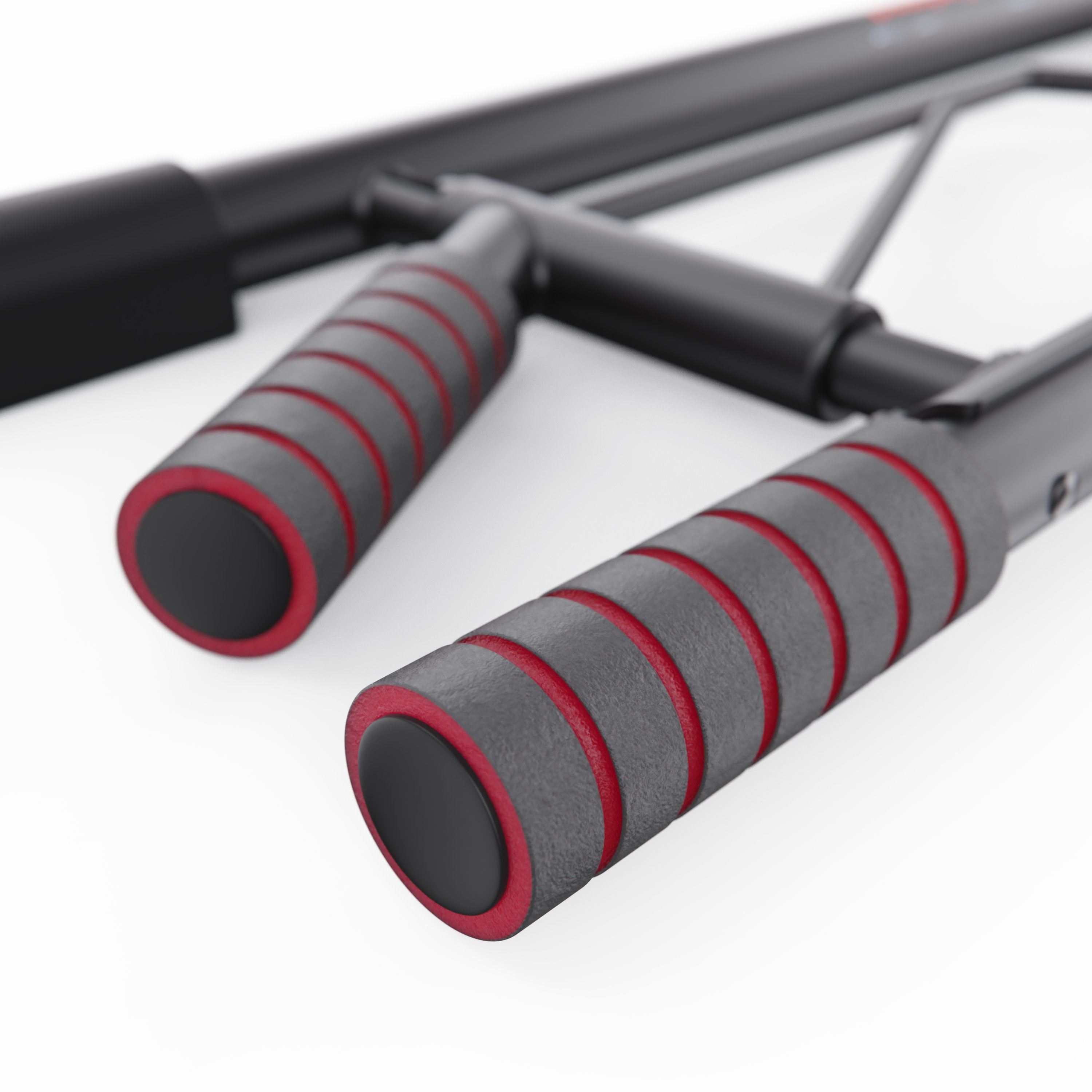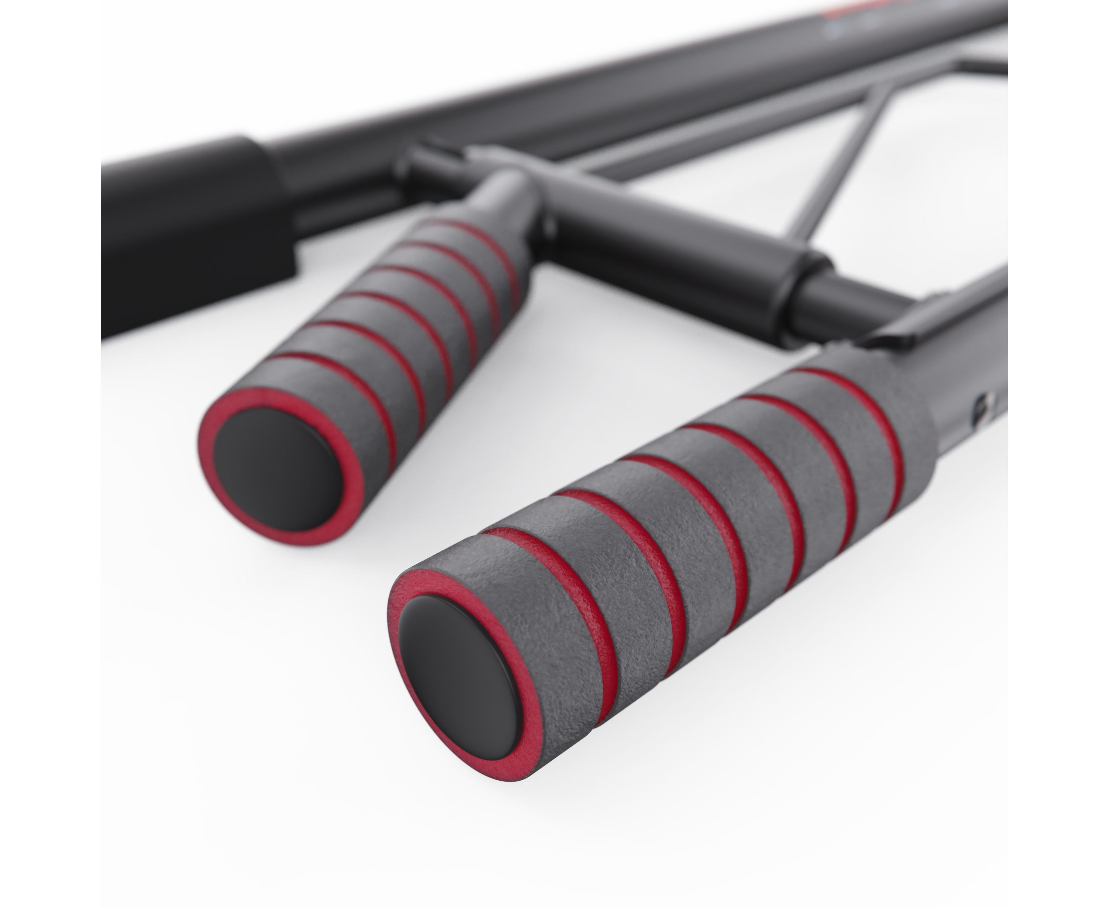 Модель рассчитана на максимальный вес пользователя 200 кг. Благодаря прочной конструкции из высокоуглеродистой стали с элементами из пенопласта и полипропилена, турник обеспечивает безопасность и комфорт даже при интенсивных нагрузках.
