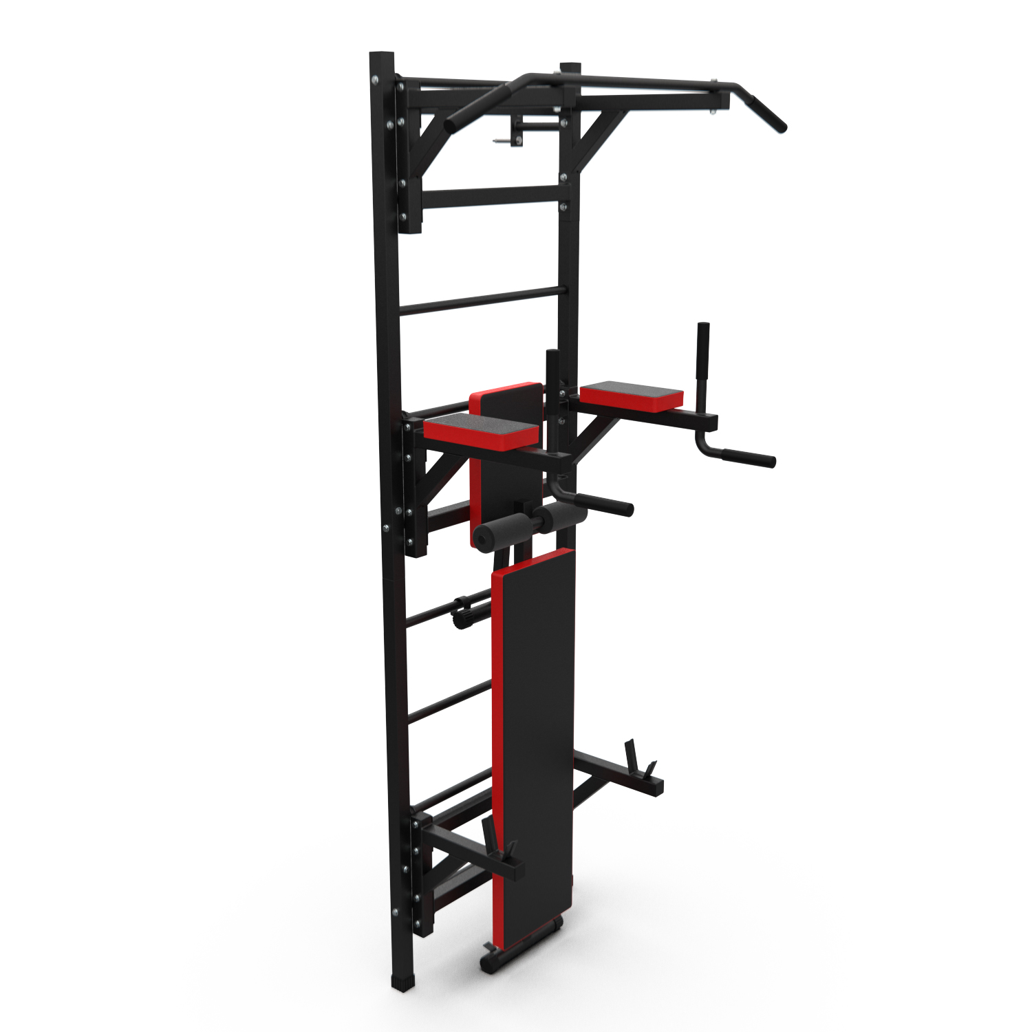 Турник длиной 99 см оснащён мягкими неопреновыми ручками, очень легко перевешивается на перекладины шведской стенки, что позволяет менять его высоту. Расстояние от ручек турника до шведской стенки (вынос турника) - 72 см. Вынос брусьев – 87 см, размер подушки под спину 42 х 25 см, а её толщина 5 см. Подушки подлокотников размерами 25 х 13 х 5 см, а поручни длиной 32 см диаметром 25 мм и толщиной стали 1,5 мм.