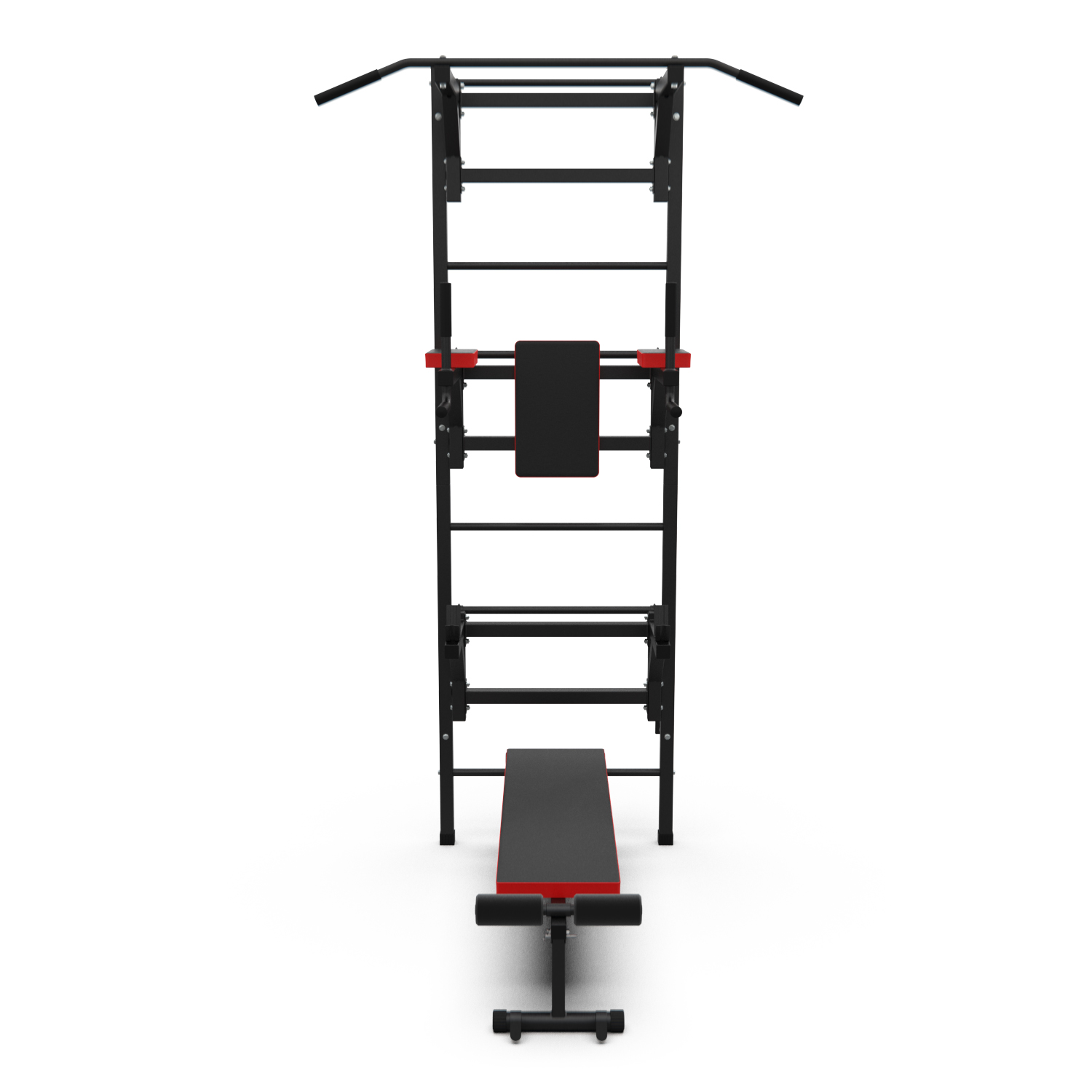Турник длиной 99 см оснащён мягкими неопреновыми ручками, очень легко перевешивается на перекладины шведской стенки, что позволяет менять его высоту. Расстояние от ручек турника до шведской стенки (вынос турника) - 72 см. Вынос брусьев – 87 см, размер подушки под спину 42 х 25 см, а её толщина 5 см. Подушки подлокотников размерами 25 х 13 х 5 см, а поручни длиной 32 см диаметром 25 мм и толщиной стали 1,5 мм.