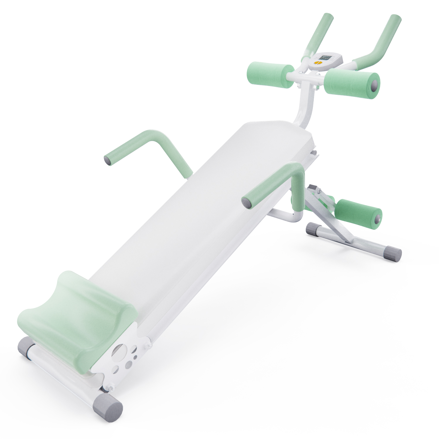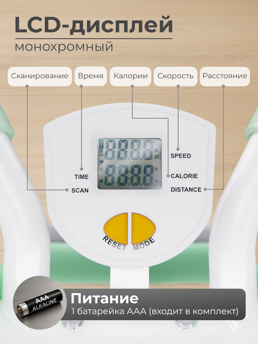 Для отслеживания результатов тренировок скамья оборудована встроенным монохромным LCD-дисплеем. Он отображает ключевые параметры: время тренировки, количество повторений, количество сожжённых калорий и частоту движений в минуту. Питание от 1 батарейки AAA (входит в комплект).