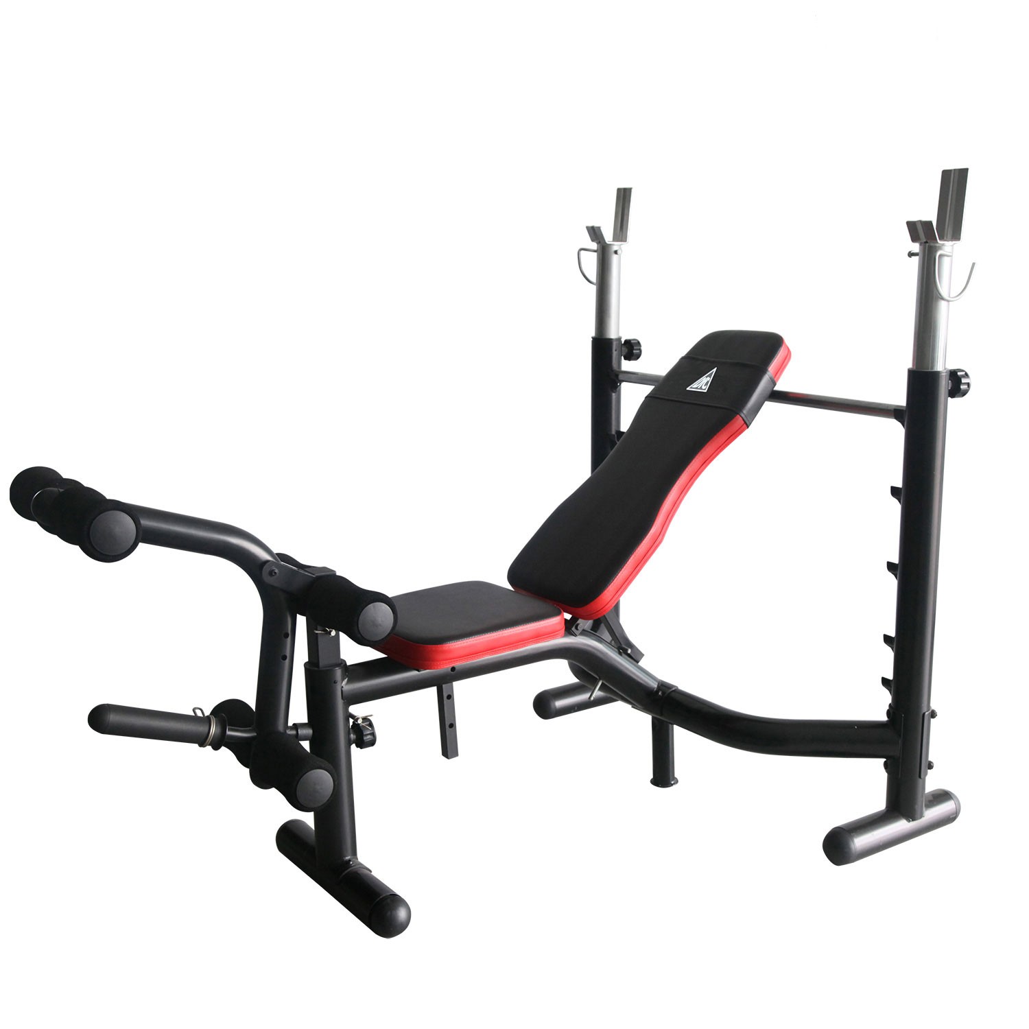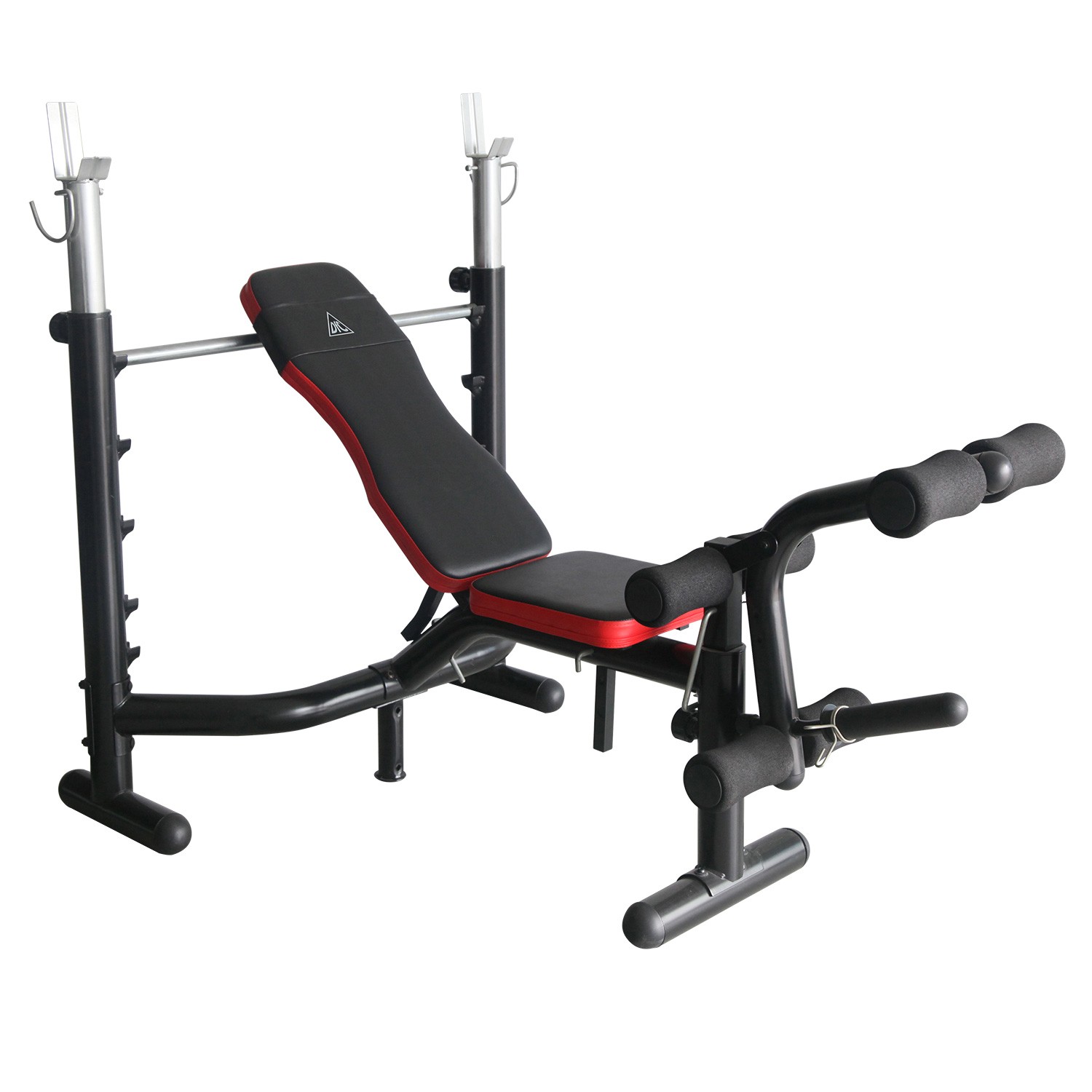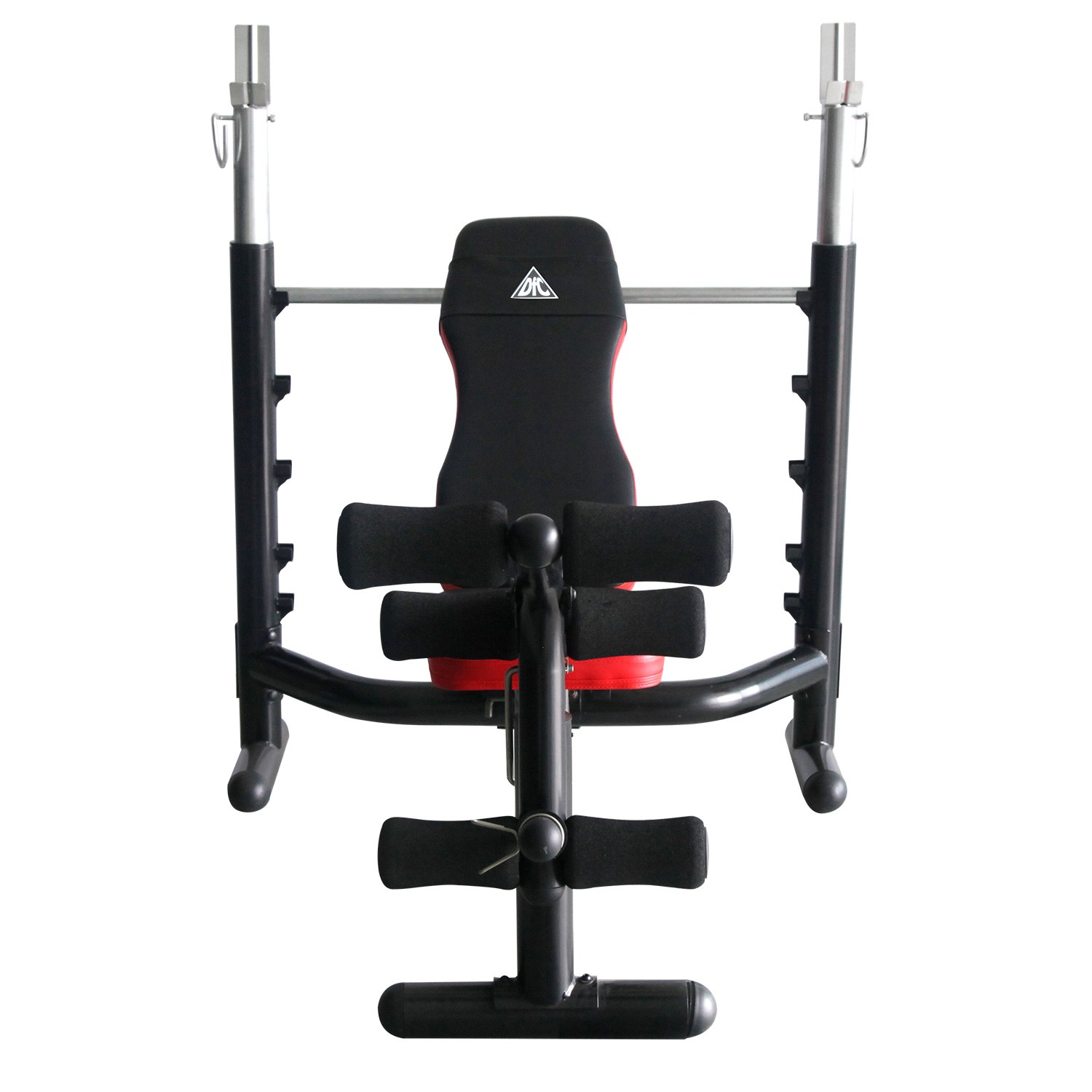 Силовая скамья со стойками под штангу. Дополнительно установлена опция жим ногами.