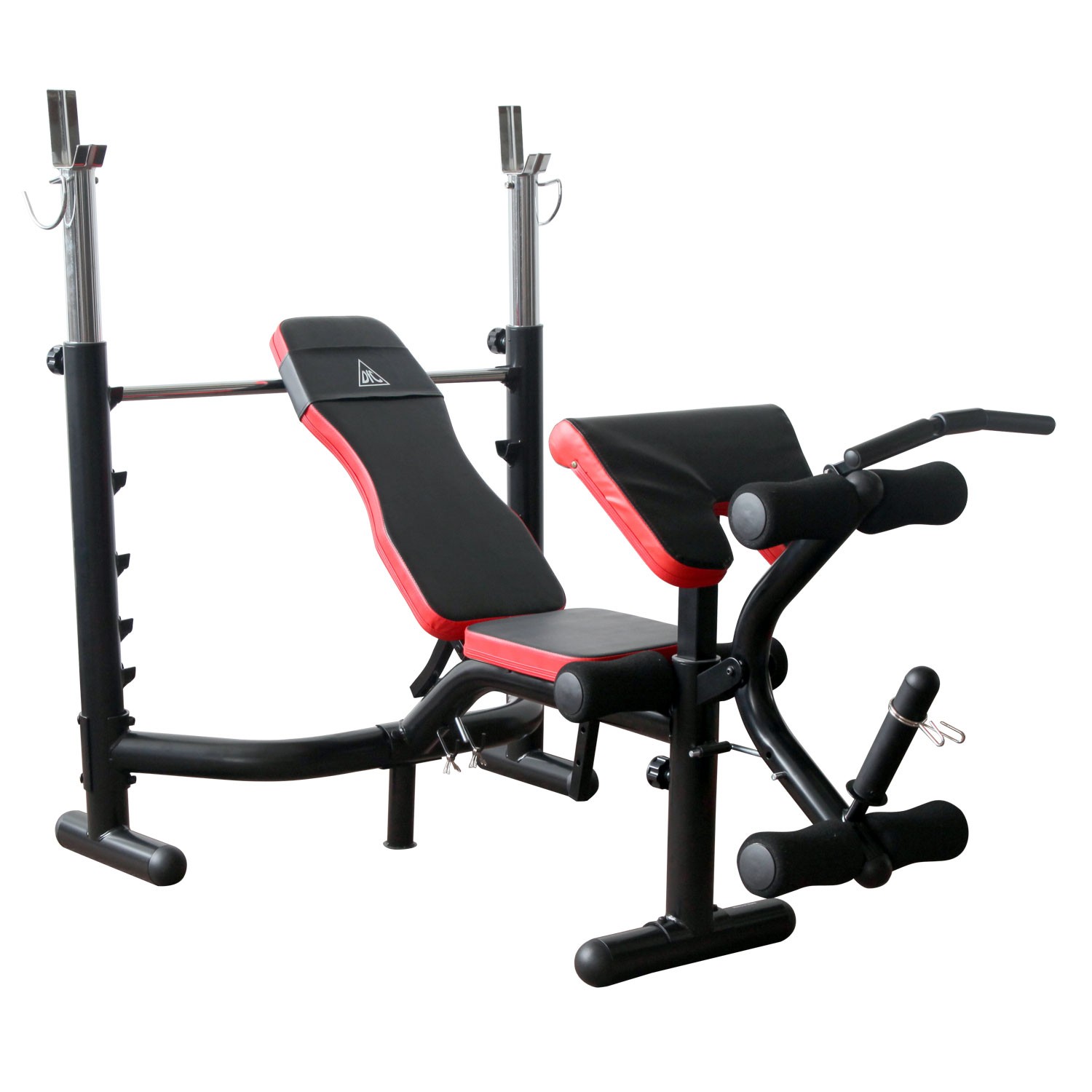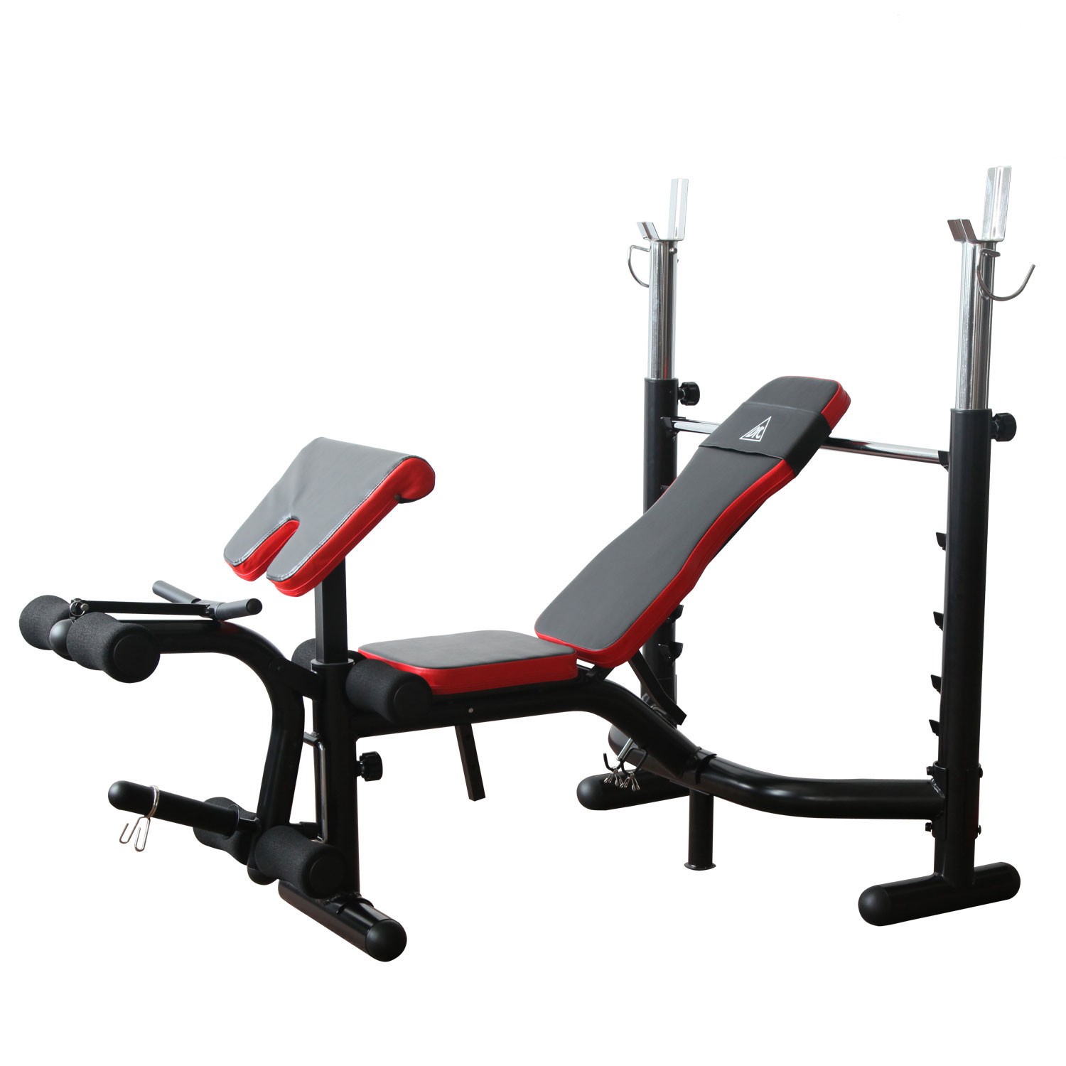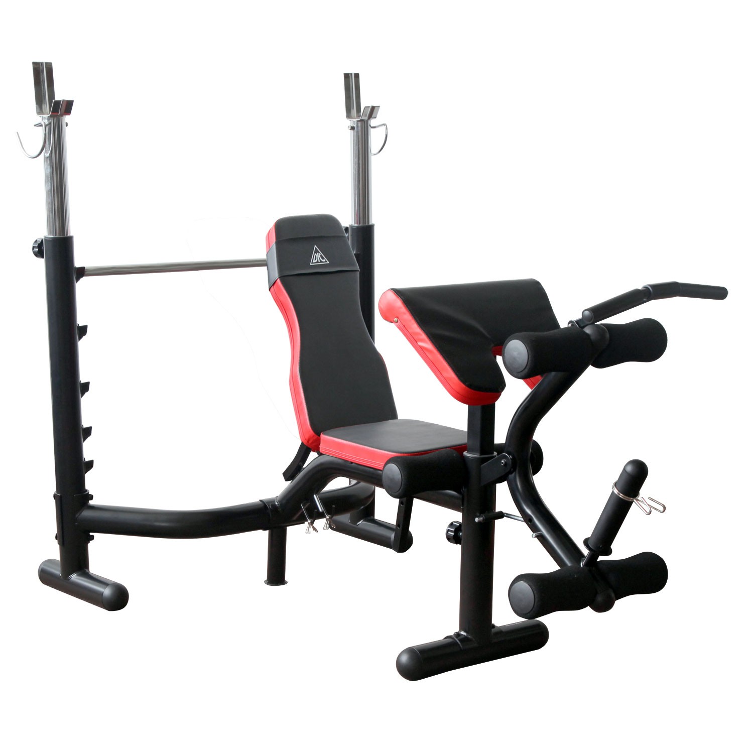 Стойки под штангу с замками безопасности, имеют регулировку по высоте. Рычаги блока для ног снабжены мягкими валиками.