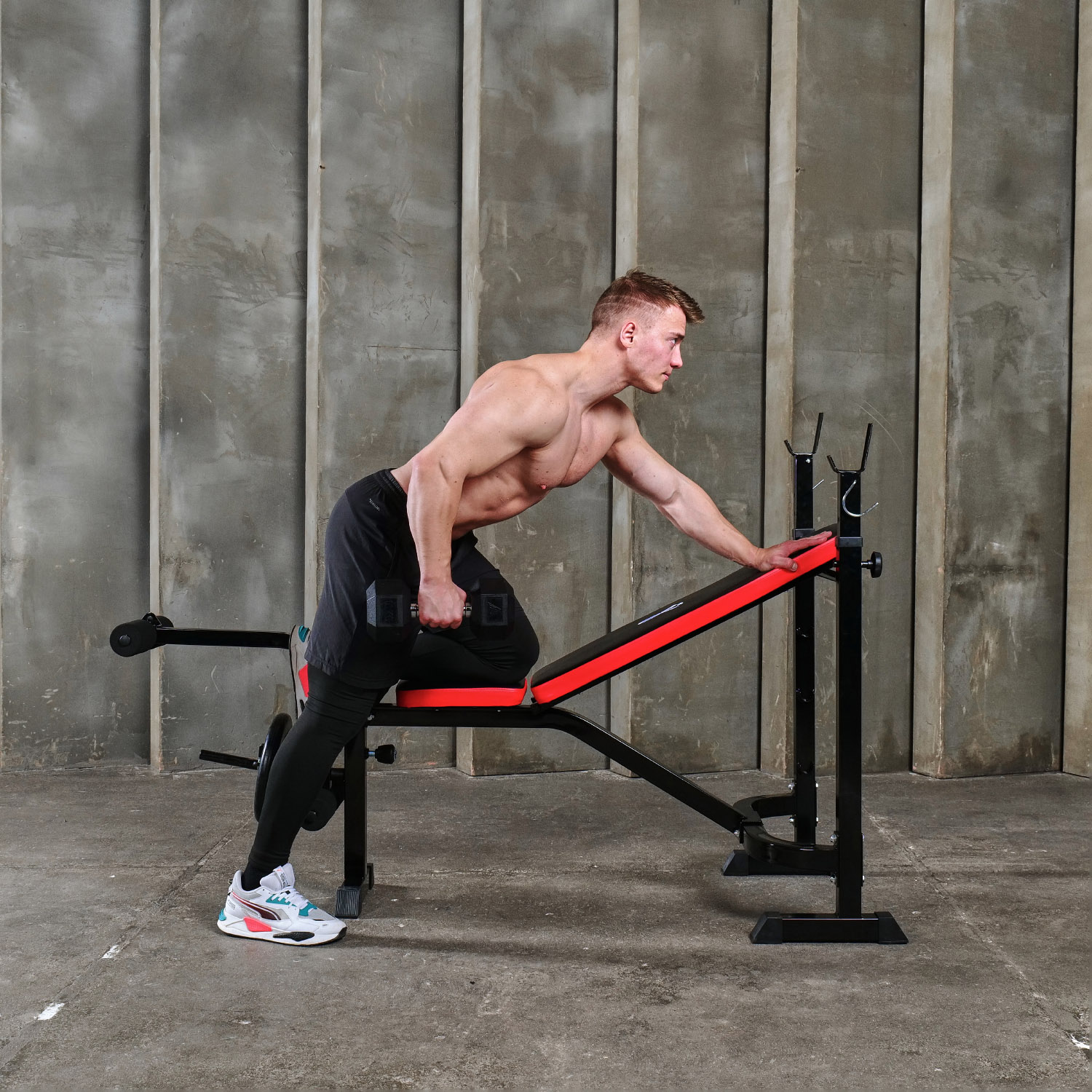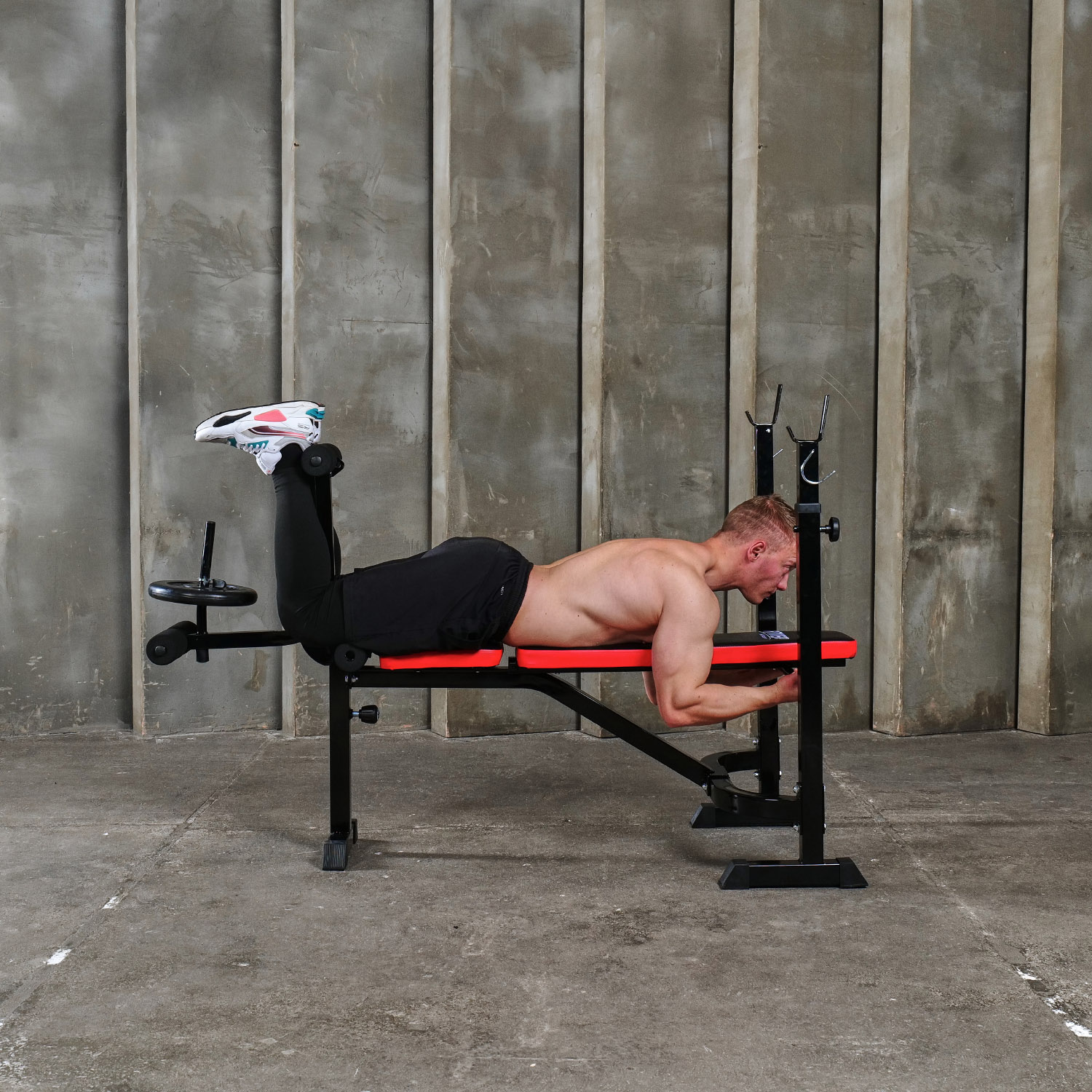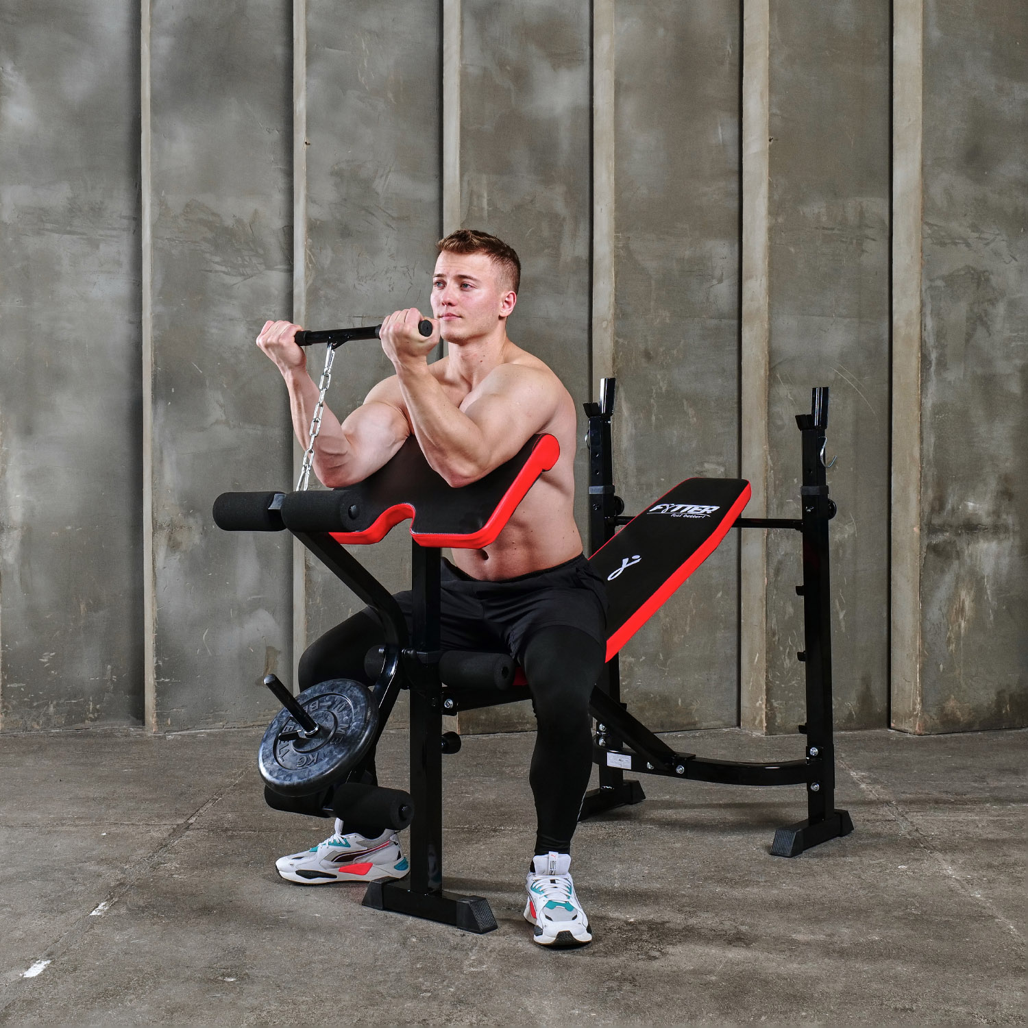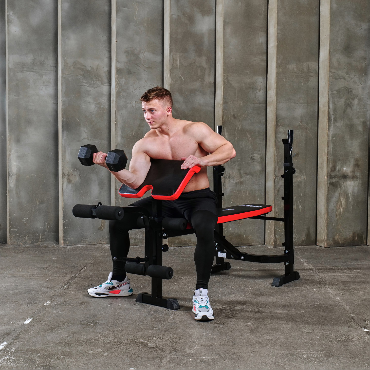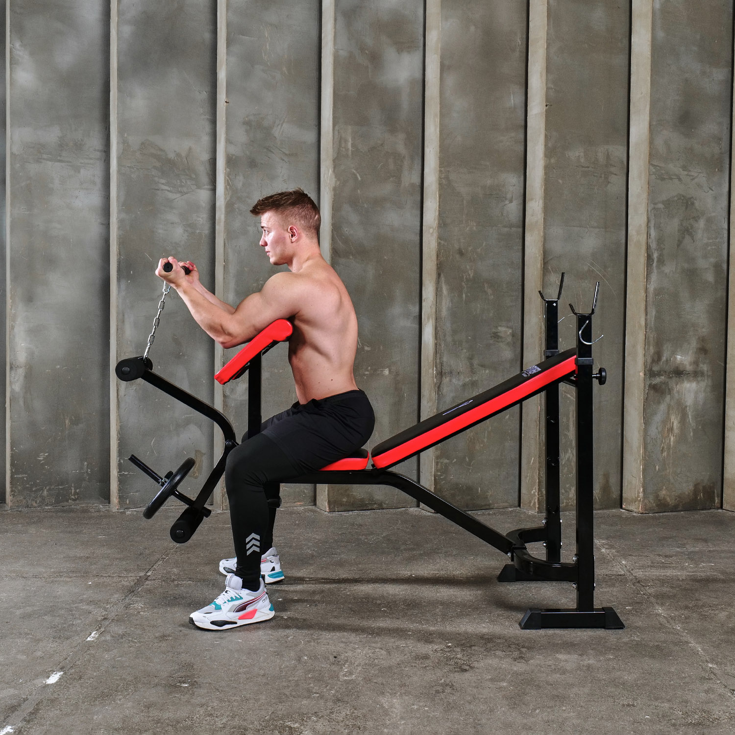 Профиль рамы изготовлен из прочного и надежного материала - стали 50x50x1.5 мм, что обеспечивает долговечность и надежность скамьи. Валики для выполнения жима также могут быть утяжелены с помощью дополнительных дисков для увеличения интенсивности тренировки.