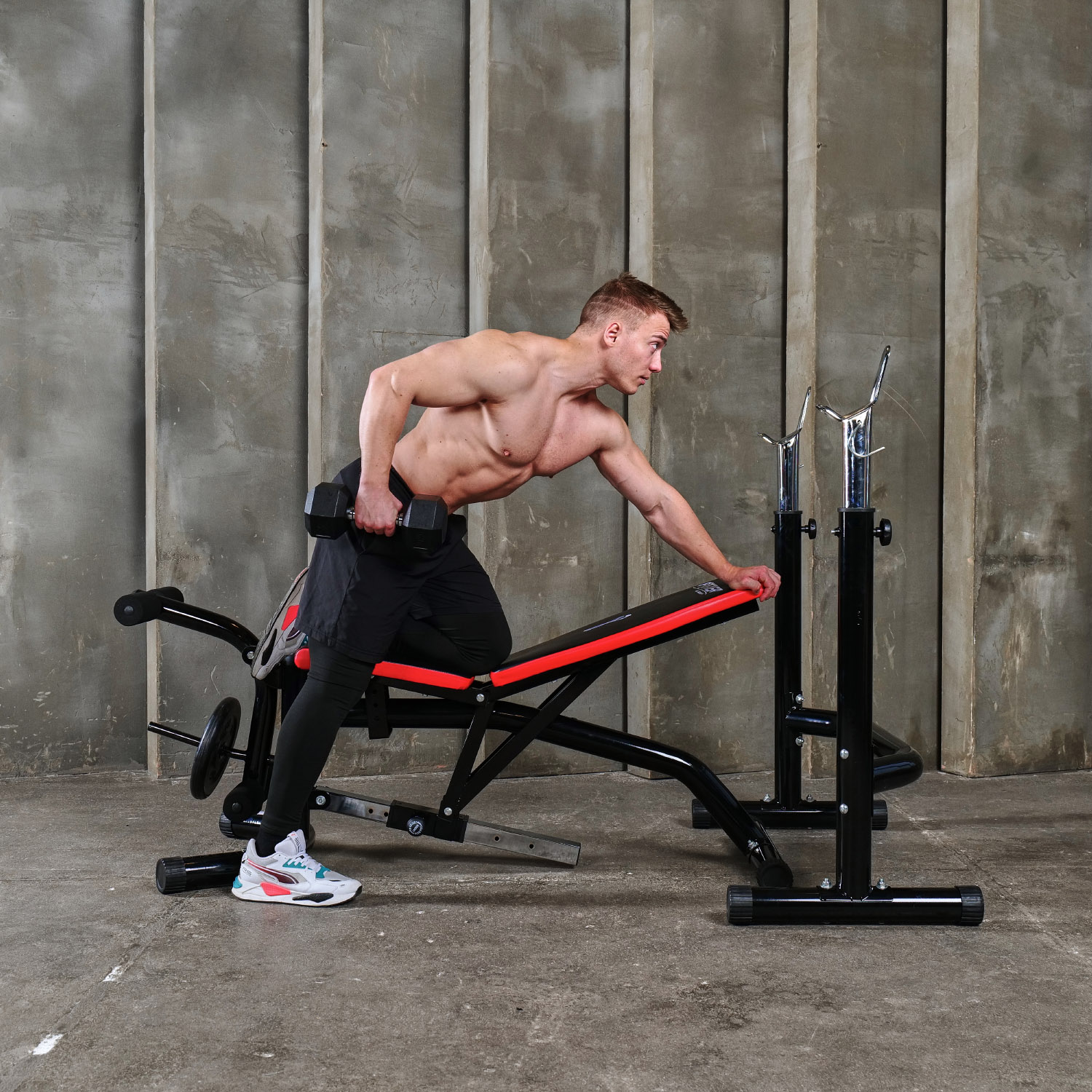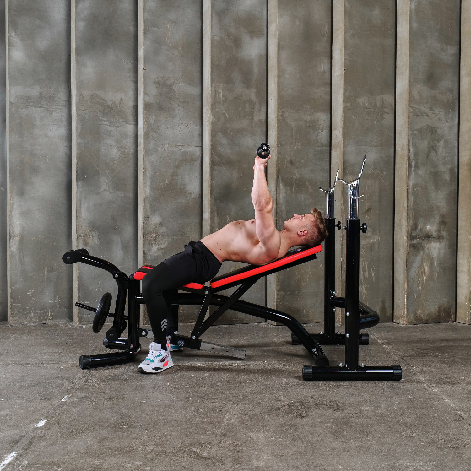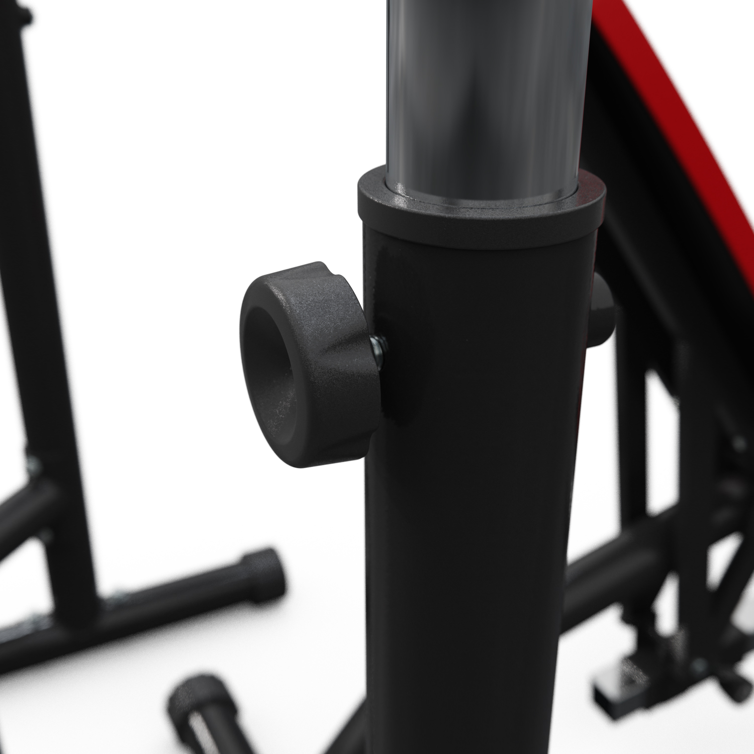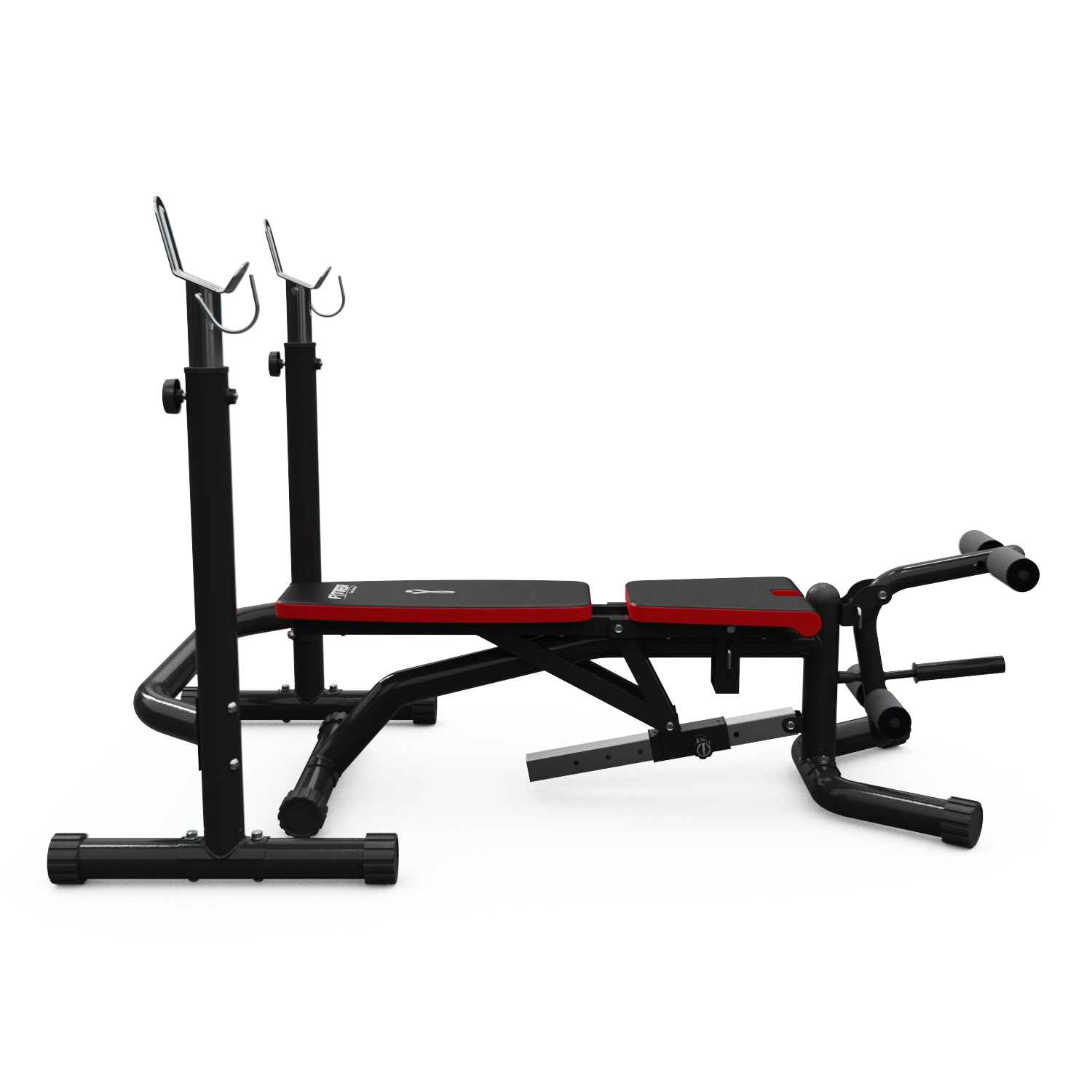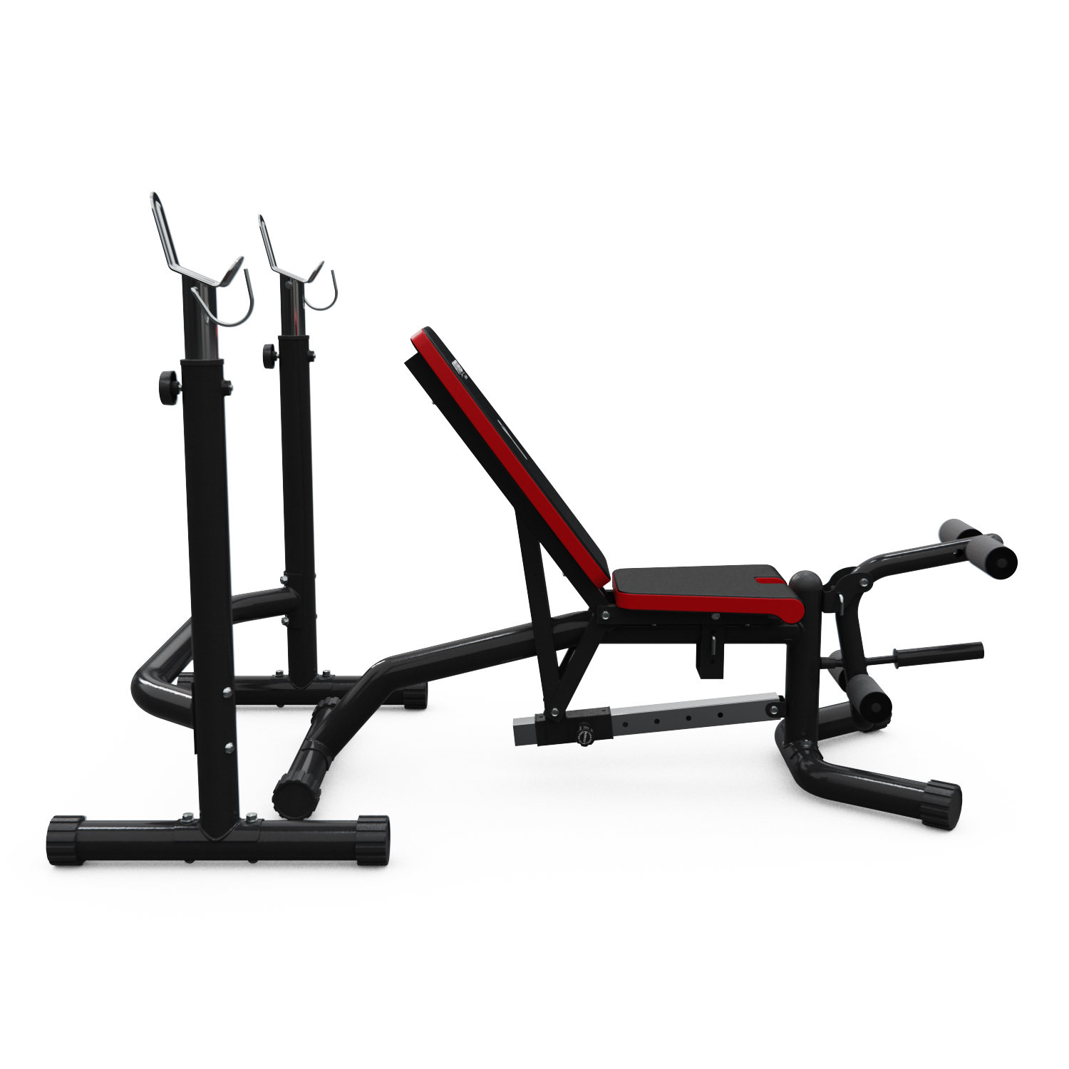 – Стойки: регулируются по высоте от 123 до 137.5 см, что позволяет выполнять упражнения с разными видами штанг и гантелей.