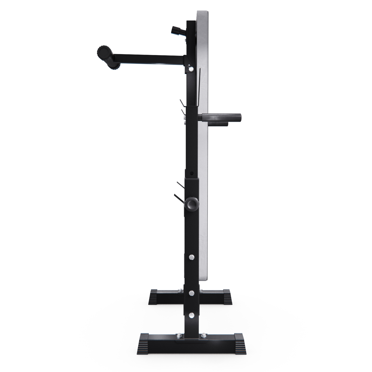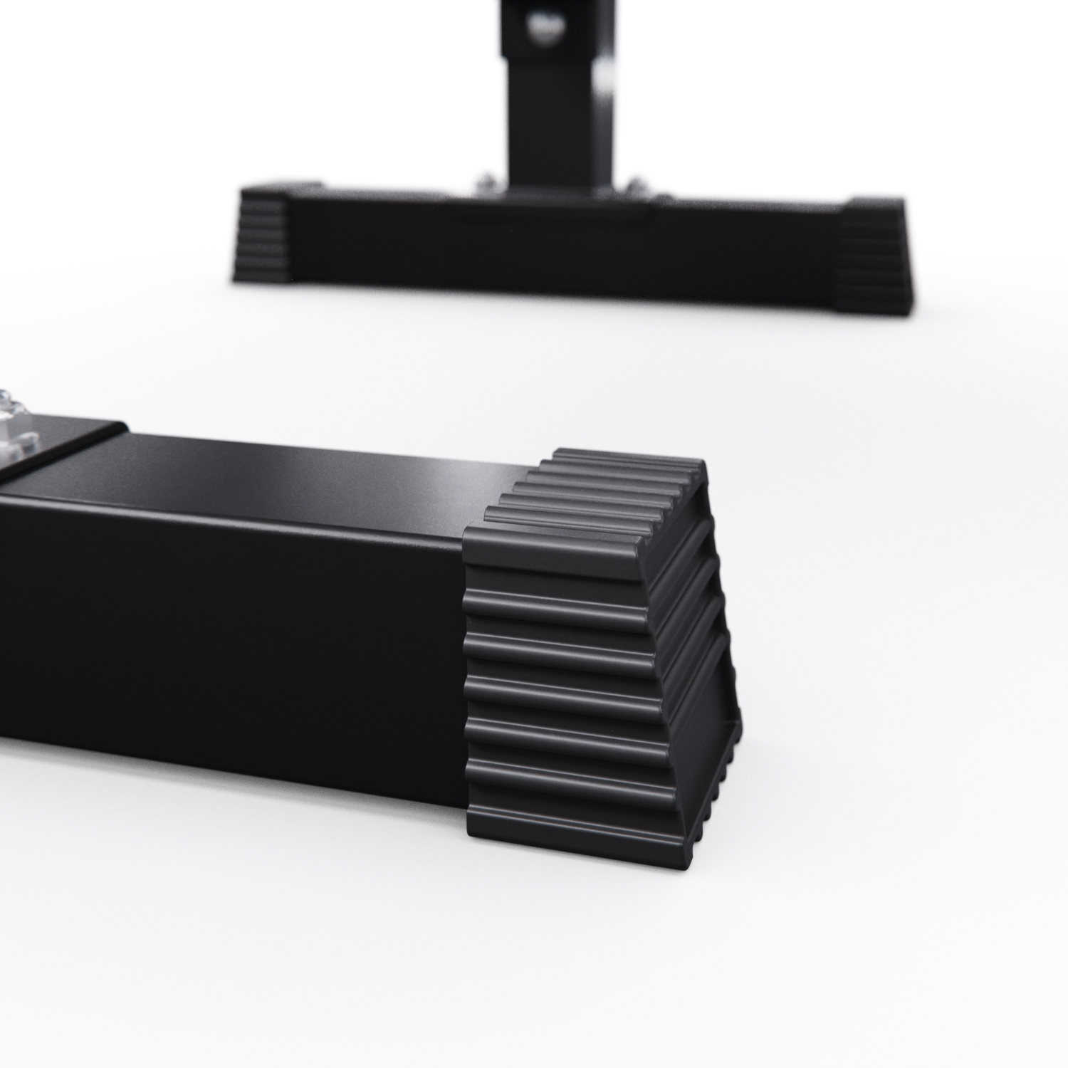 Скамья представляет собой единую складную конструкцию с основанием, обтянутым нескользящей тканью благородного серого цвета. У изголовья расположены две стойки с регулируемой высотой и двумя держателями. Верхний держатель штанги имеет ширину 62,5 см. Максимальная нагрузка на верхний держатель — 120 кг, на нижний — 100 кг. На задней части стоек есть ручки для упражнений на руки. На ножках имеются противоскользящие валики и компенсаторы неровности пола.