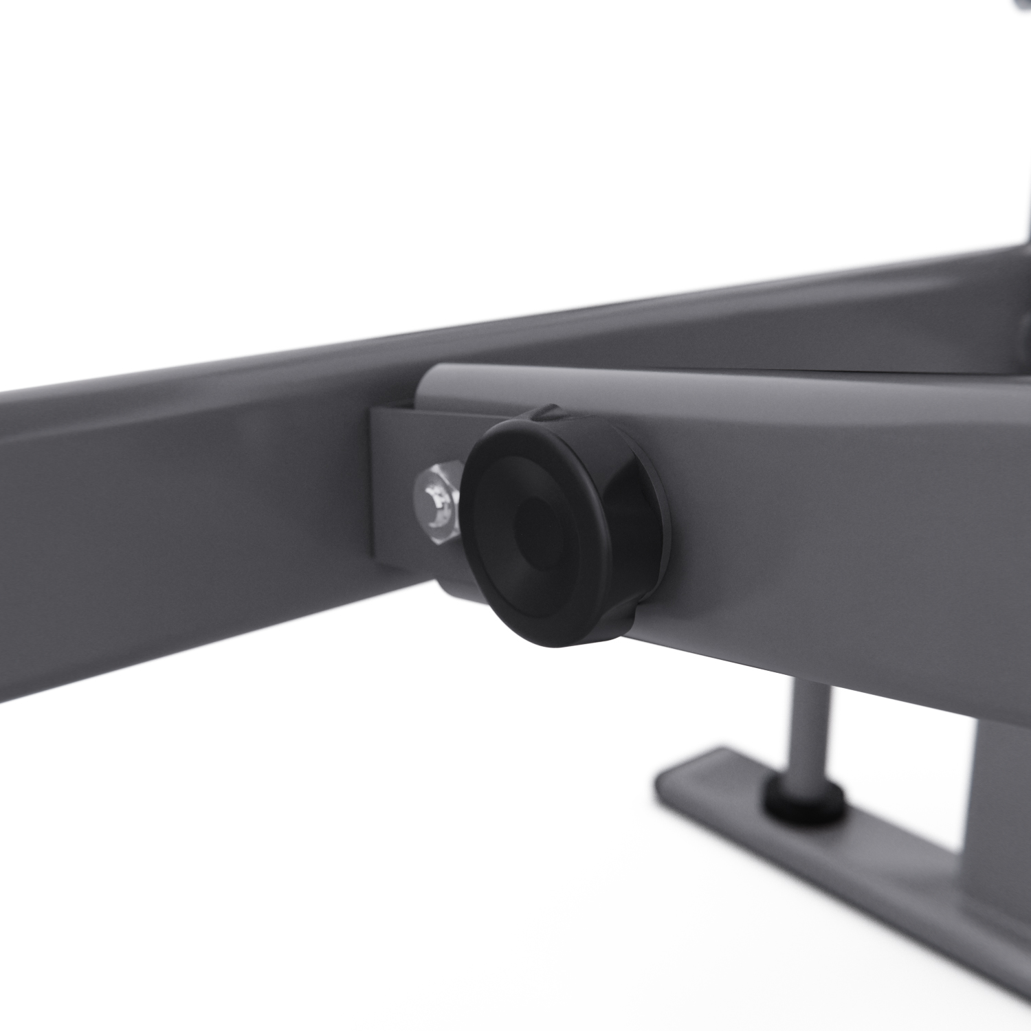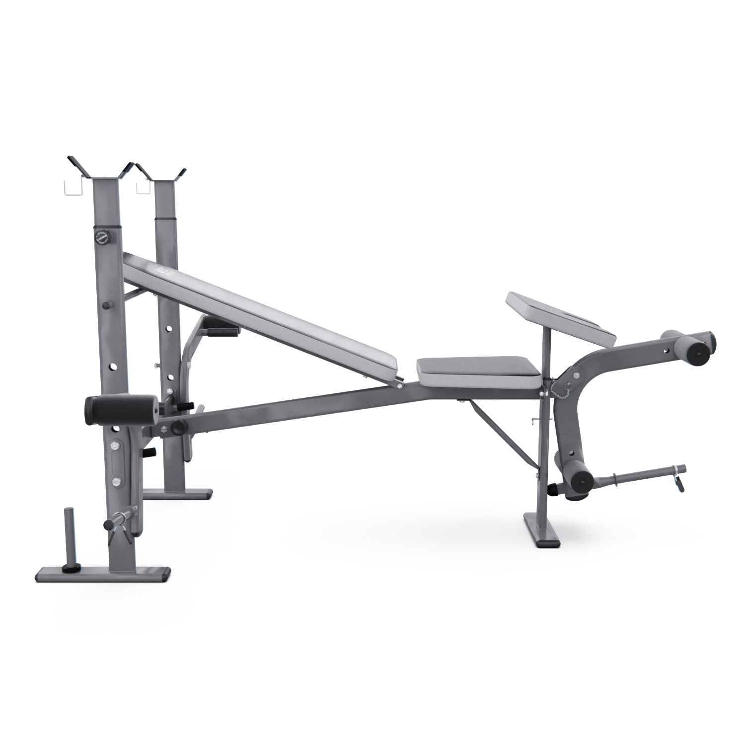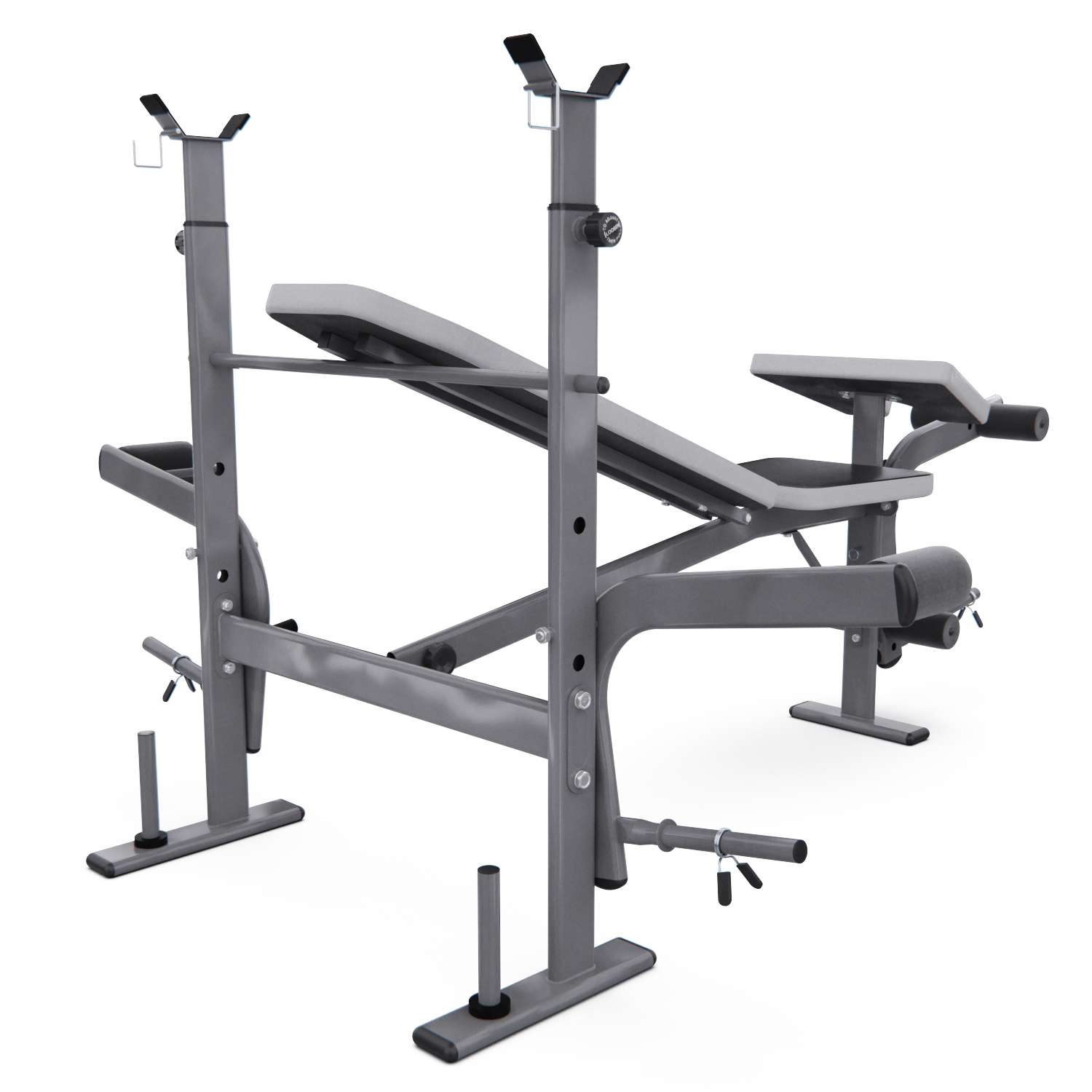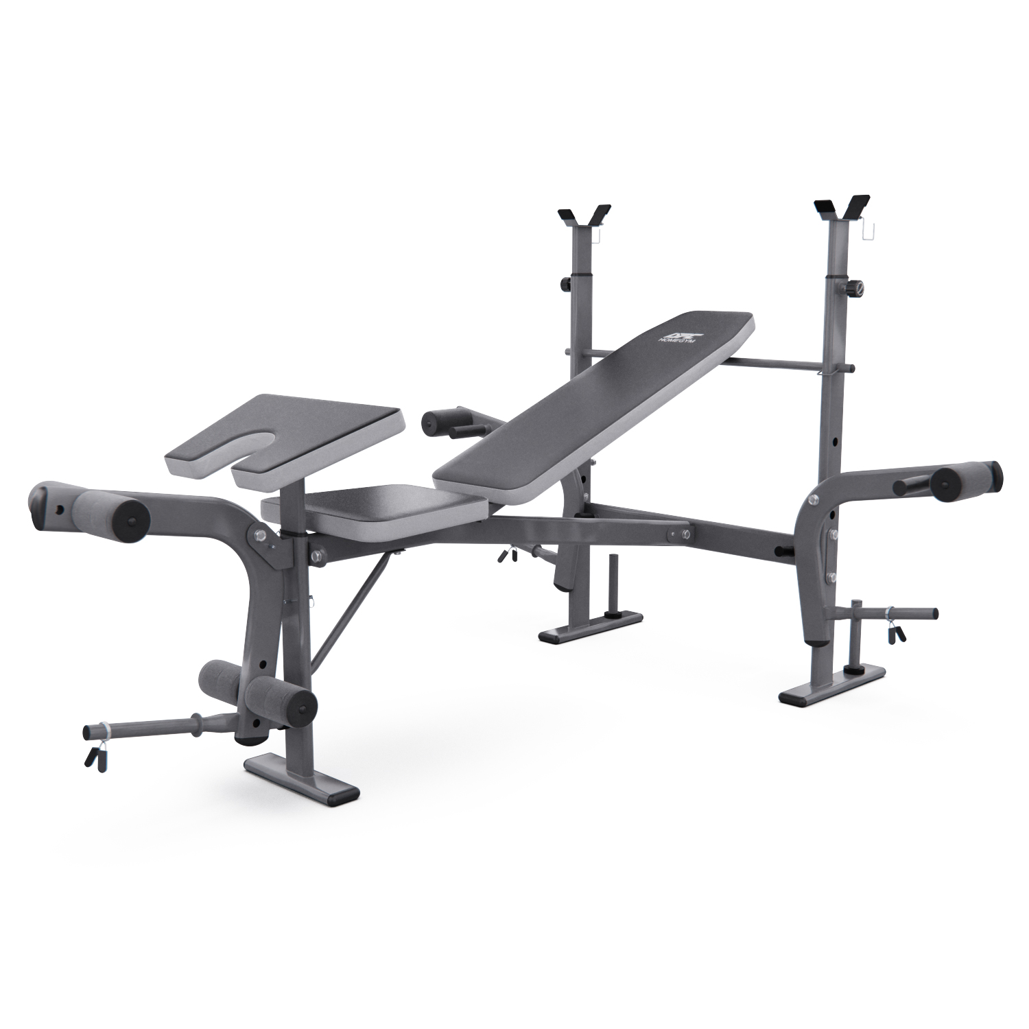 Максимальная нагрузка на стойки для штанги равна 100 кг, а расстояние между стойками 76 см. Скамья также оснащена ручным рычагом с максимальной нагрузкой до 40 кг и нагрузкой на рычаг для валиков до 80 кг. Весовые пластины не входят в комплект, но их можно приобрести отдельно.