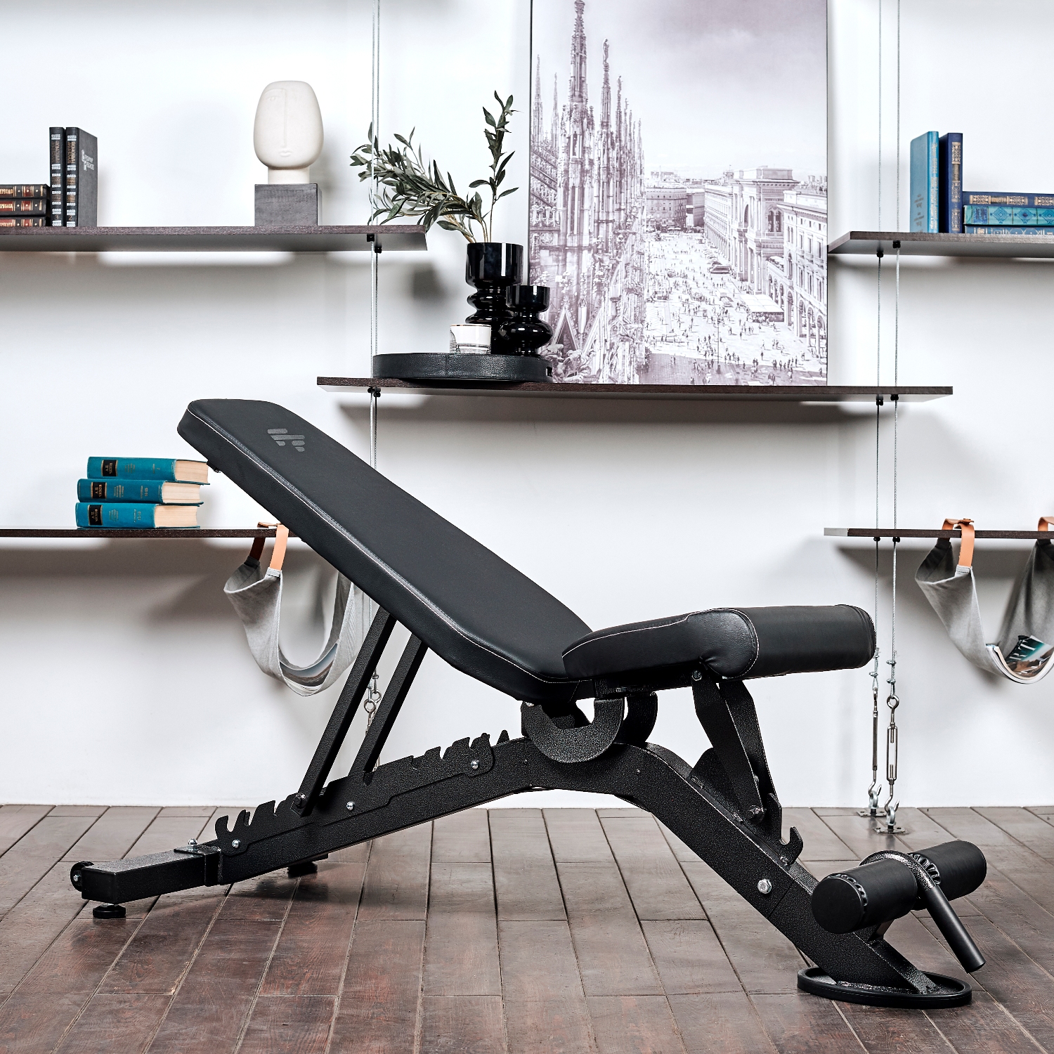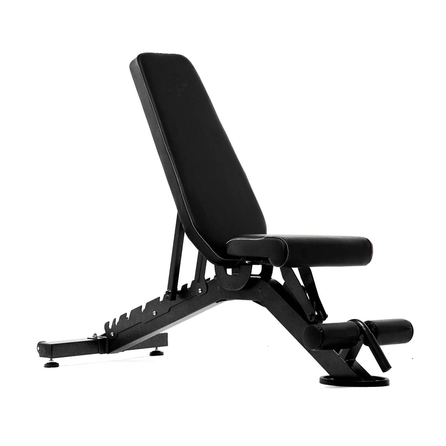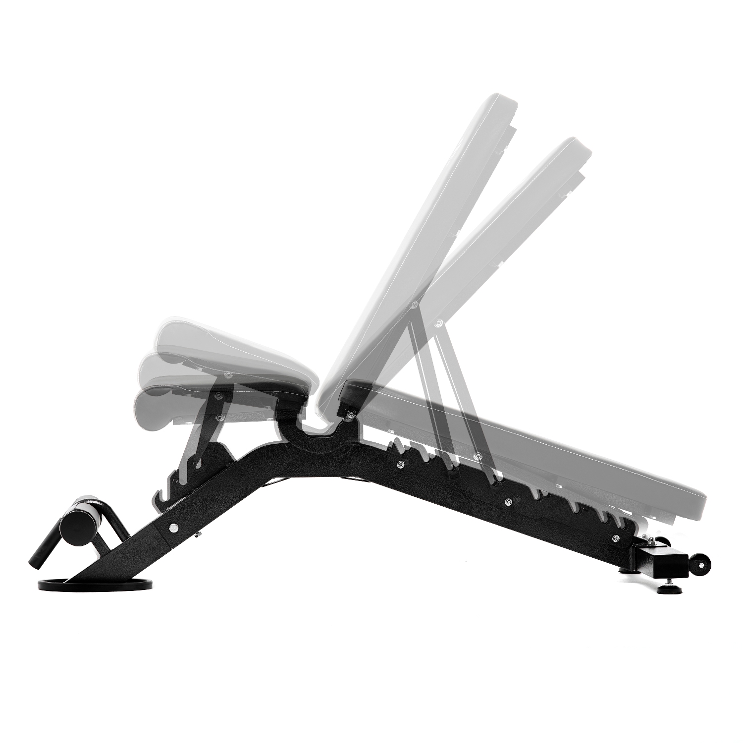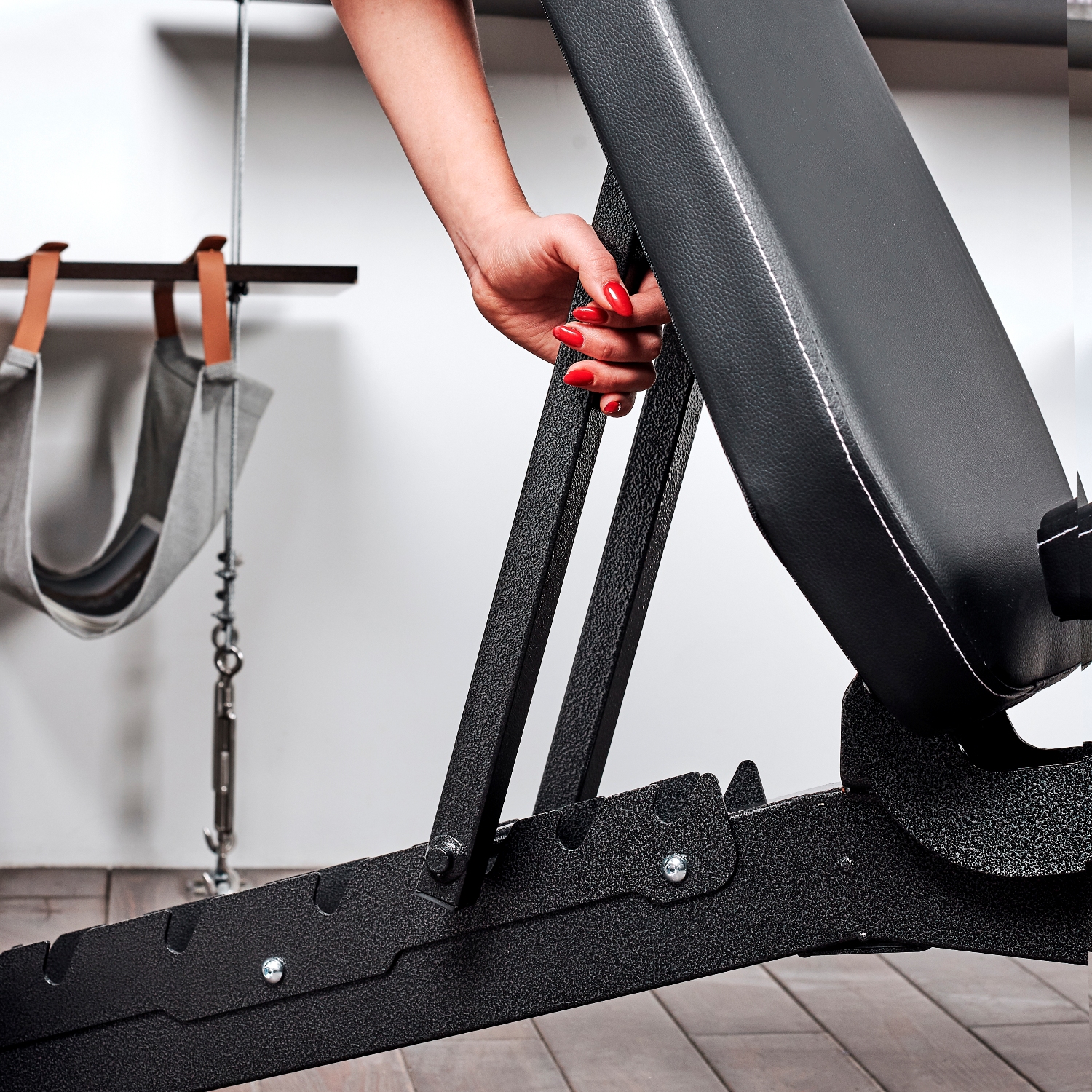 Спинка и сиденье скамьи регулируются. Спинку можно зафиксировать в 8 положениях — от -15 до 90 градусов. Фиксируется она при помощи упора на обратной стороне. Поменять положение легко, приподняв спинку и установив упор в нужном месте. Сиденье фиксируется в 4 положениях, которые подходят для выполнения разных упражнений. В передней части скамьи имеются валики в мягкой обивке для фиксации ног.