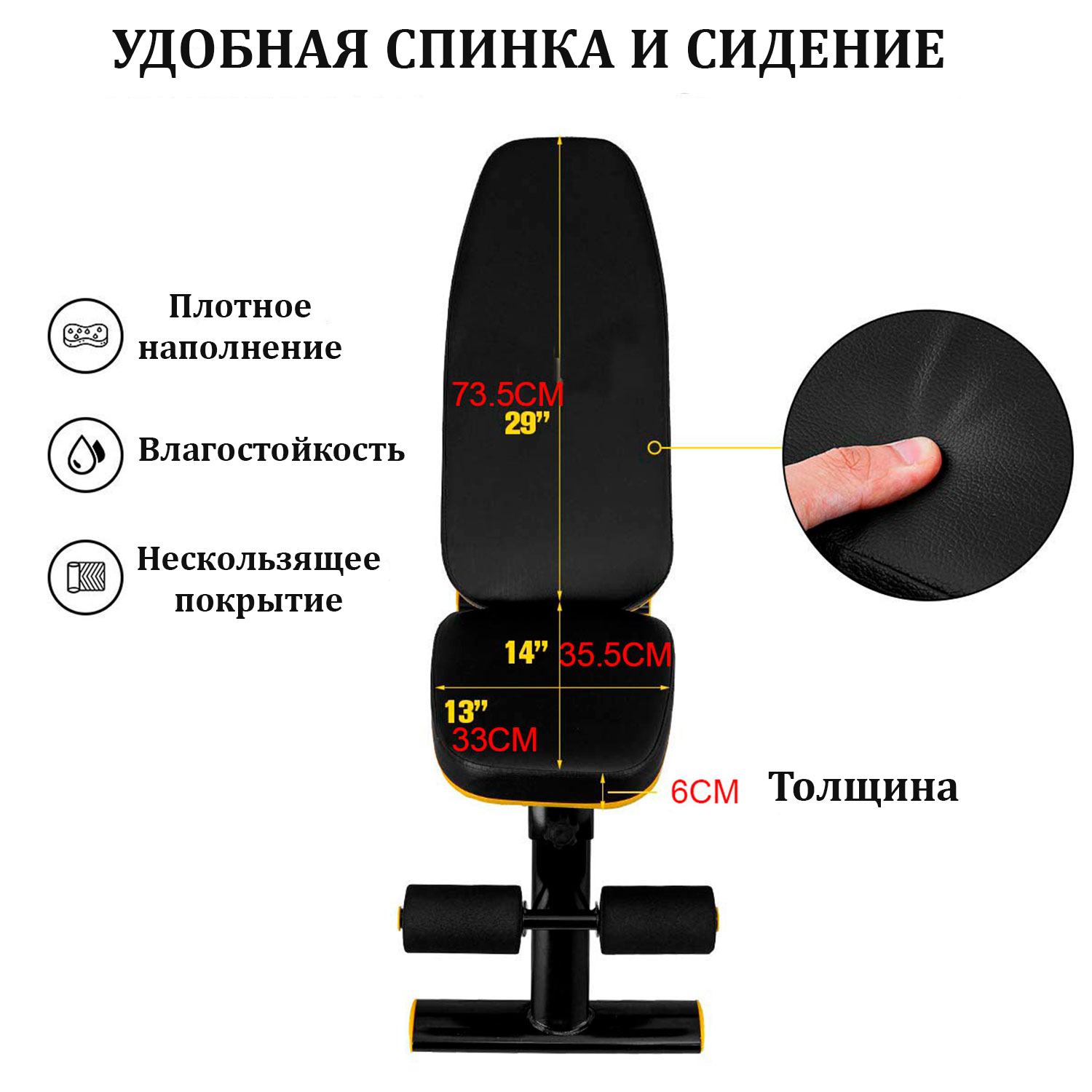 Мягкое сидение с наполнителем высокой плотности, выдерживает большую нагрузку и поможет снизить мышечную усталость во время тренировки. Противоскользящее покрытие скамьи сделает ваши тренировки более комфортными, а водонепроницаемая ткань позволит сохранить тренажер в изначальном виде длительное время.