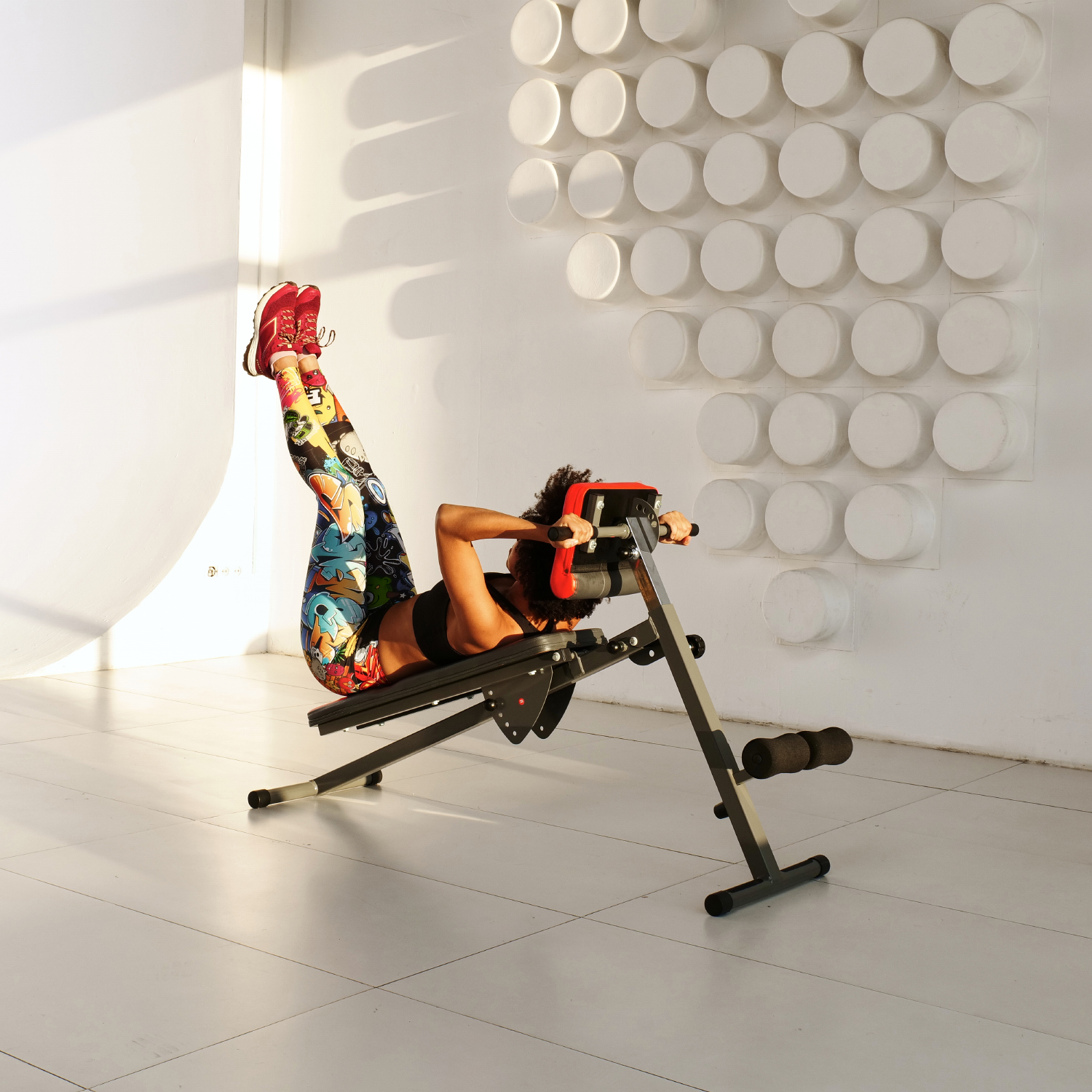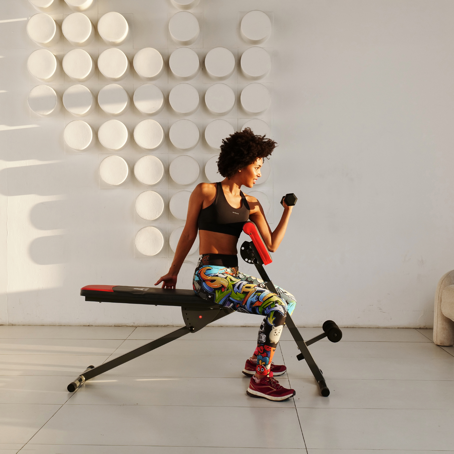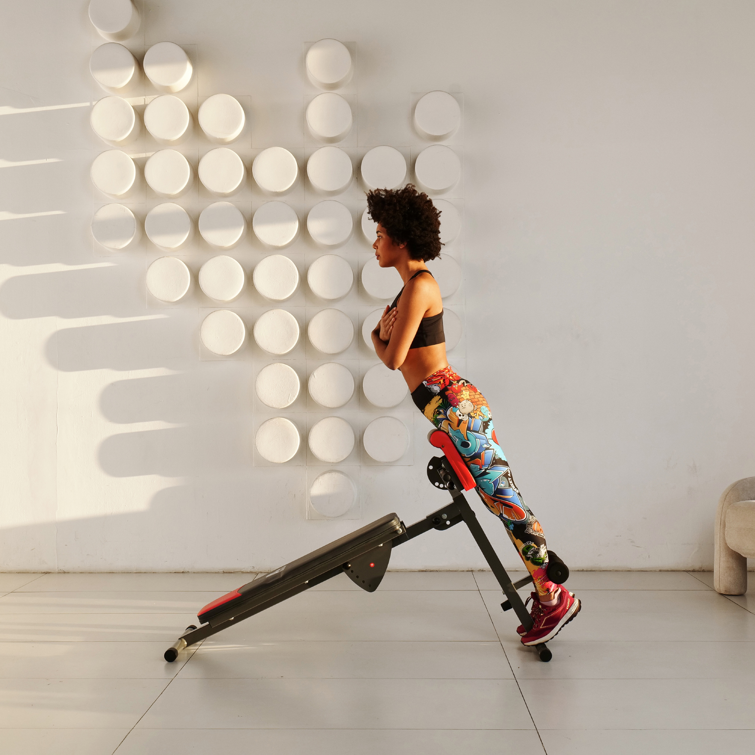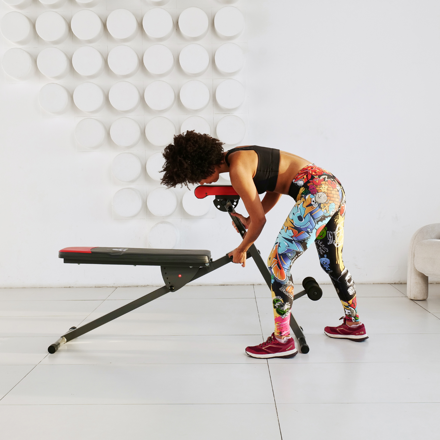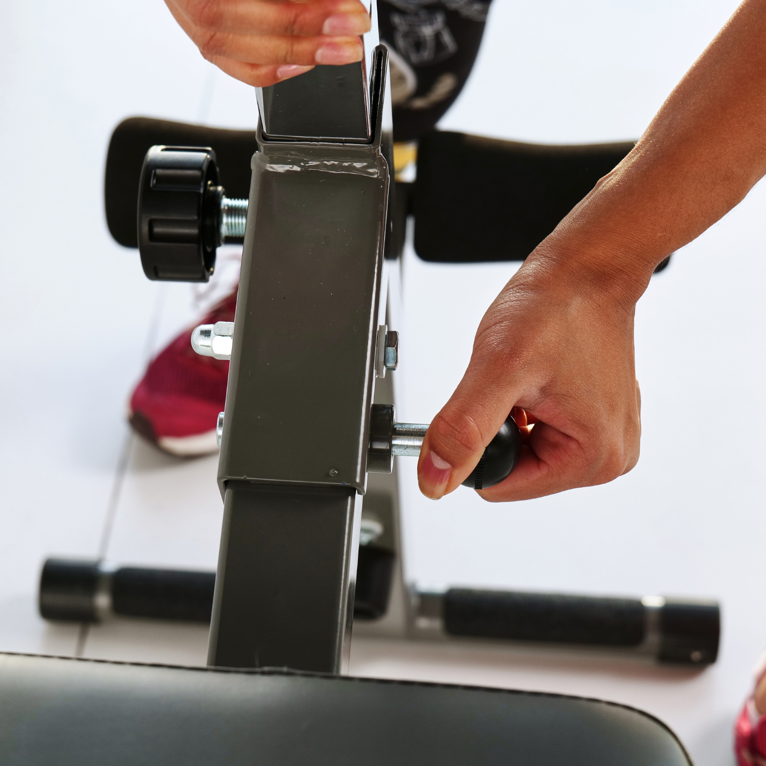 Складная конструкция скамьи позволяет сэкономить место при хранении и транспортировке. Общую нагрузку на скамью можно установить до 120 кг, что делает ее безопасной для использования.