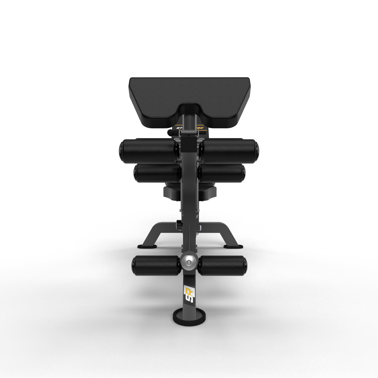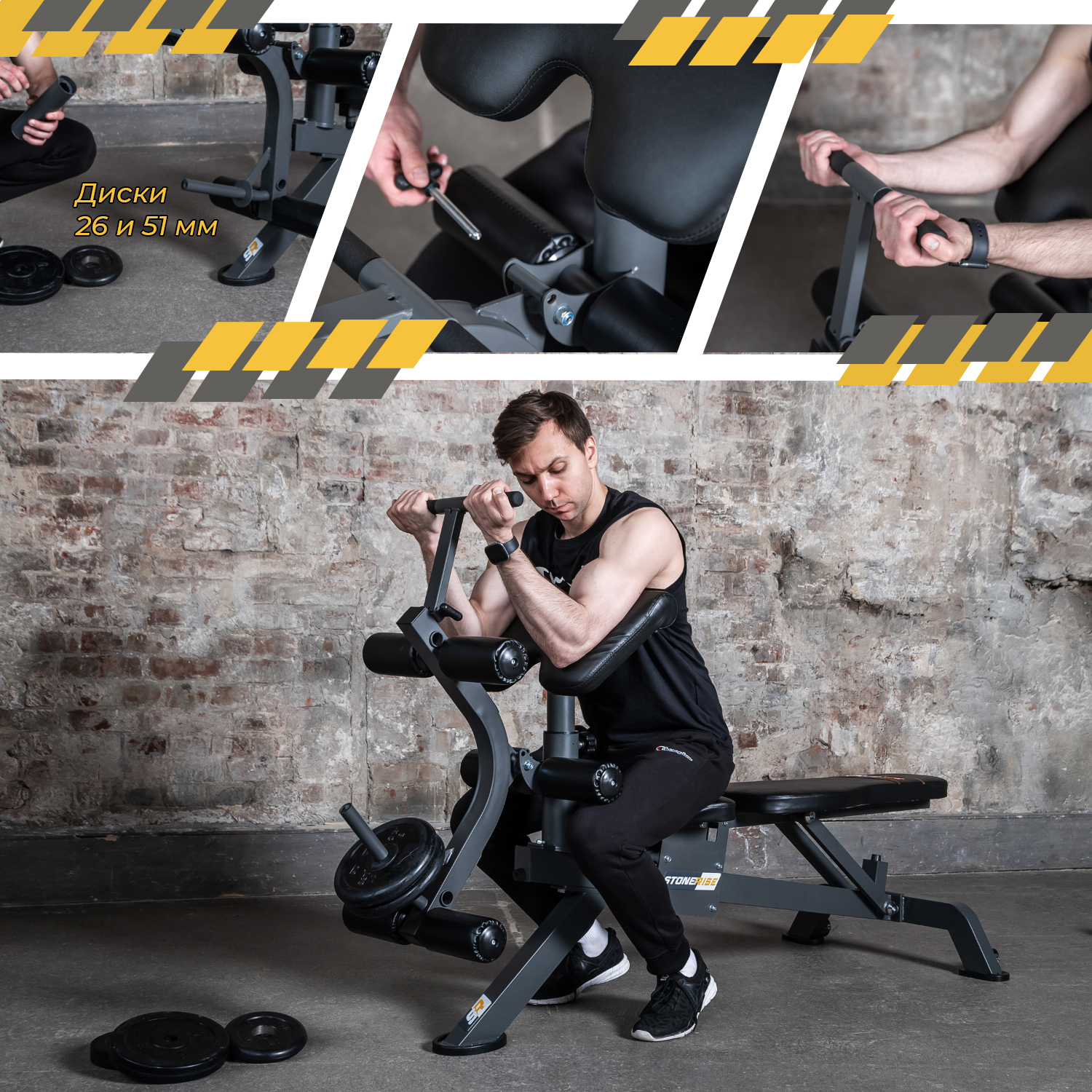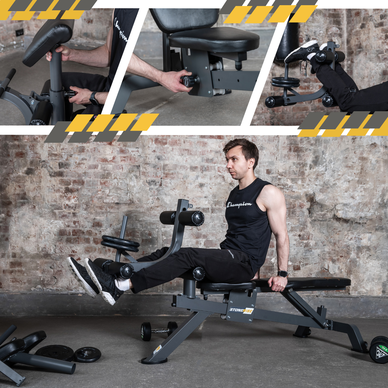 Скамья универсальная STONERISE ThunderShape. Благодаря множеству функций, она является многофункциональным тренажёром на все группы мышц: от ног, в прокачке которых помогут регулируемые валики, до рук, развить которые поможет парта.