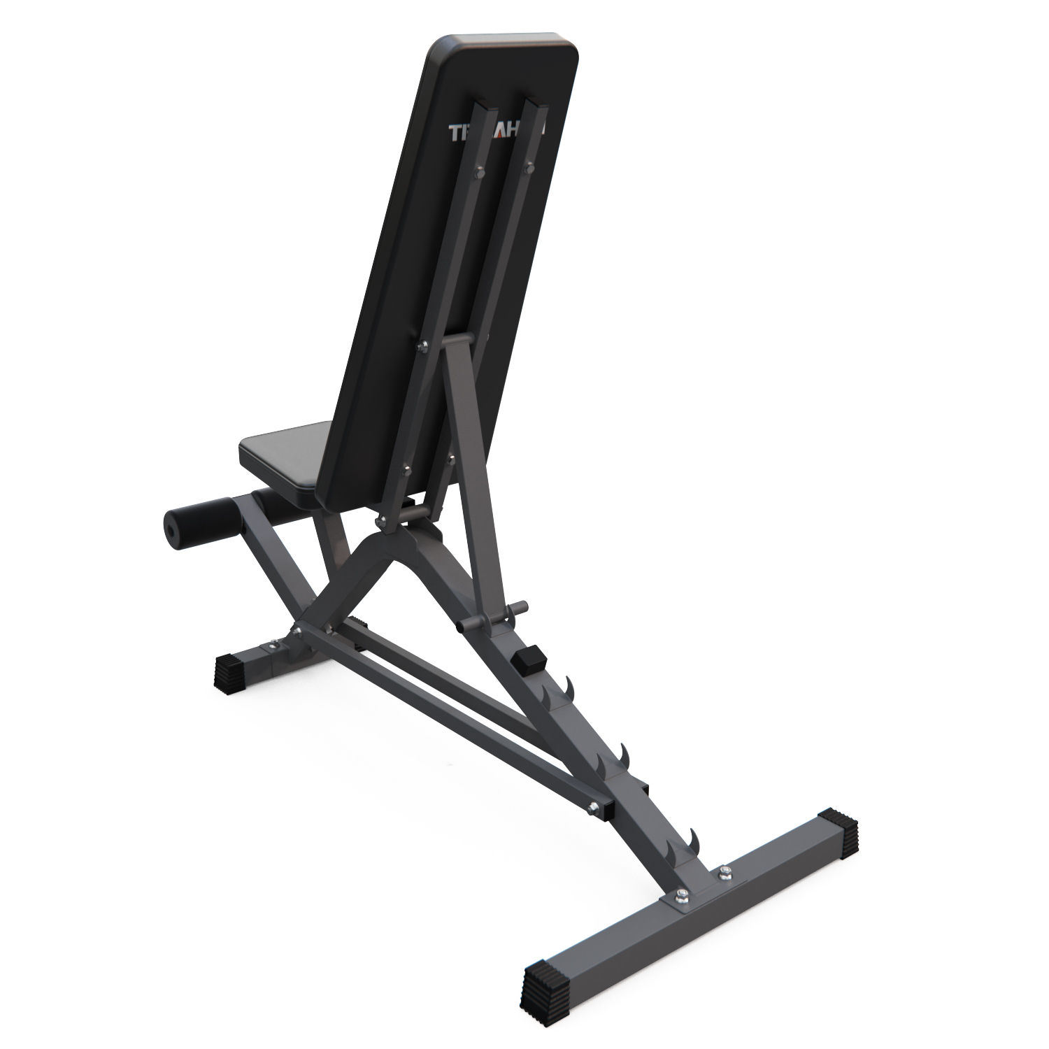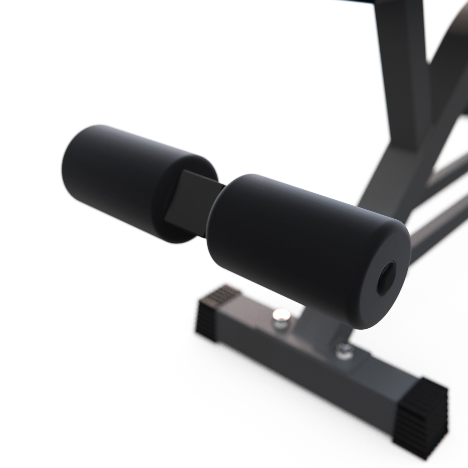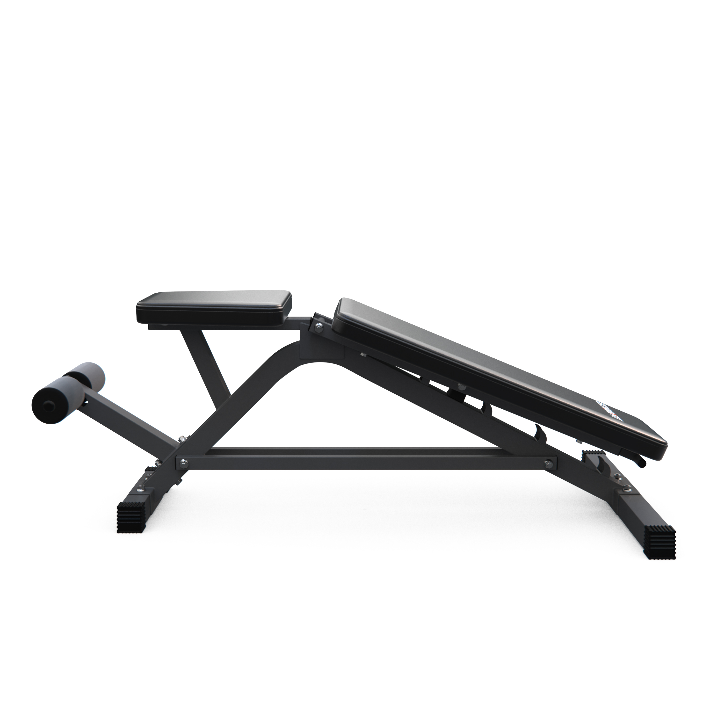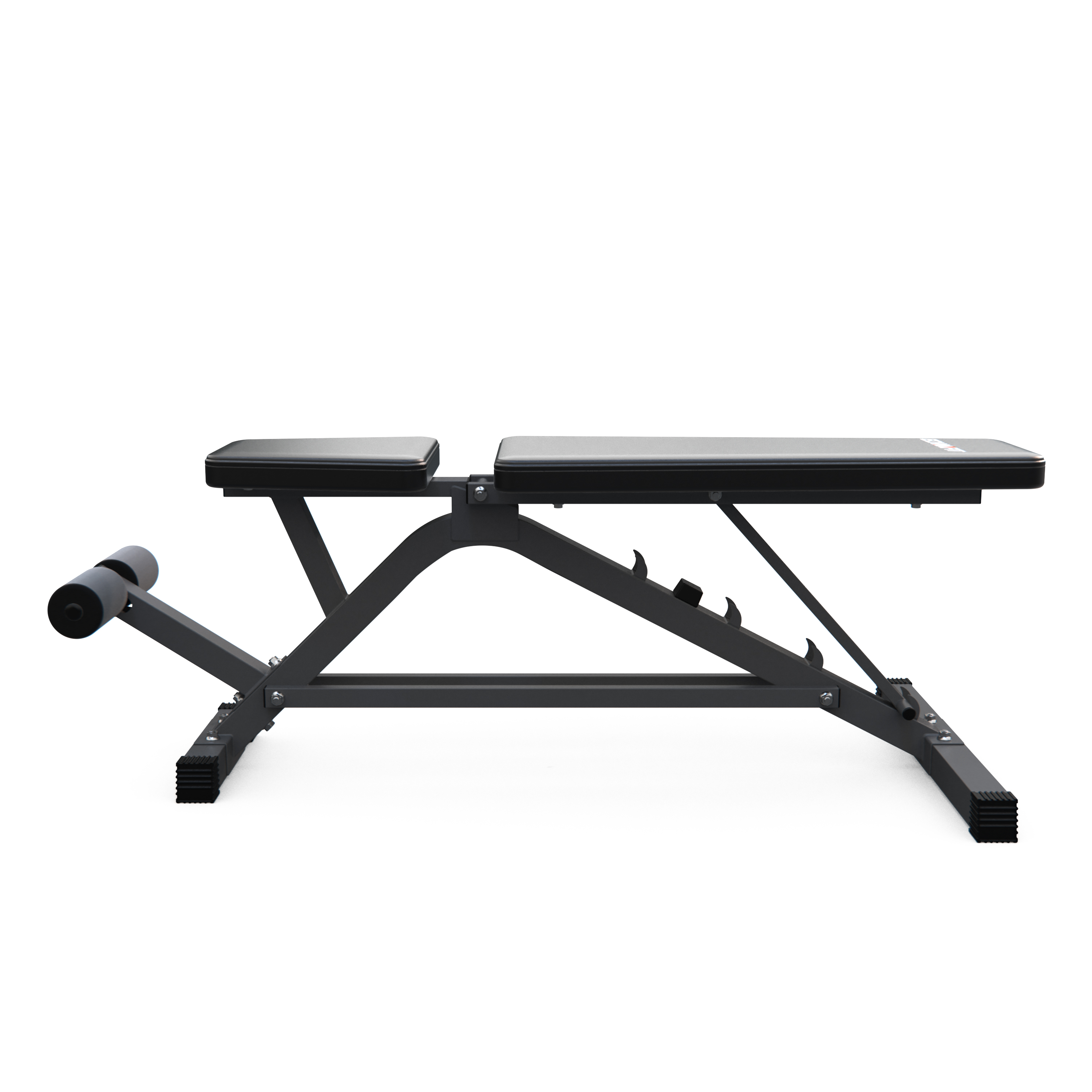Спинка регулируется на 5 уровней от -20° до 90°. Разнообразие положений позволяет выполнять разные виды жима, прокачивать бицепсы и мышцы брюшной полости. Скамья дополнительно оснащена валиком для ног диаметром 7,5 см и длиной 13,2 см, регулируемым на 2 уровня с надежной фиксацией и креплением для гантелей.