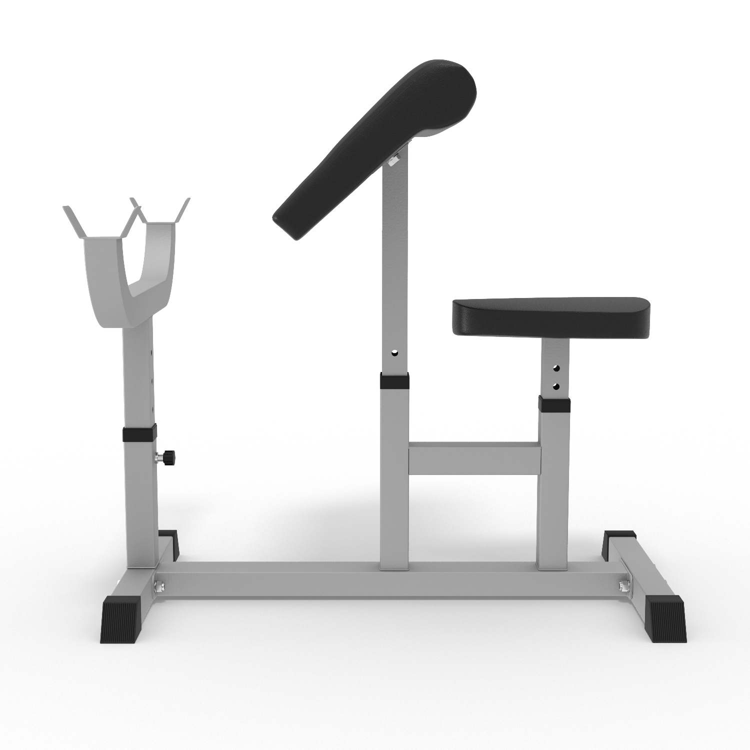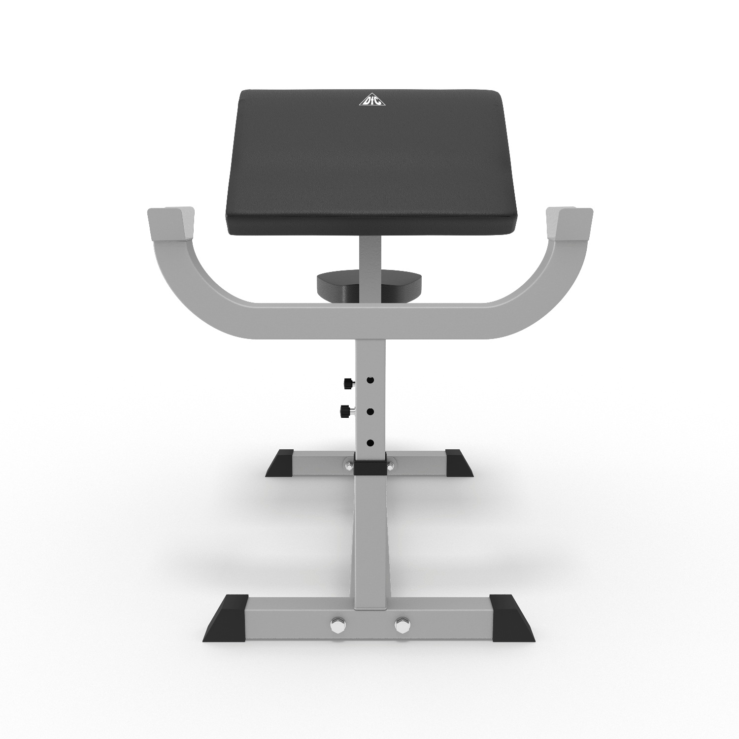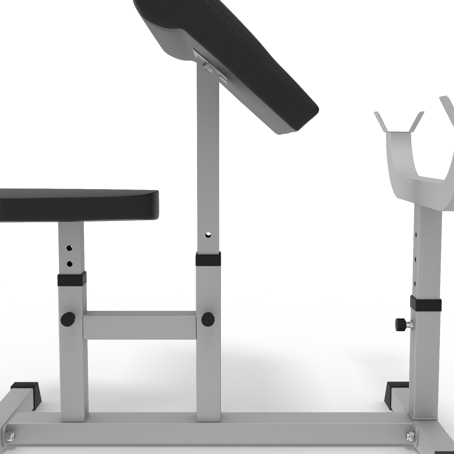 Сиденье, парта для бицепса и стойки под штангу регулируются по высоте.