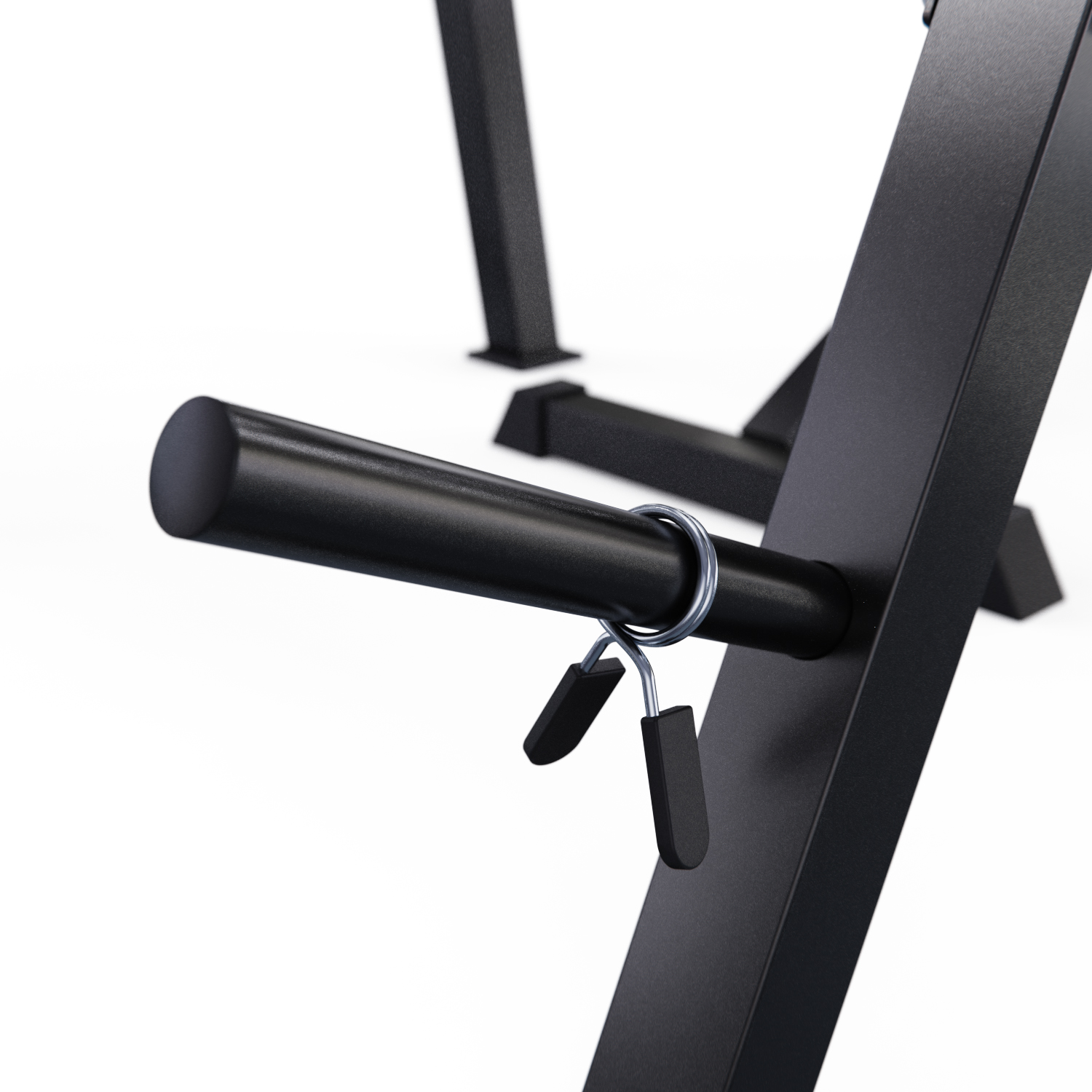 Скамья для жима имеет посадочное место для хранения дисков 25 мм. Длина посадочного места равна 20 см, а в комплекте идут 2 пружинных замка.