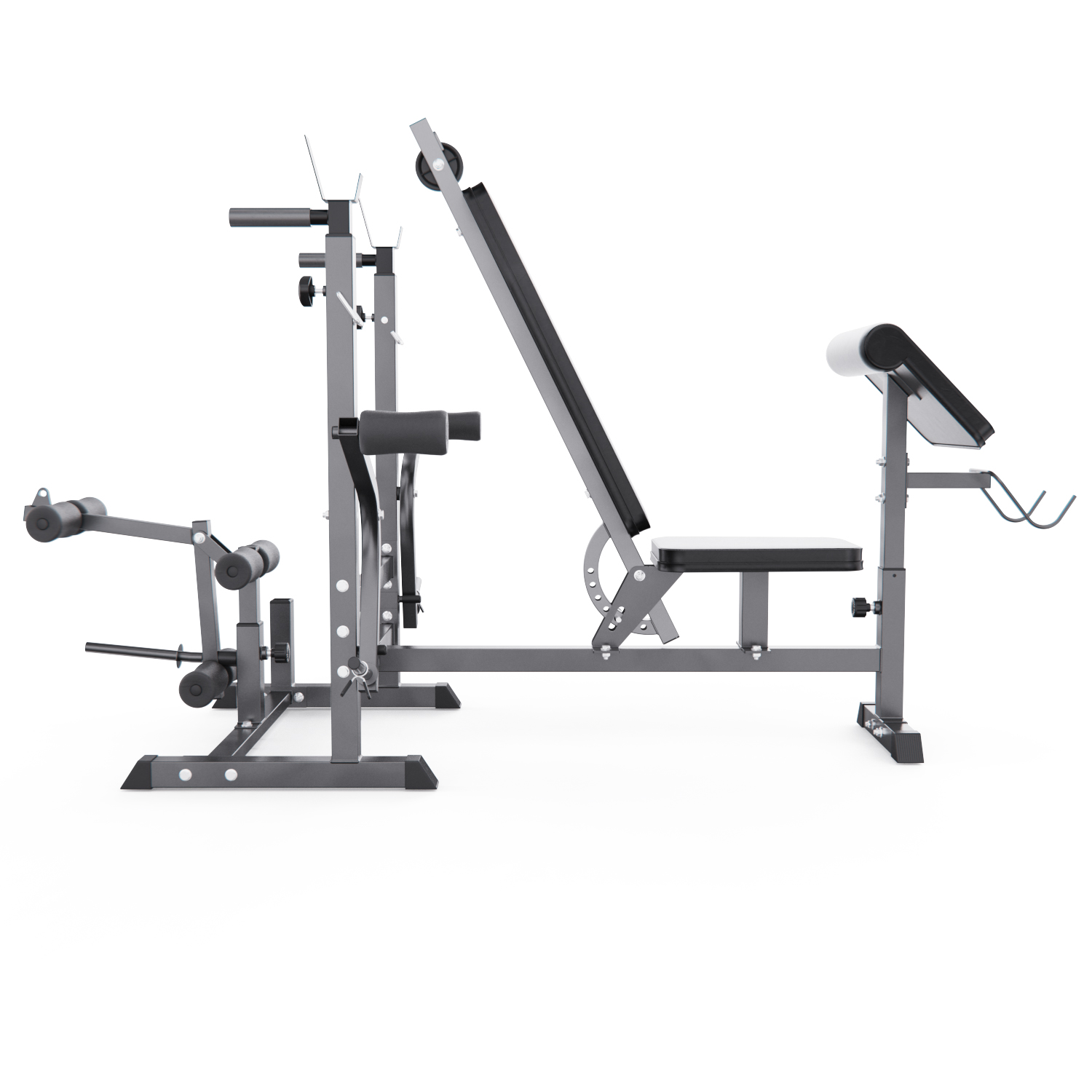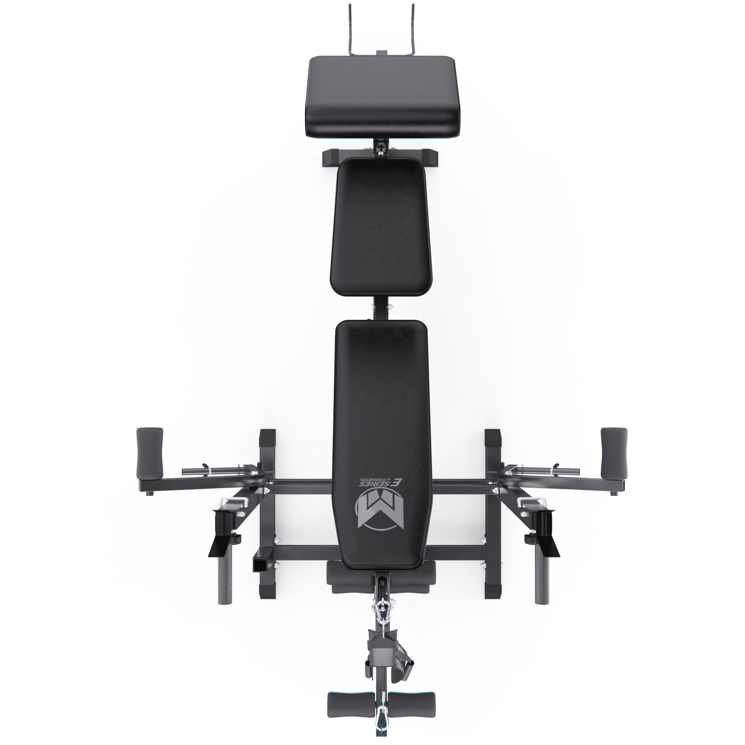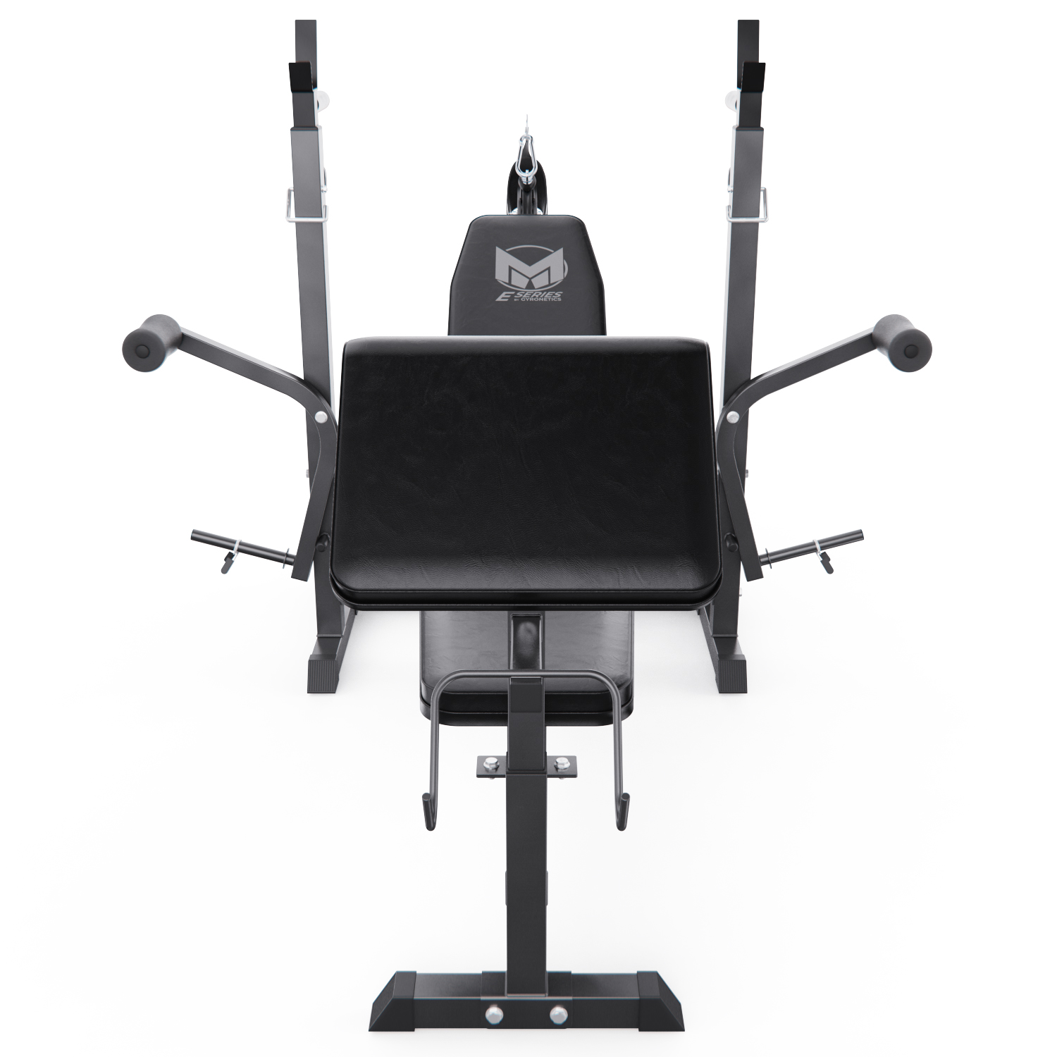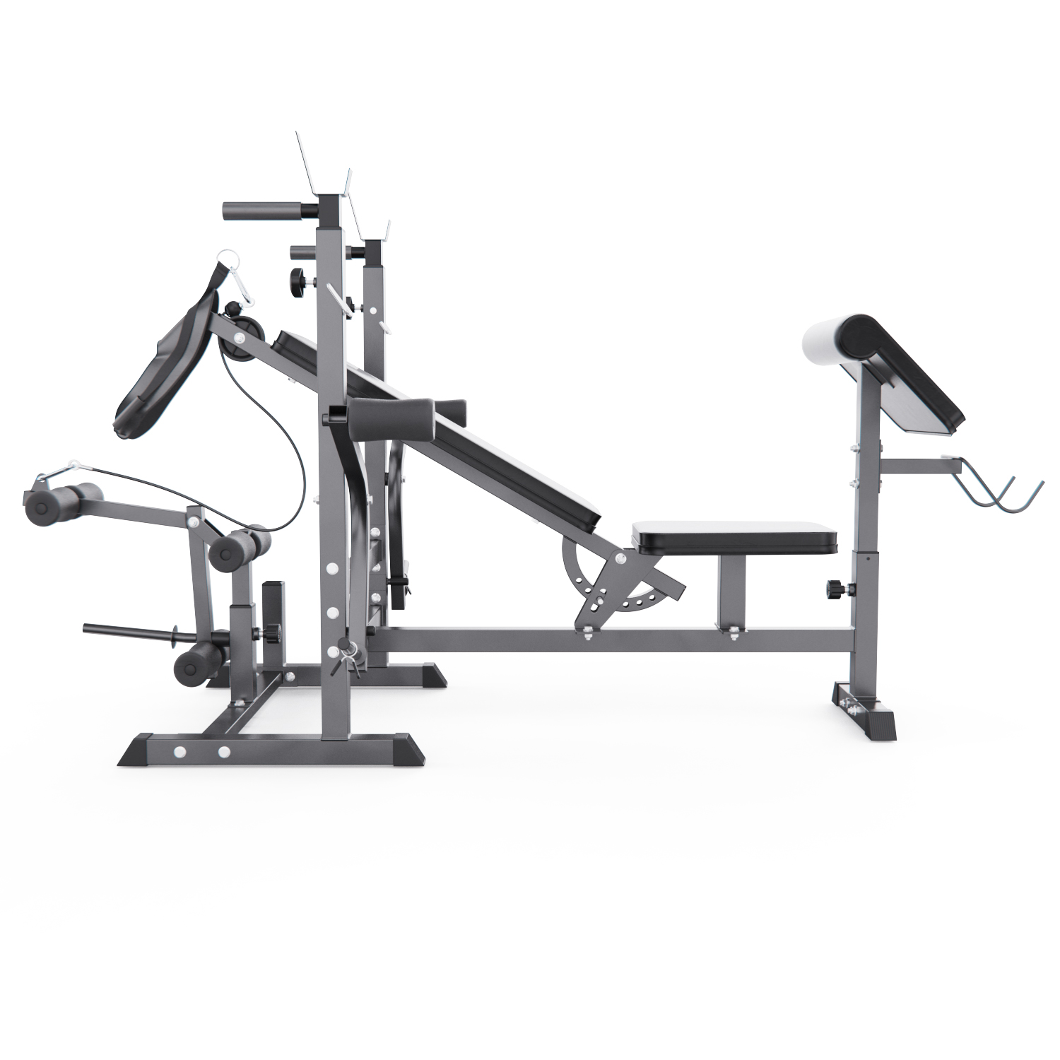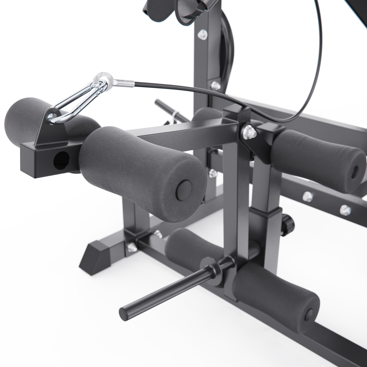 Скамья для жима включает в себя ручные рычаги-бабочки для проработки грудных мышц, кабель для жима на трицепс, поручни для отжиманий на брусьях. Всё это делает тренировки более функциональными и вариативными, не выходя из дома.